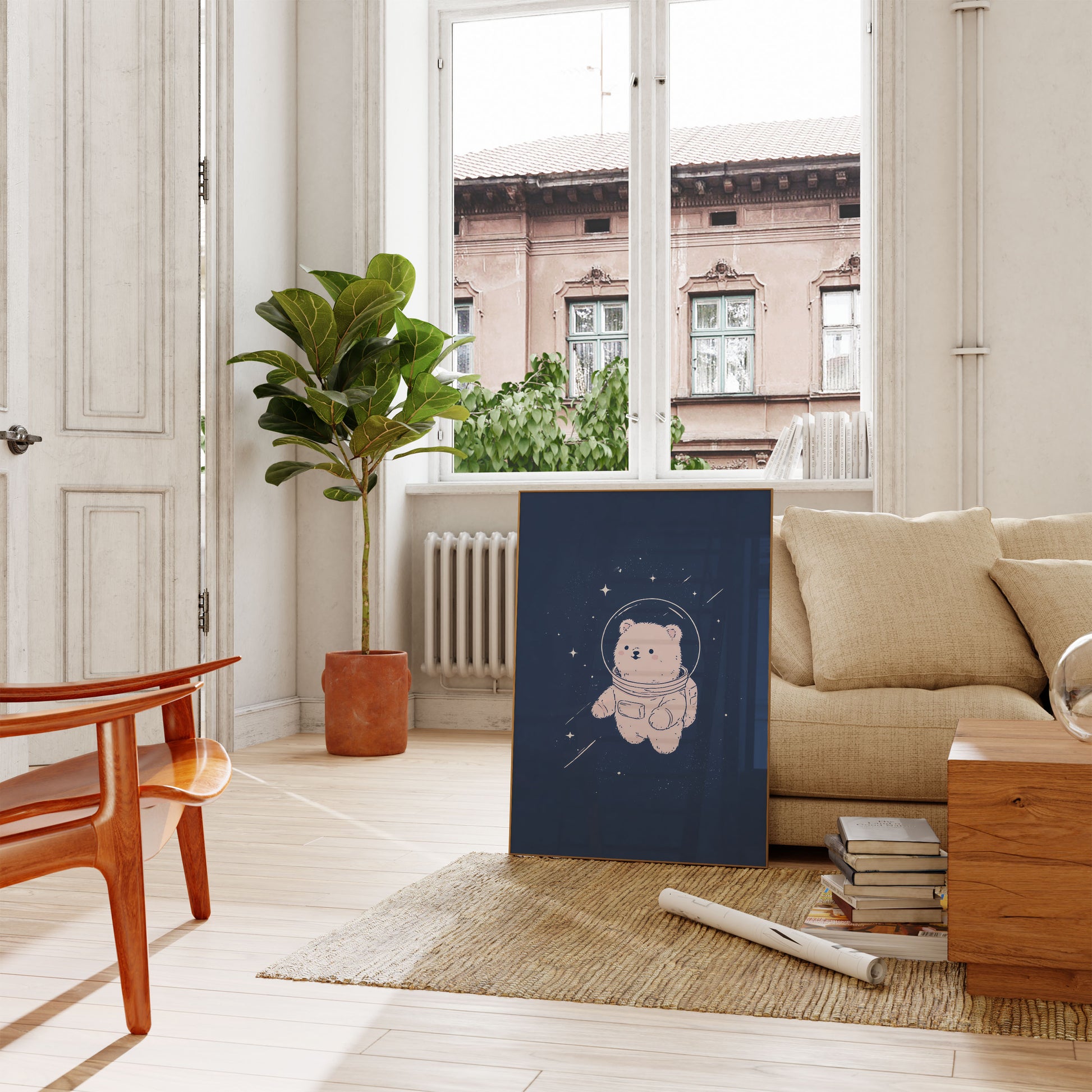 Drift into a dreamy cosmic journey with this charming illustration of a fluffy polar bear astronaut floating peacefully through a starry navy blue universe. Soft pink and white tones bring a gentle, playful energy to this delightful space-themed artwork, perfect for nurseries, children's rooms, or anyone who loves cute cosmic adventures. The cuddly bear in a snug spacesuit, surrounded by twinkling stars, captures imagination and wonder in one adorable scene.