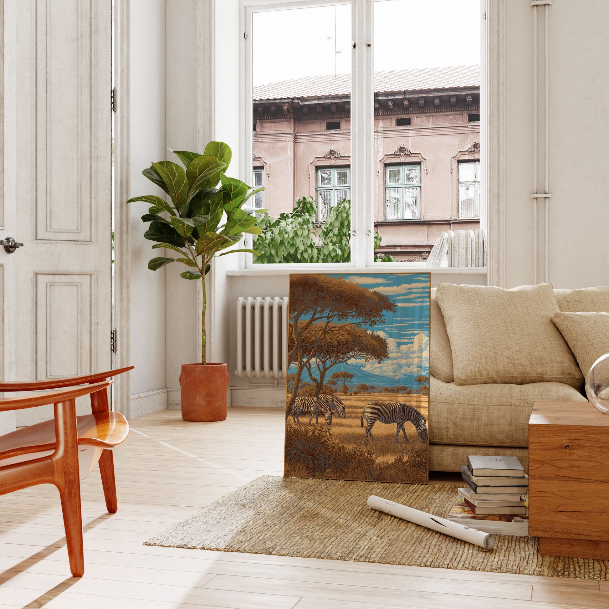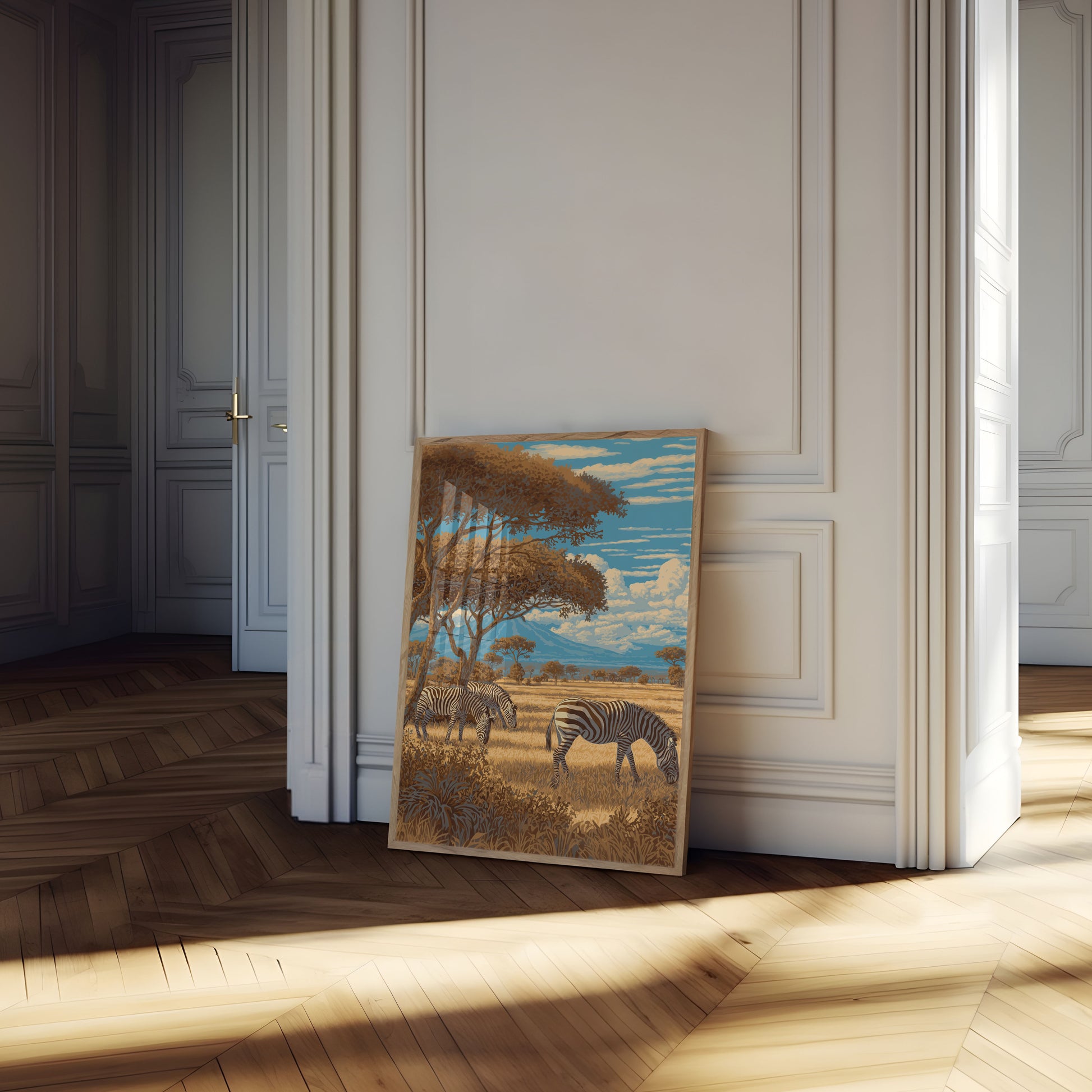 Journey into the heart of the African plains with this stunning landscape featuring three graceful zebras grazing beneath towering acacia trees. Rich golden grasslands stretch toward distant blue mountains, while billowing clouds dance across a vibrant azure sky. This artwork captures the serene beauty and raw wilderness of the savanna in breathtaking detail.