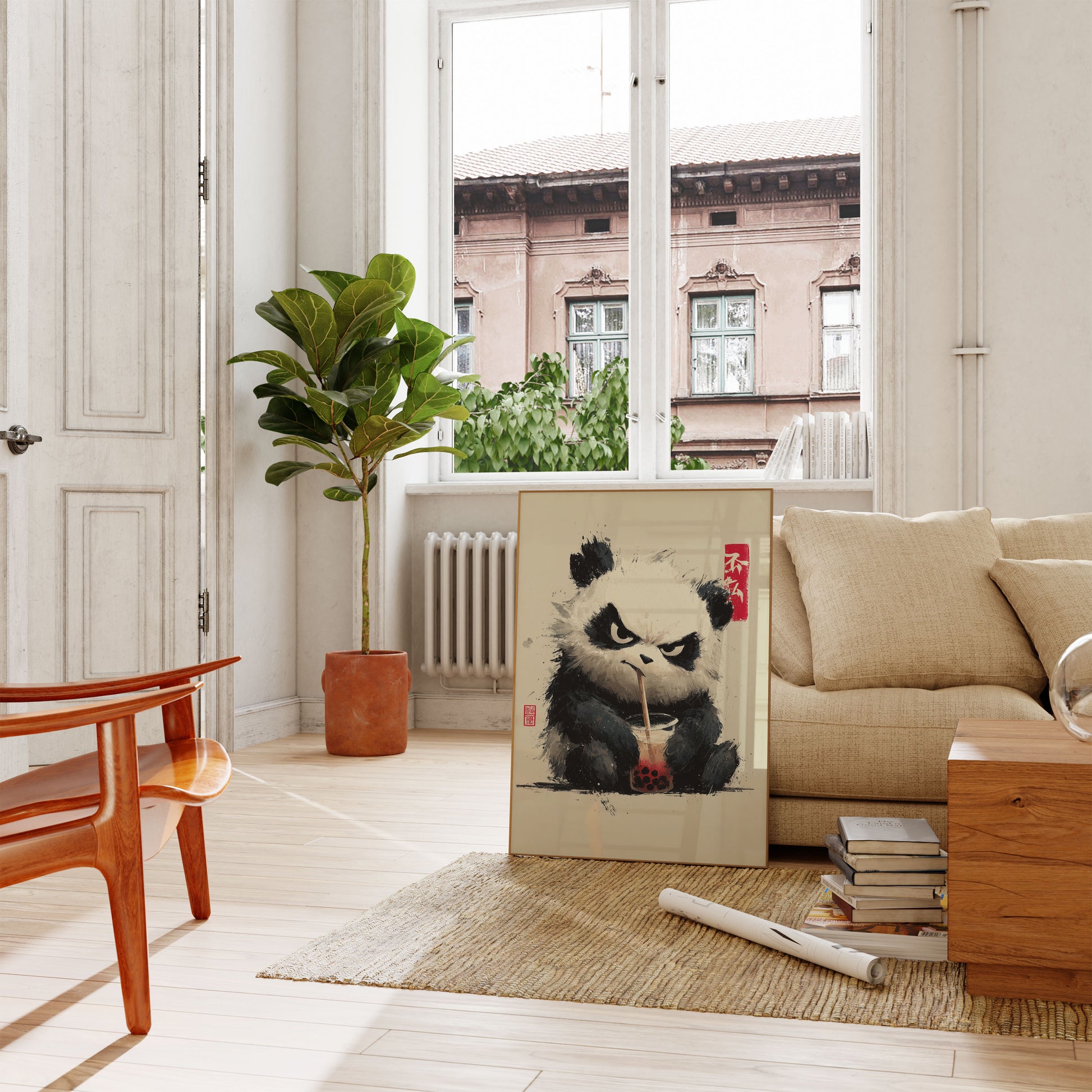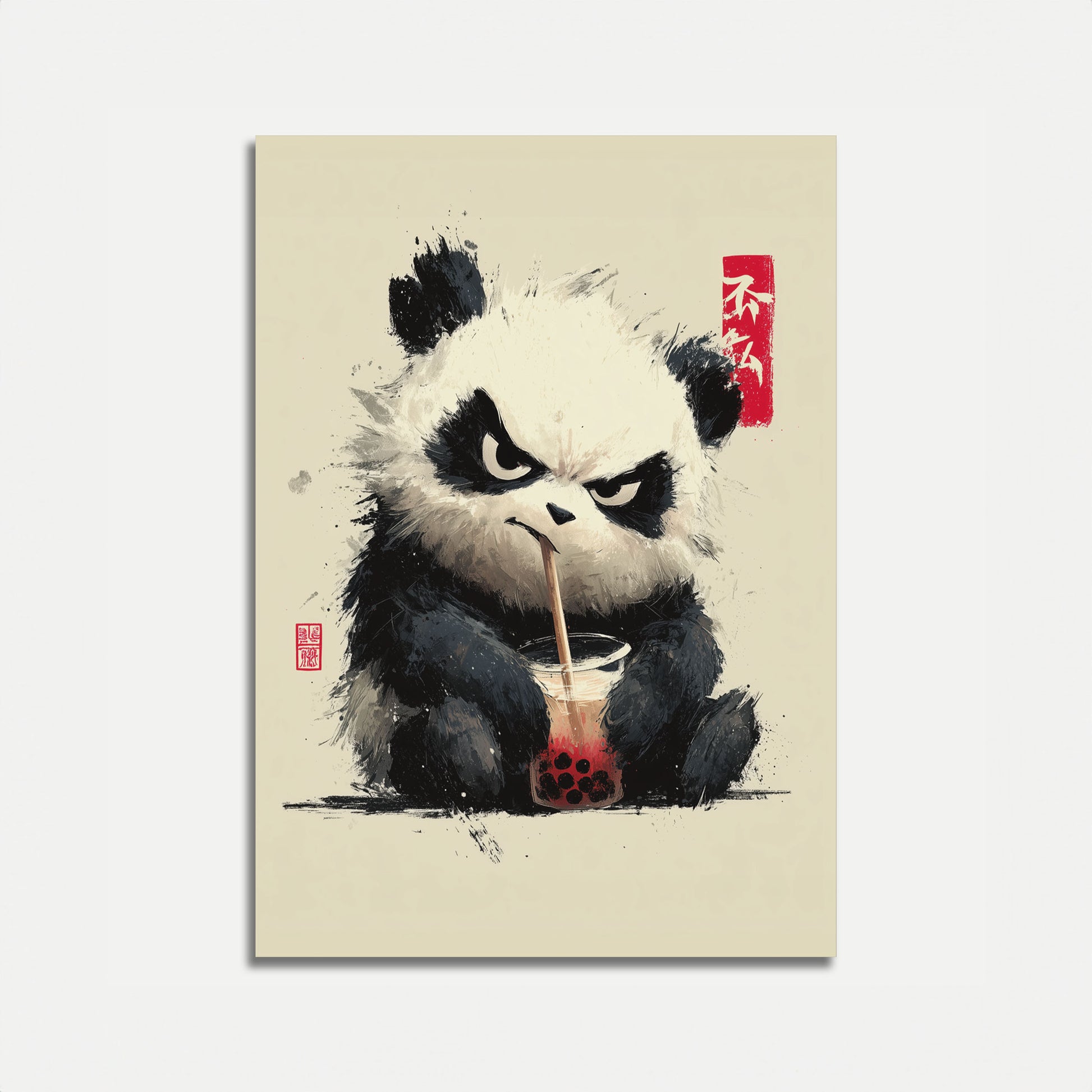 Meet the most adorably grumpy panda ever, sipping bubble tea with an intense glare that could melt steel. This stunning watercolor-style illustration captures a chubby black and white panda drinking boba with hilariously serious determination. The moody artwork blends traditional Asian brush painting techniques with a modern, playful twist, creating a captivating image that's part cute, part attitude.