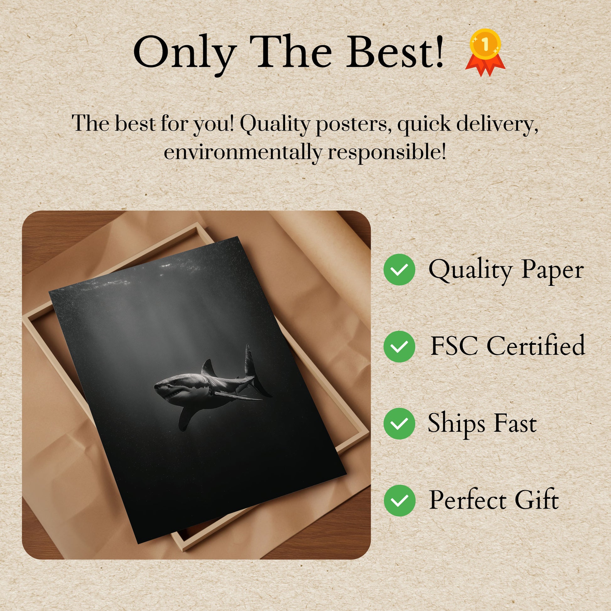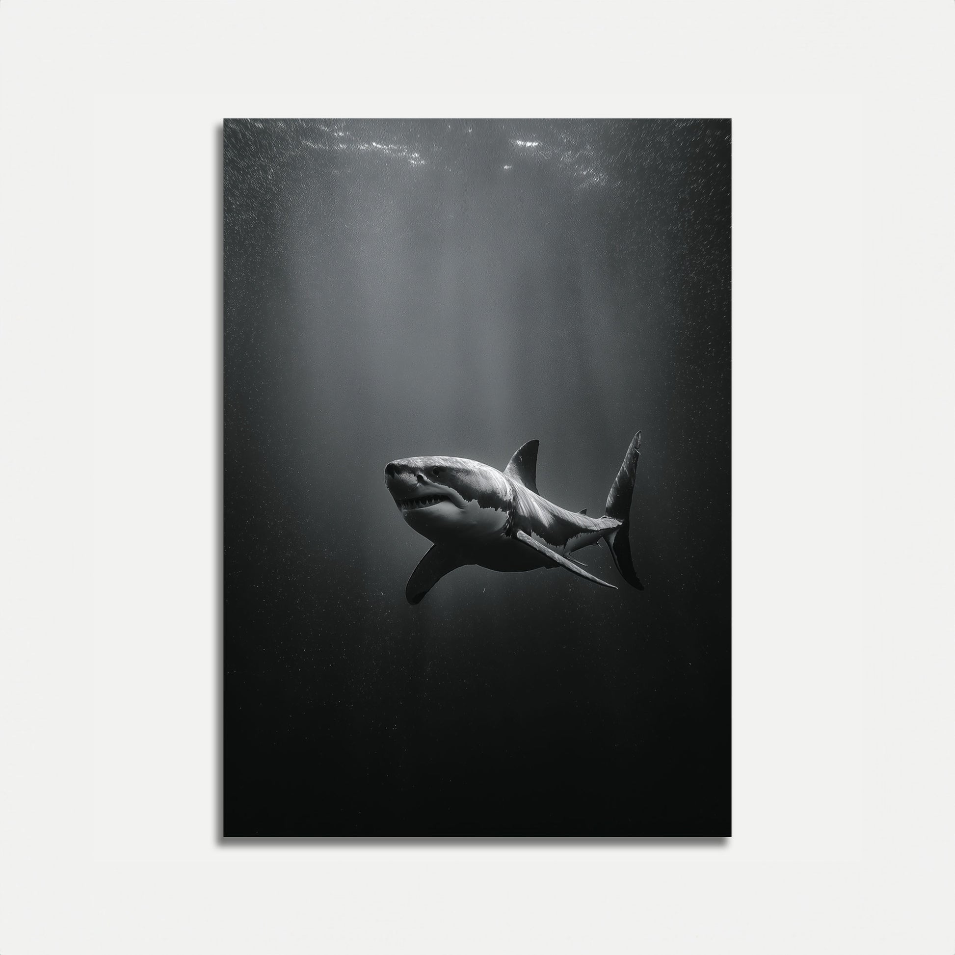 Dive into the mysterious depths with this hauntingly beautiful black and white shark photograph. Suspended in a realm of shadowy underwater light, the great white shark glides with powerful elegance, its muscular form cutting through misty currents. The monochromatic composition creates an intense, dramatic atmosphere that captures the raw power and primal beauty of this marine apex predator.
