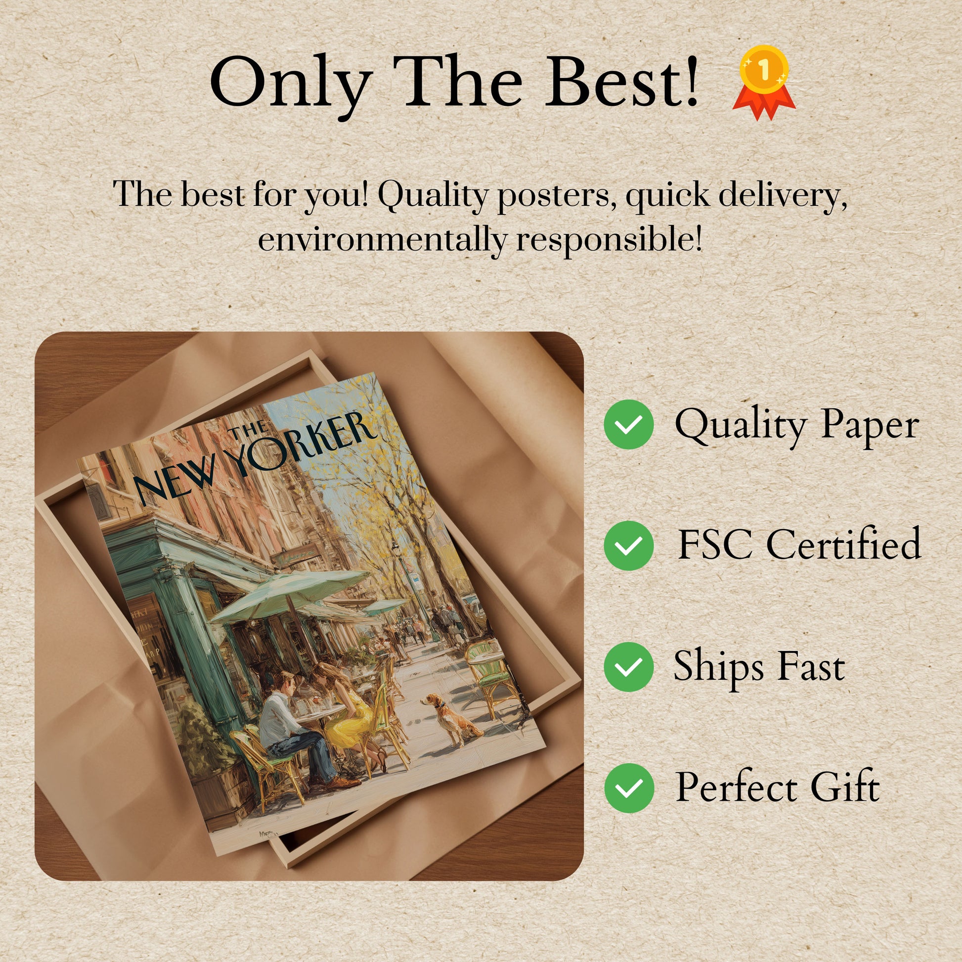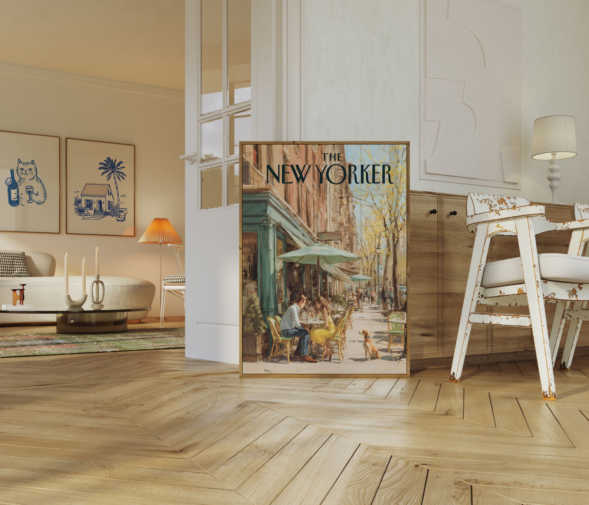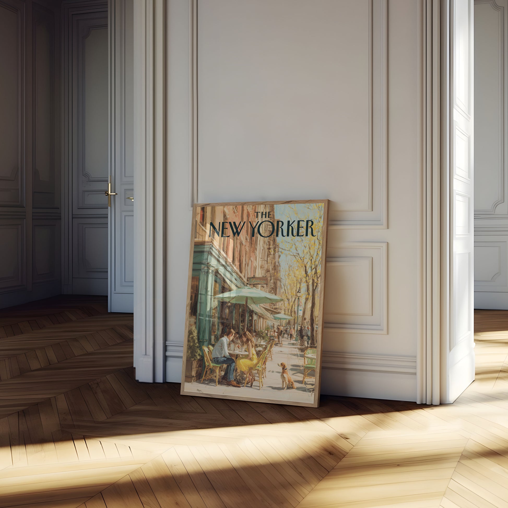 Immerse yourself in the warm, golden ambiance of a charming New York City sidewalk cafe scene. This beautifully painted New Yorker magazine cover captures a serene moment of urban life, with soft autumn light filtering through yellow-leaved trees and cafe umbrellas creating an inviting atmosphere. A delightful dog sits patiently beside cafe patrons, adding a touch of companionship to this nostalgic urban landscape.