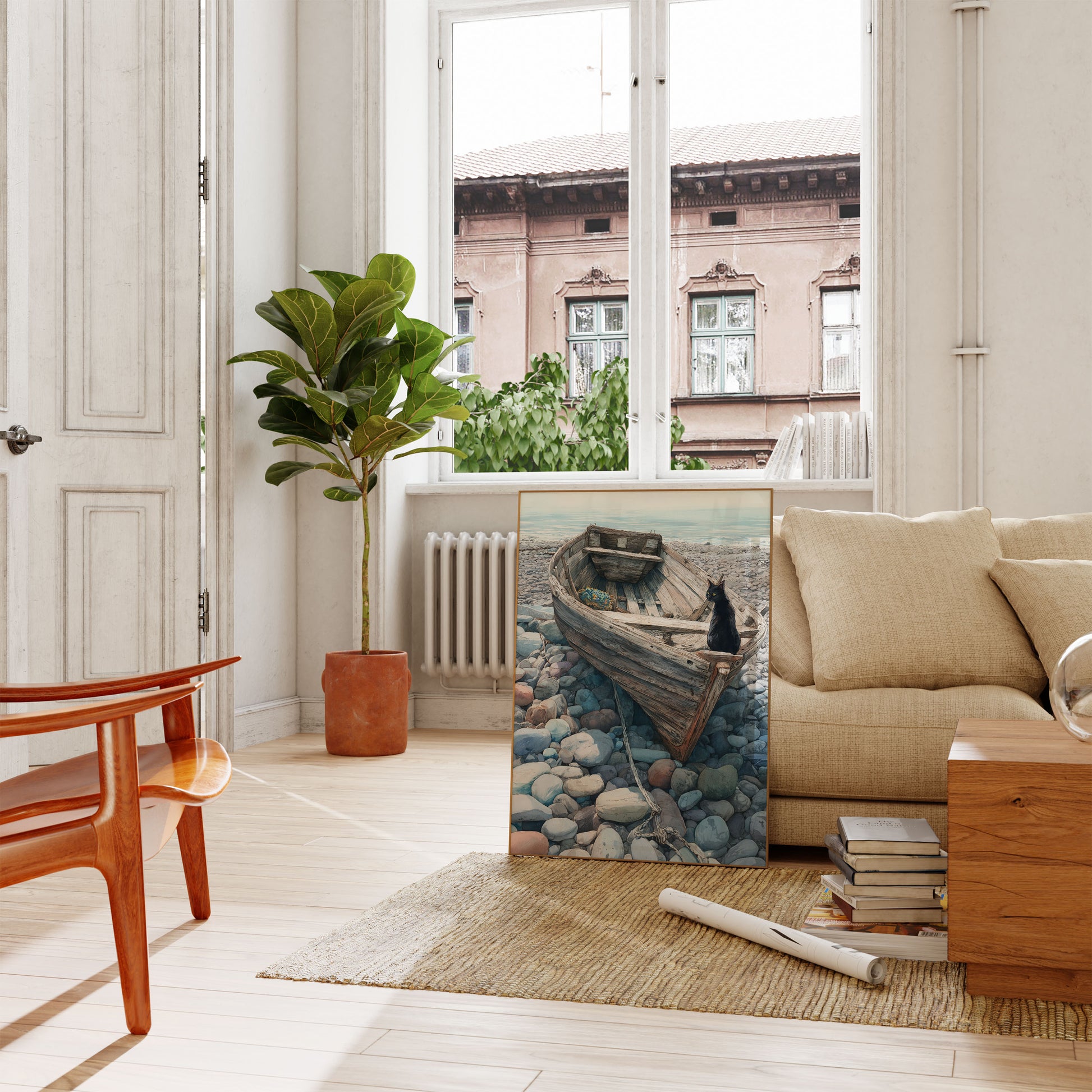 Une illustration frappante capture un chat noir curieux perché sur la coque usée d'un bateau en bois abandonné, entouré de galets lisses et de pierres côtières. La scène évoque un sentiment de solitude tranquille et de mystère maritime, le regard perçant du chat vous attirant dans ce moment balnéaire serein. Rendu dans de magnifiques tons aquarelle, la texturation détaillée du bois usé contraste magnifiquement avec les bleus et les gris doux et atténués du paysage de plage, créant une ambiance atmosphérique et contemplative qui plaît à la fois aux amateurs de chats et aux admirateurs de l'art côtier.