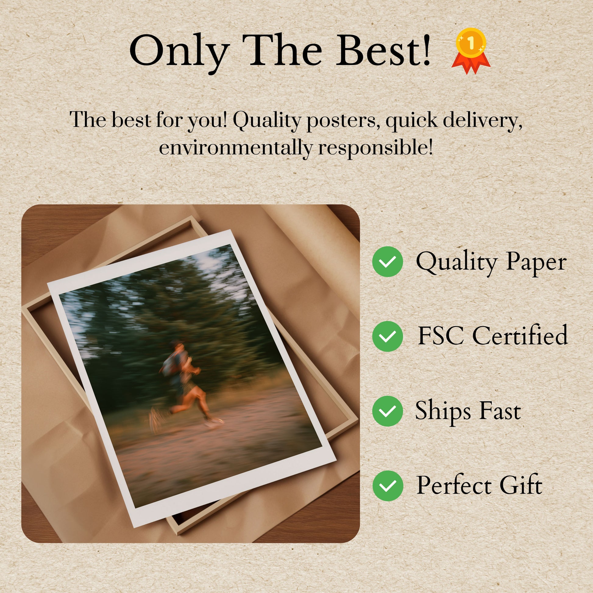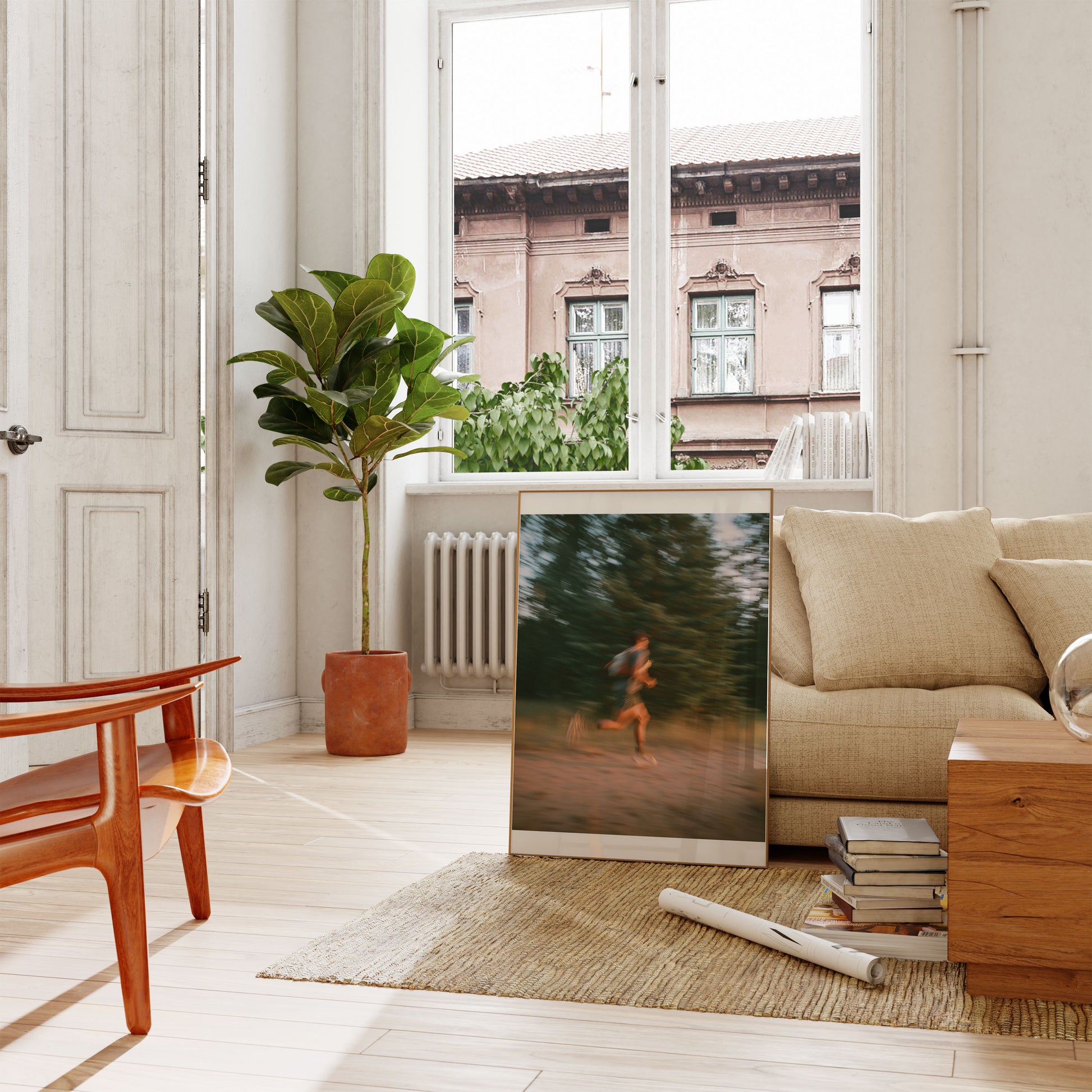 Experience the raw energy of movement captured in this dynamic running poster. The image blends speed and motion, showing a runner in mid-stride against a blurred forest backdrop. Warm orange and green tones create a sense of urgency and vitality, transforming a simple athletic moment into a powerful visual experience.