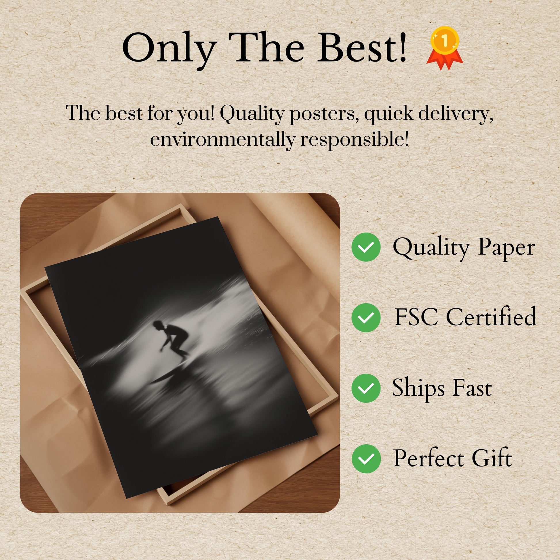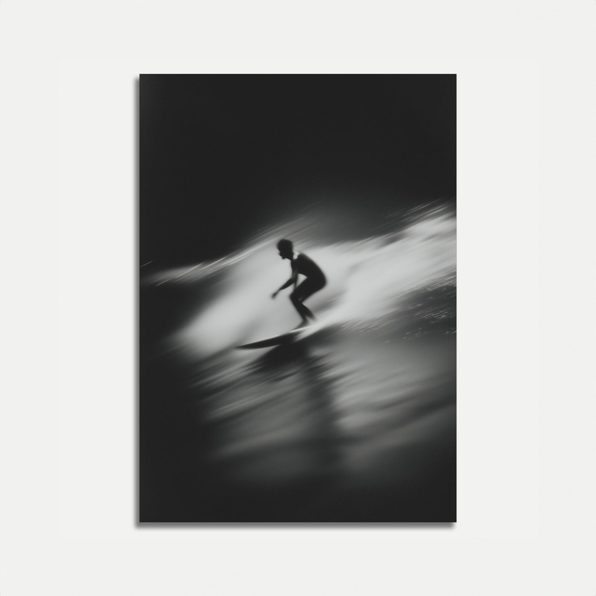 Immerse yourself in the dynamic energy of this black and white surfing artwork, where motion and stillness collide in a mesmerizing visual dance. The blurred silhouette captures the raw essence of surfing - speed, balance, and the fluid connection between rider and wave. This artistic poster transforms a moment of athletic grace into a powerful abstract expression of movement.