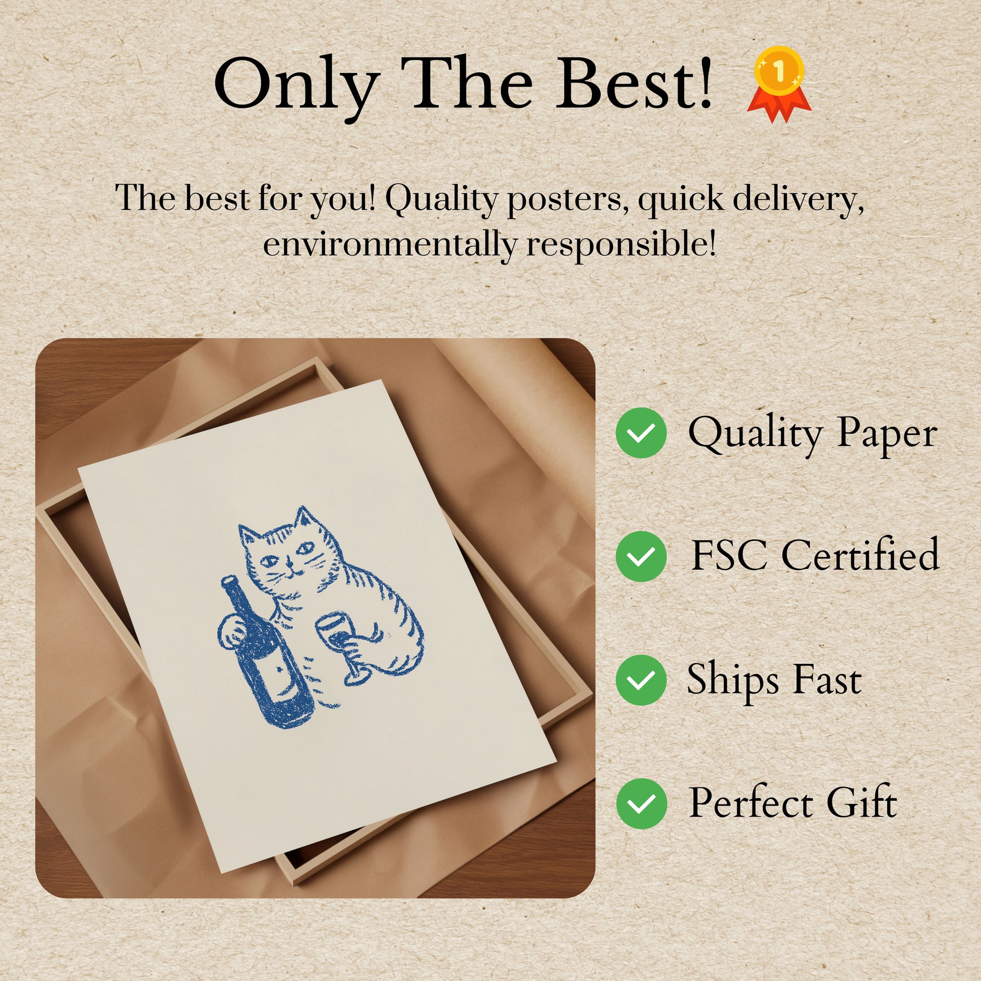 Indulge in the charming world of this adorable blue-toned illustration featuring a content cat enjoying an evening with a wine bottle and glass. The playful, hand-drawn style captures the cat's relaxed demeanor with a touch of whimsy, making this print a delightful addition to any wine lover's or cat enthusiast's home decor. Rendered in a soothing blue crayon-like texture, this artwork brings a sense of calm and humor to your living space.