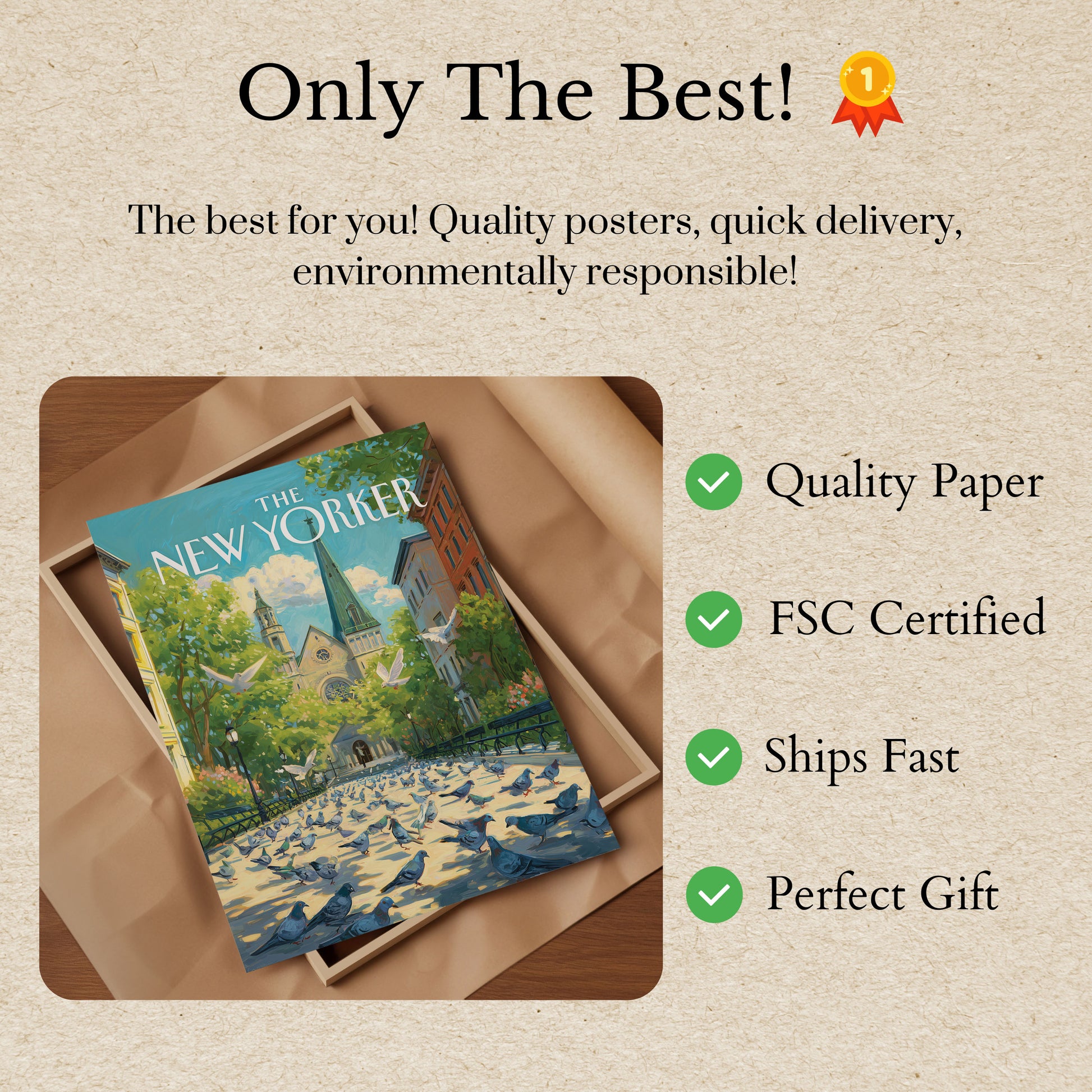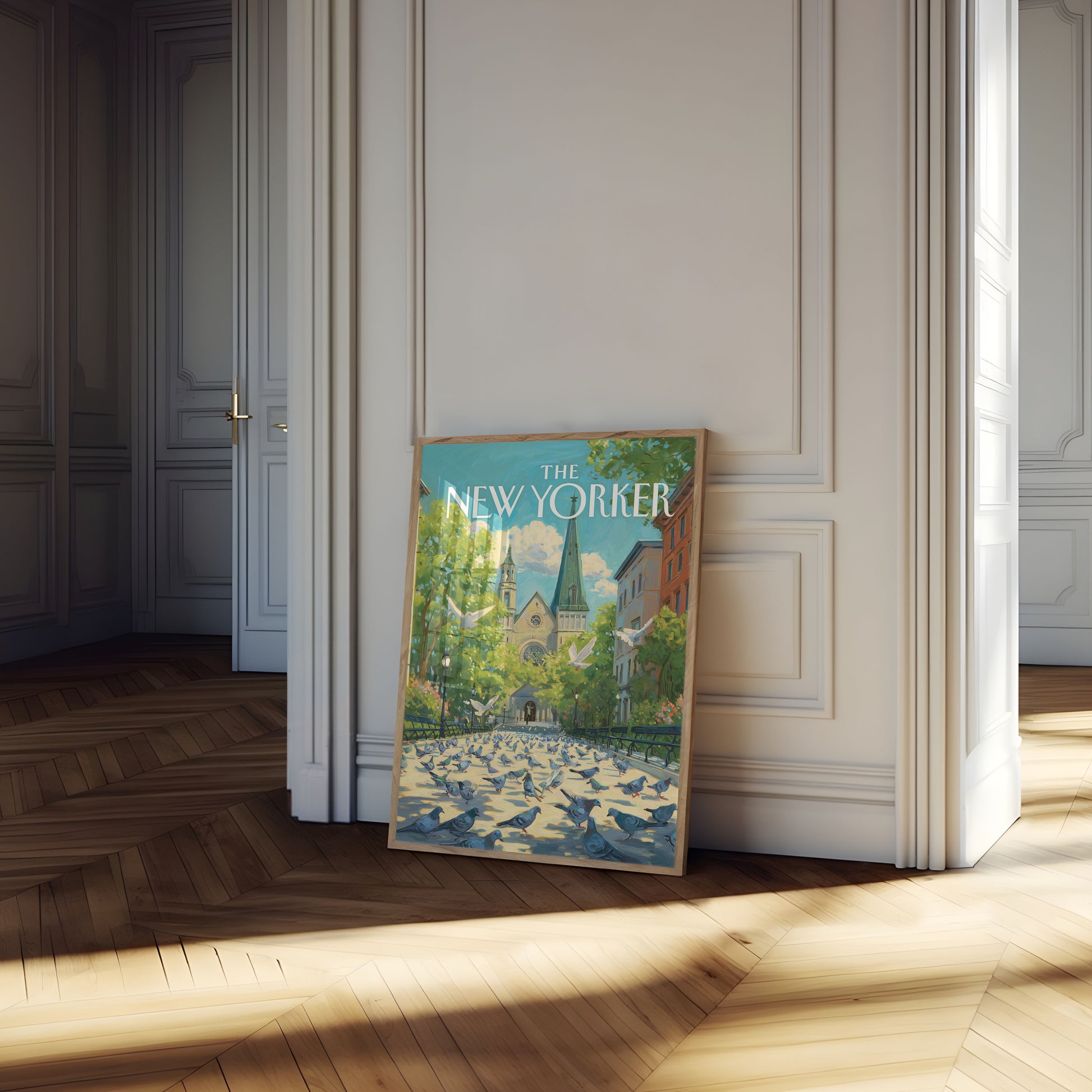 Immerse yourself in the serene urban landscape of this stunning New Yorker magazine cover poster. Soft sunlight bathes a charming city square filled with dozens of blue-gray pigeons, framed by lush green trees and a beautiful historic church with elegant spires. White doves flutter above, creating a dreamlike atmosphere that captures the peaceful heart of city life.