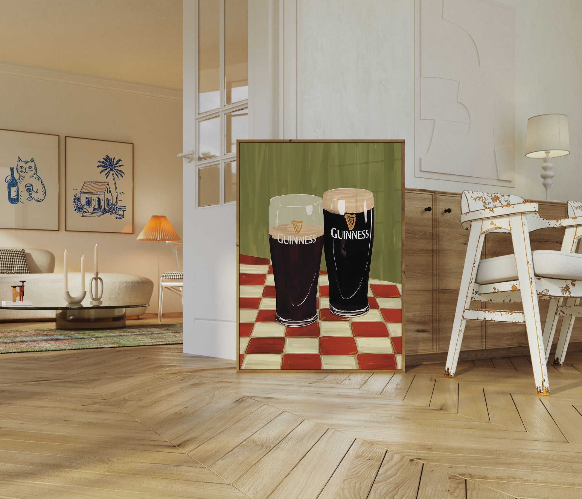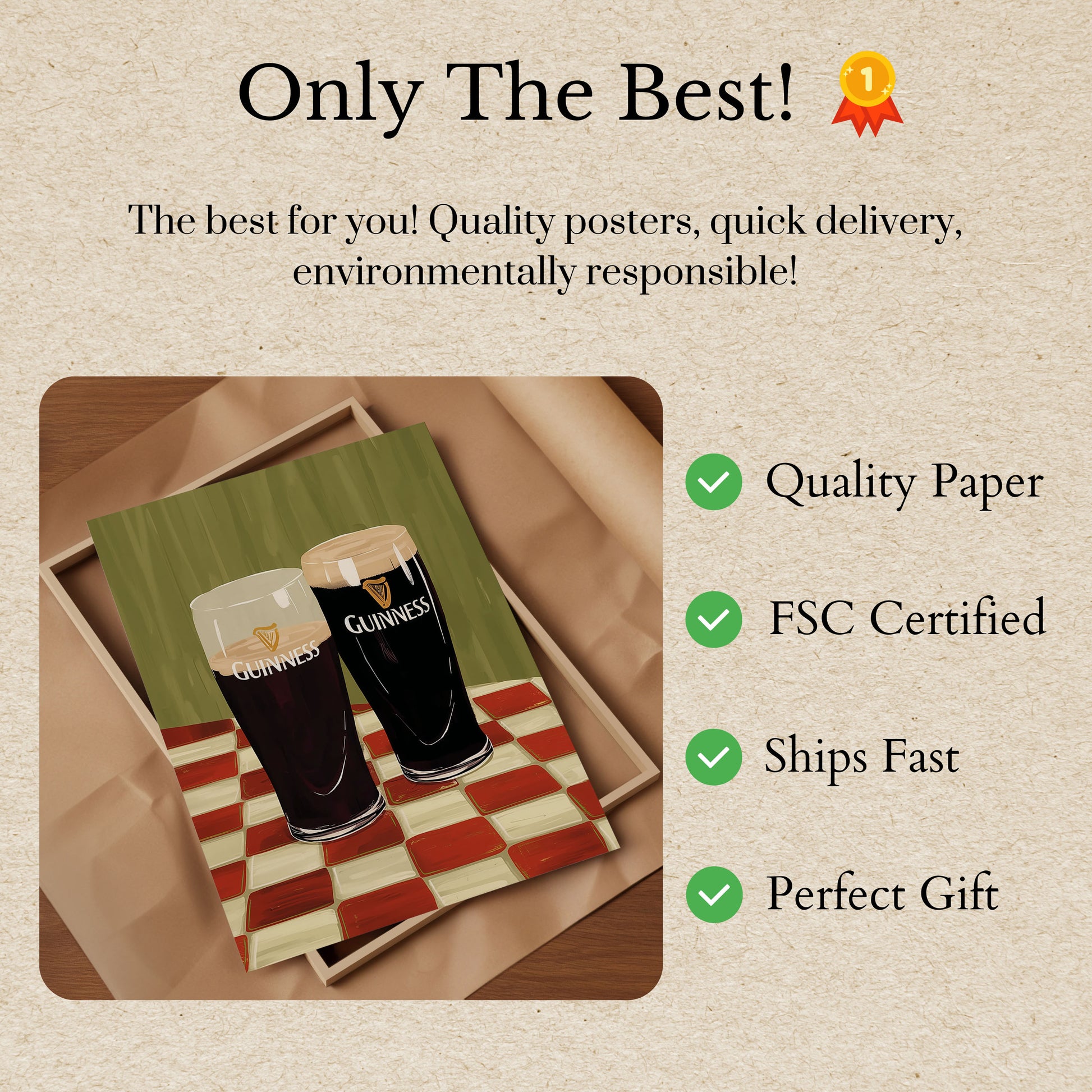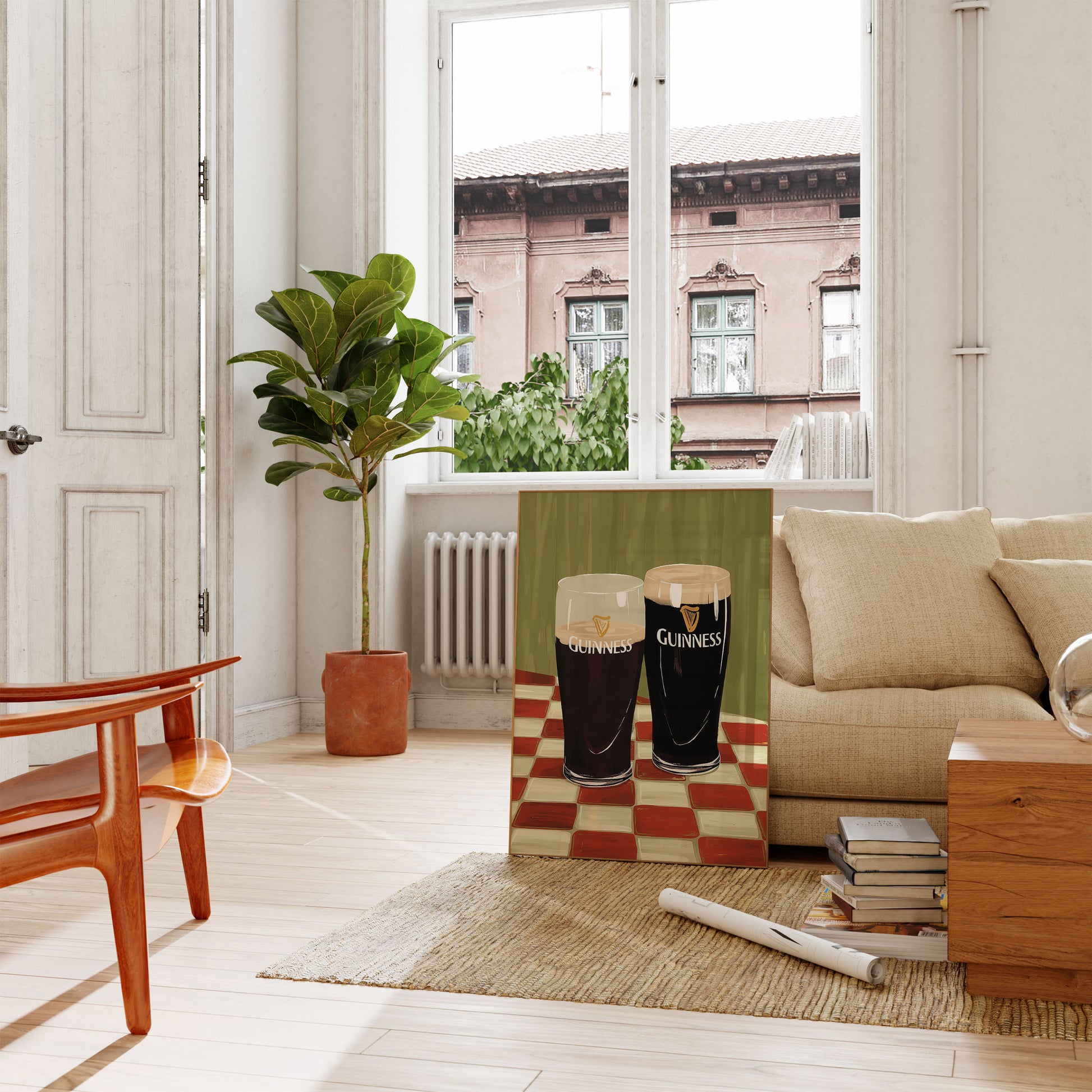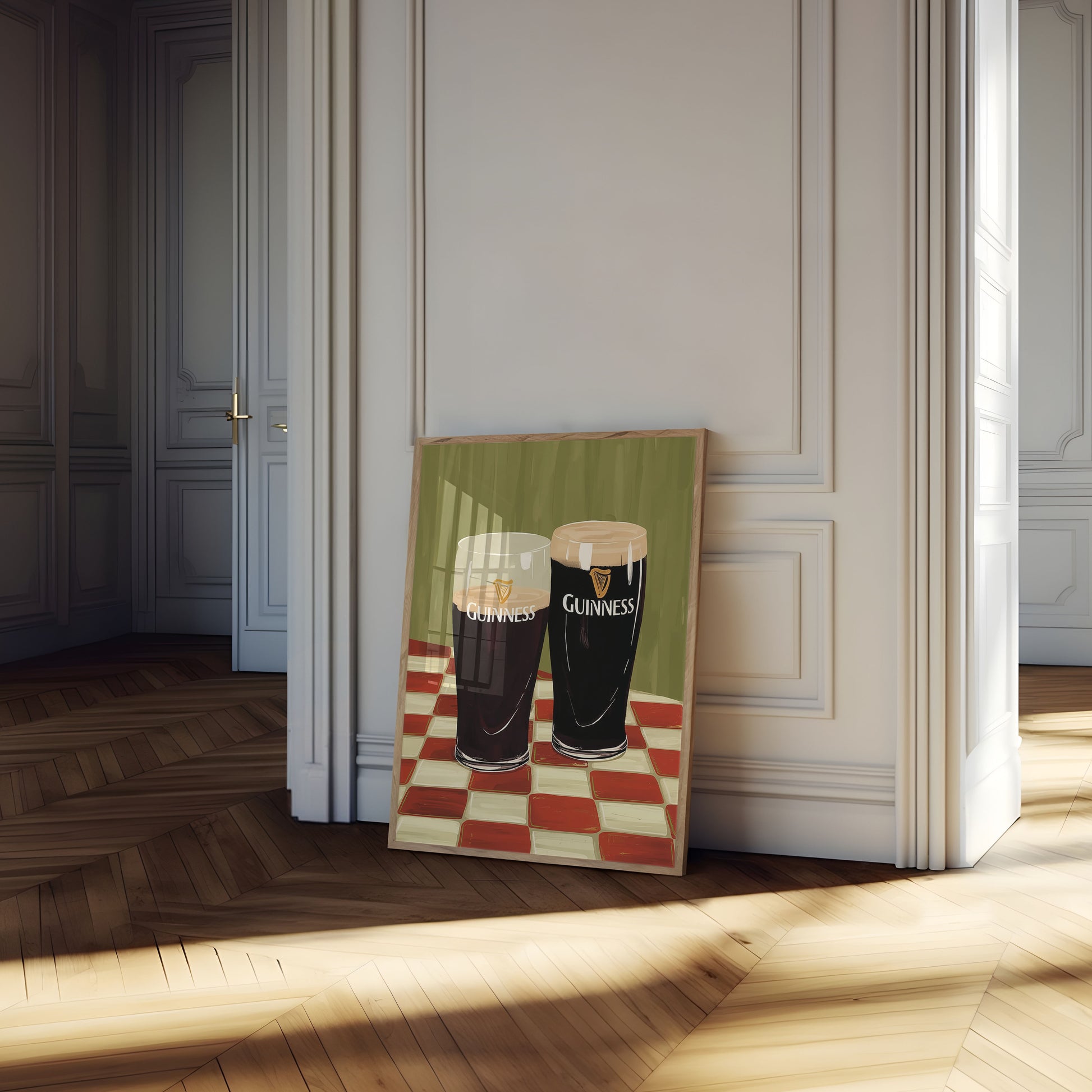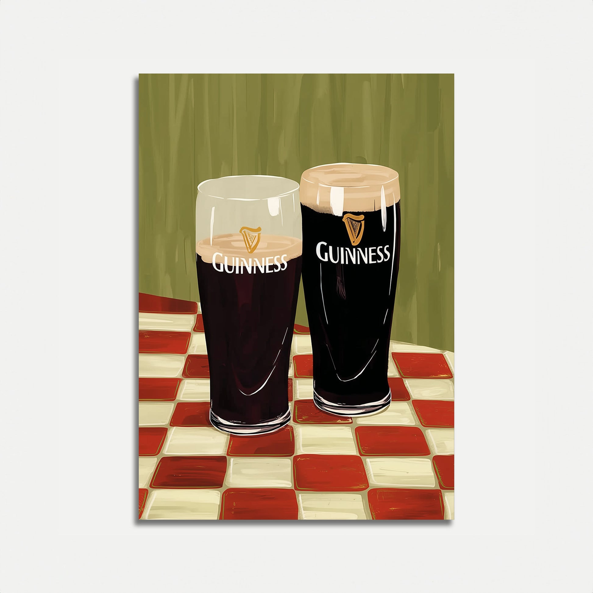 Dive into the rich, velvety world of Guinness with this stunning bar art print that captures the iconic dark stout in all its glory. Two perfectly poured glasses sit elegantly on a red and white checkered surface, showcasing the deep black body and creamy golden head that make Guinness a legendary brew. The vintage-inspired illustration brings a touch of Irish pub charm to any space, celebrating the timeless tradition of this beloved beer.