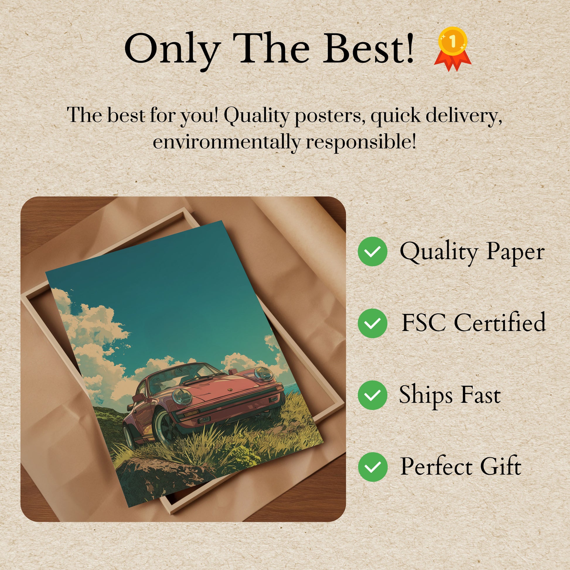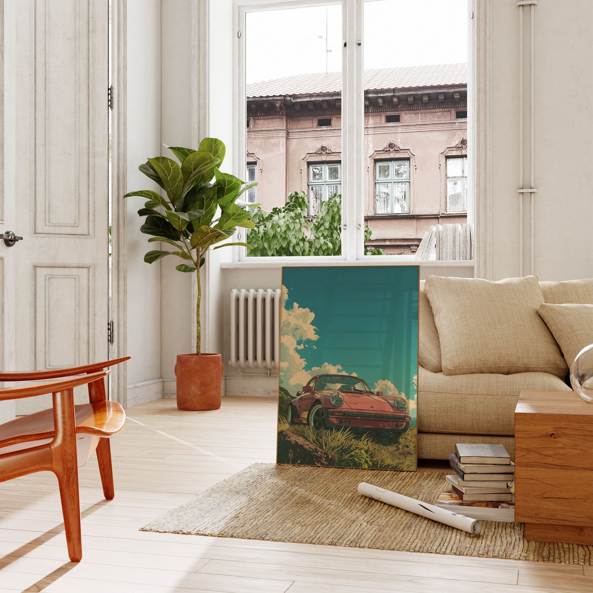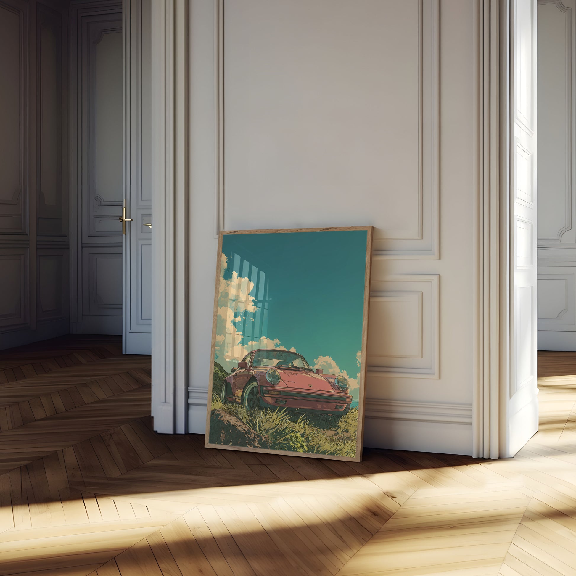 Immerse yourself in this stunning vintage Porsche artwork, capturing a classic sports car resting on a grassy cliff with a breathtaking cloudscape of turquoise and cream. The beautifully rendered pink-toned classic Porsche 911 sits majestically against a dreamy sky, inviting viewers into a nostalgic automotive fantasy that blends natural beauty with mechanical perfection.