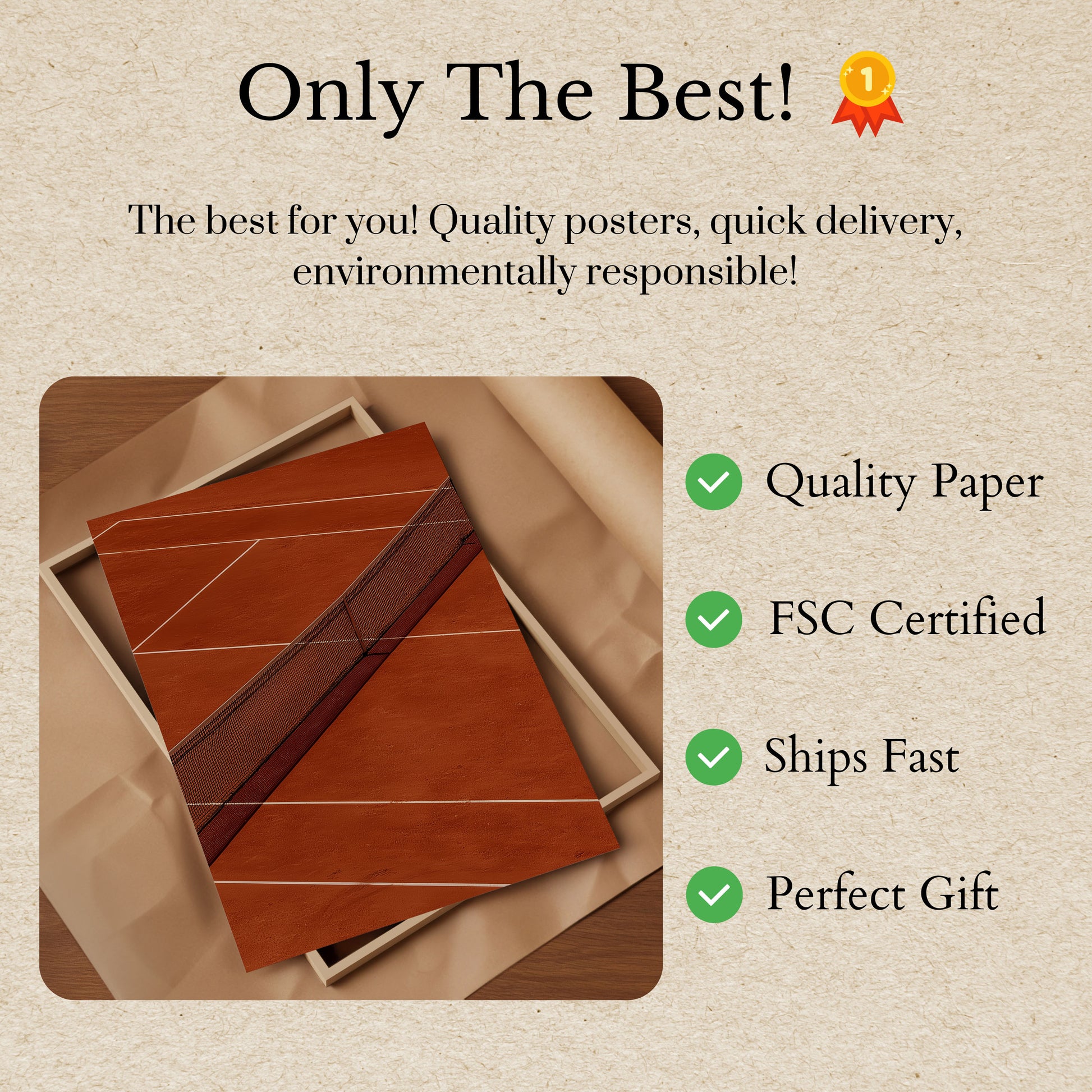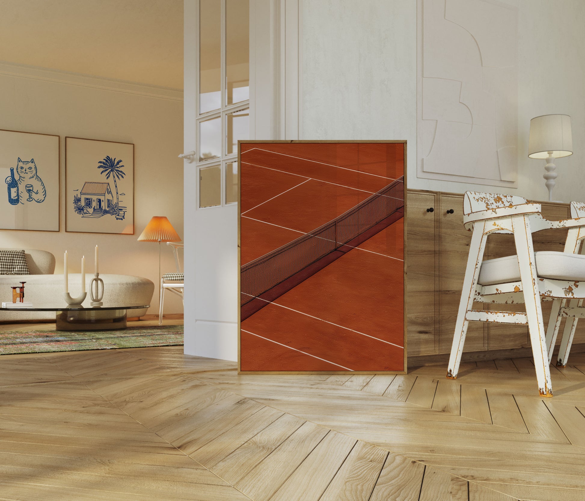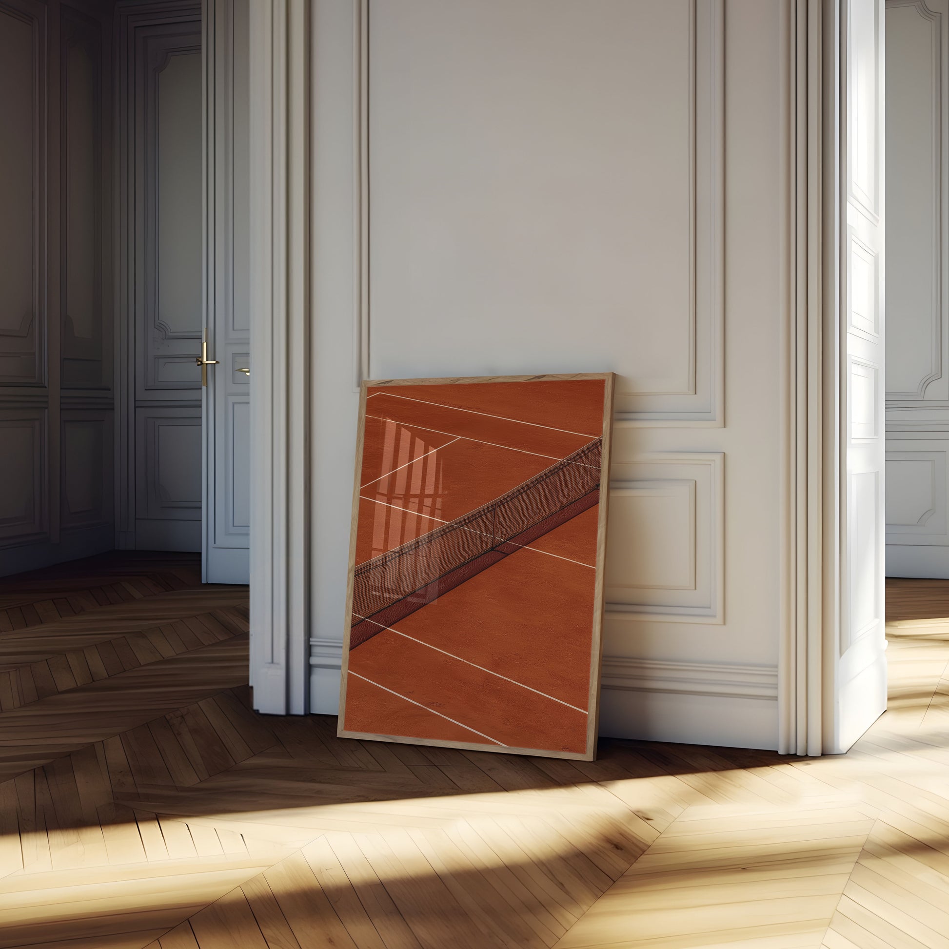 Experience the elegant geometry of a pristine clay tennis court, captured in rich terracotta hues and precise white boundary lines. The image showcases the iconic tennis court net stretching across the frame, creating a mesmerizing landscape of athletic precision and minimalist design. Every line and texture tells a story of the beautiful sport, inviting viewers to appreciate the quiet moments between matches.