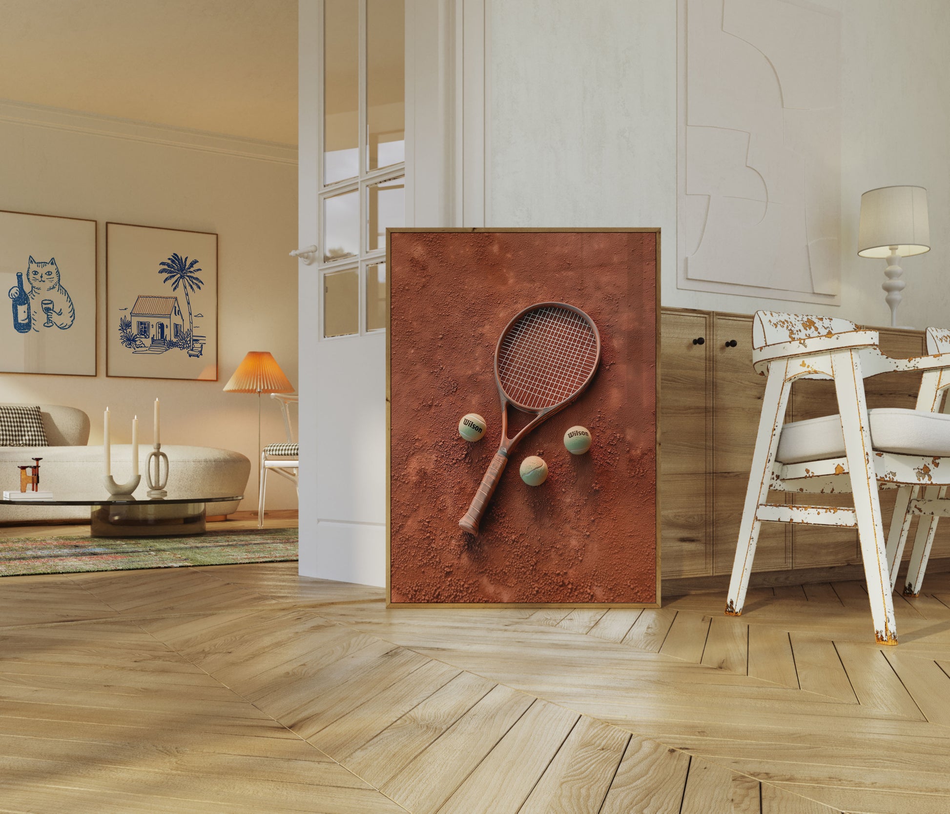 Capture the essence of tennis with this stunning composition showcasing a vintage Wilson racket and three tennis balls nestled on a rich, textured clay court surface. The warm terracotta tones and meticulous arrangement evoke the timeless beauty and intensity of the sport, inviting viewers into the passionate world of tennis.