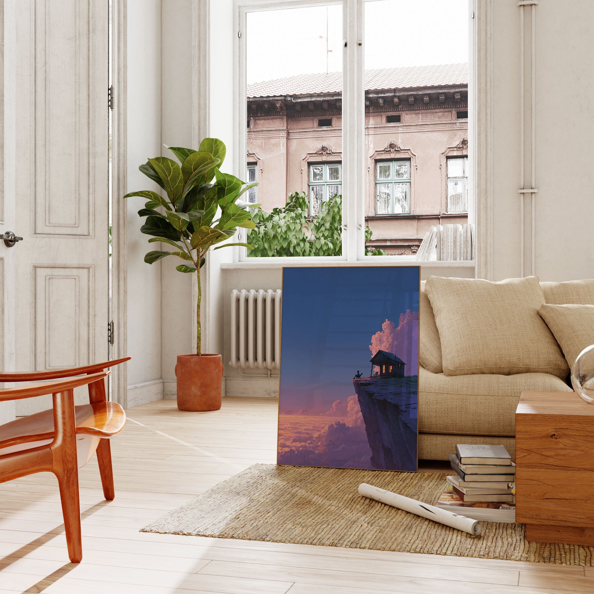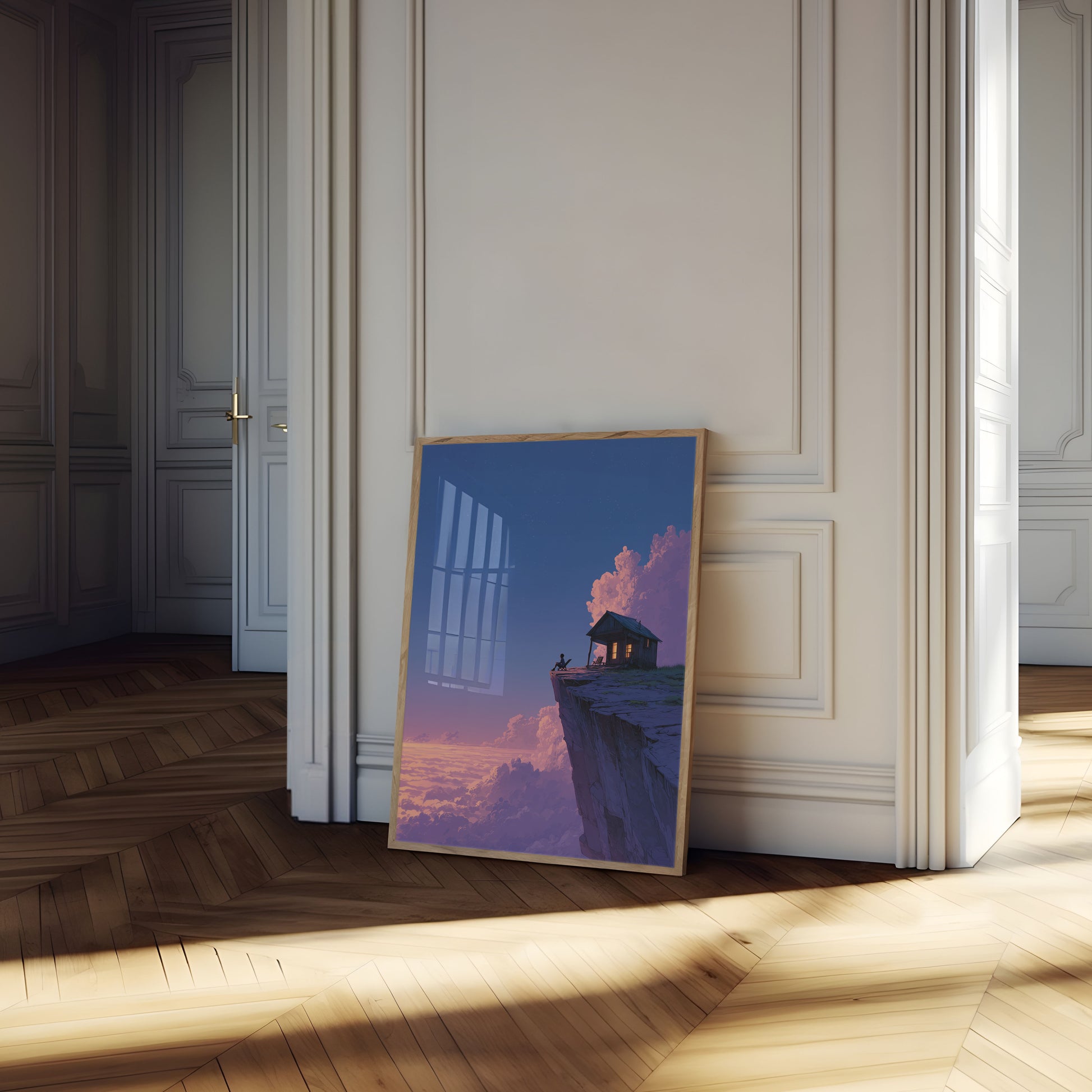 Perched on a dramatic rocky precipice high above the clouds, a solitary cabin glows with warm light against a breathtaking sunset landscape. Soft pink and purple clouds billow around the rocky cliff, creating a dreamlike atmosphere that captures the essence of peaceful isolation and quiet contemplation. This Studio Ghibli-inspired artwork invites viewers into a serene moment suspended between earth and sky.
