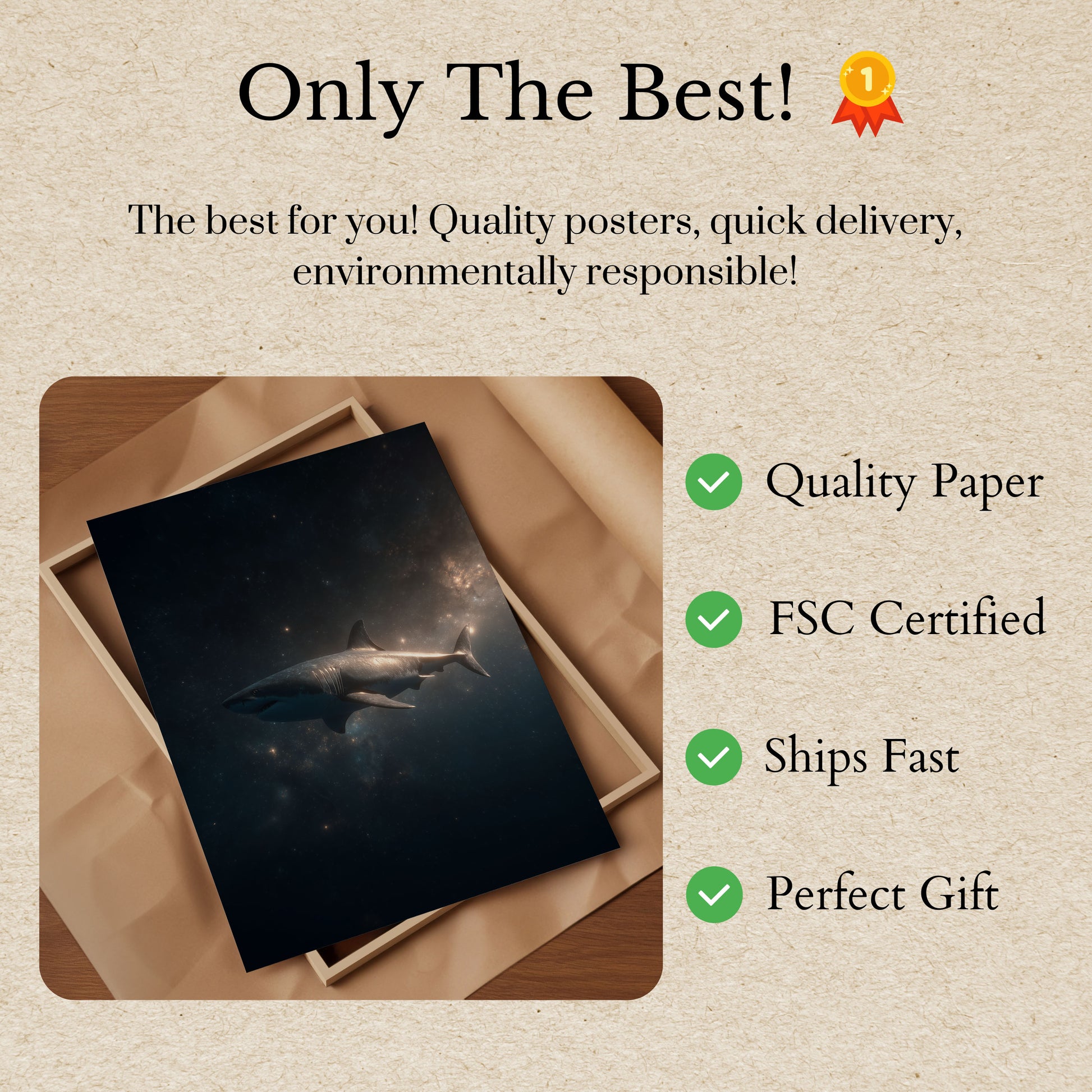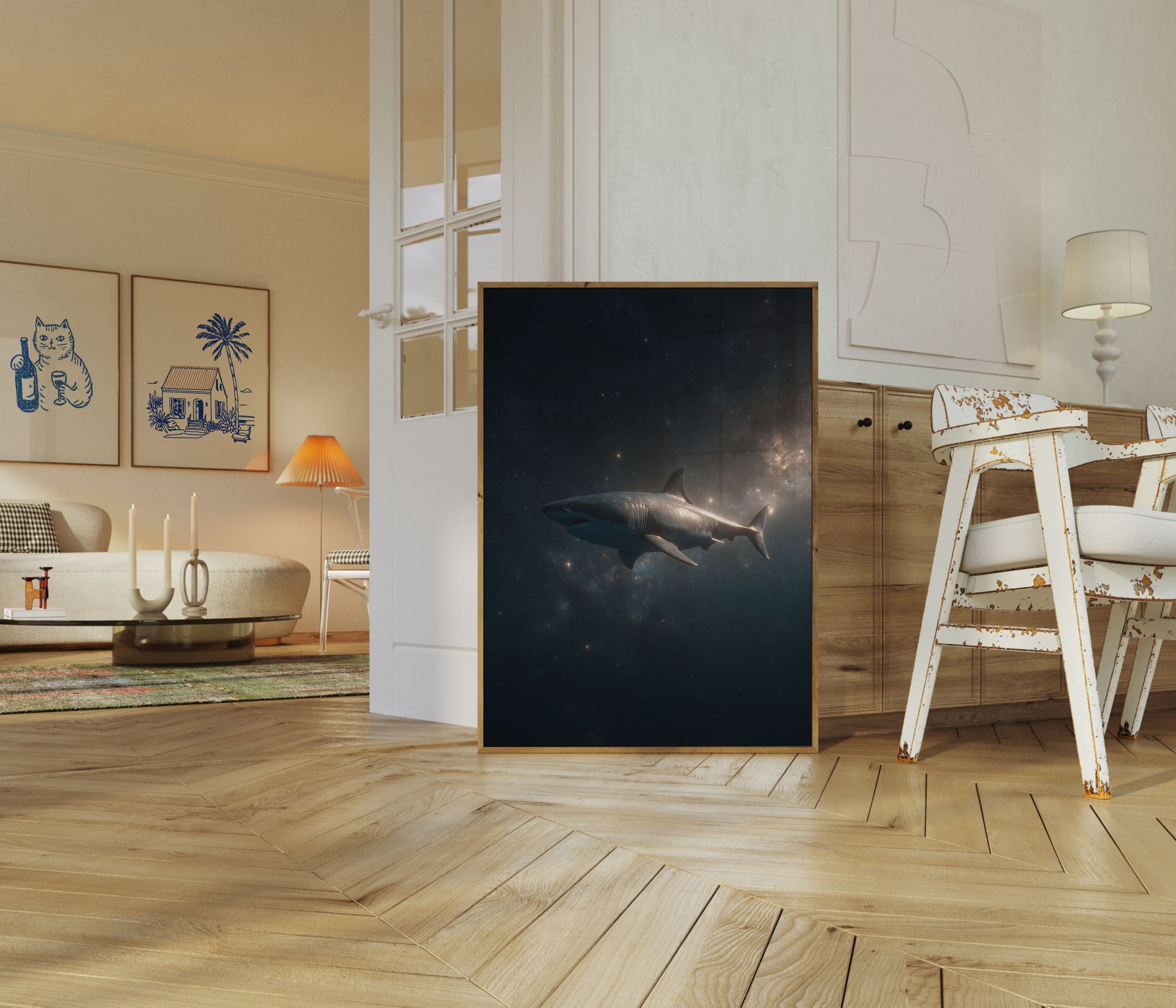 Dive into the mesmerizing depths of imagination with this stunning celestial shark artwork. Suspended in a starry cosmic backdrop, the shark glides majestically through a universe of twinkling lights and nebulous clouds, its sleek form illuminated by ethereal starlight. The image blends marine power with astronomical wonder, creating a breathtaking visual journey that captures the mysterious and infinite nature of both ocean and space.