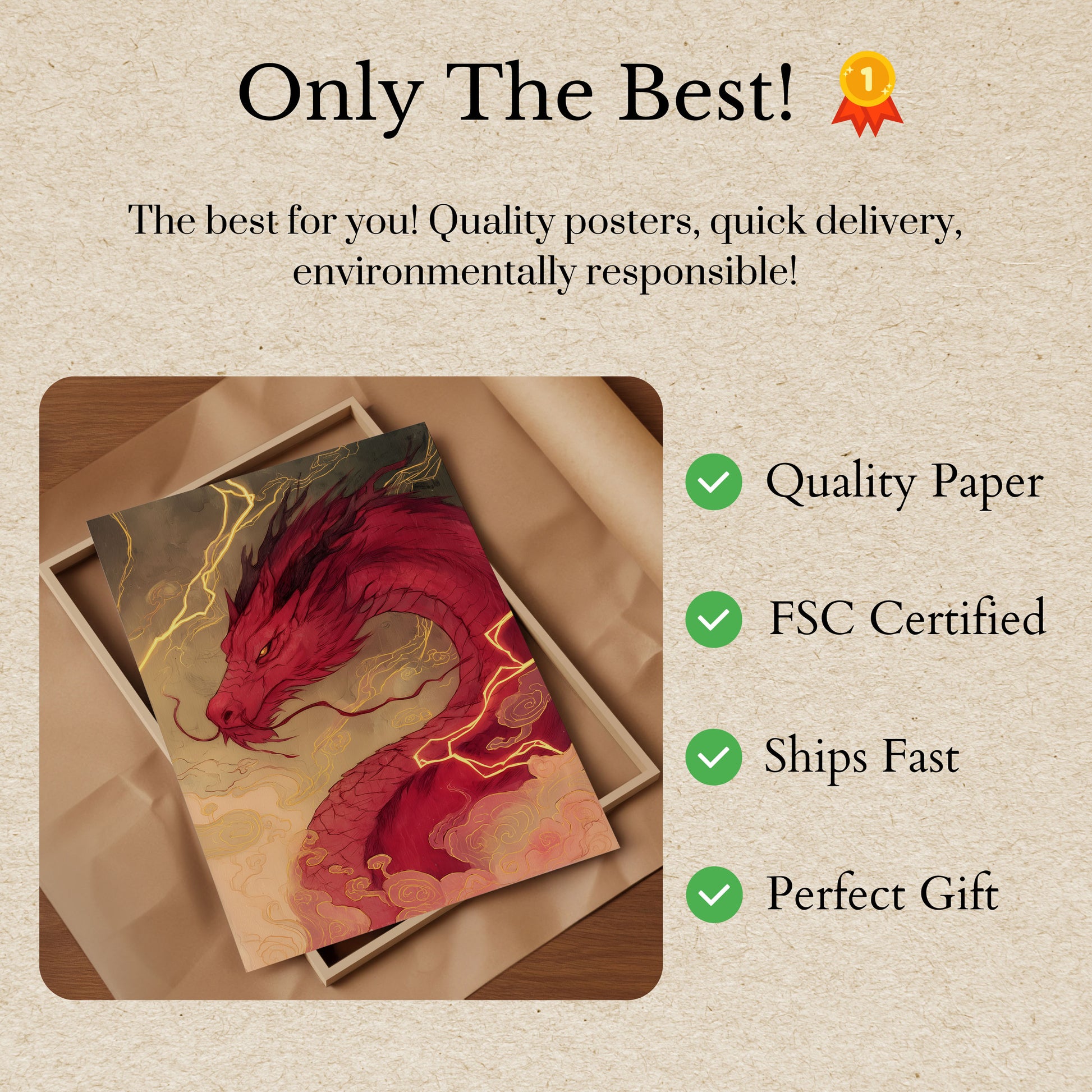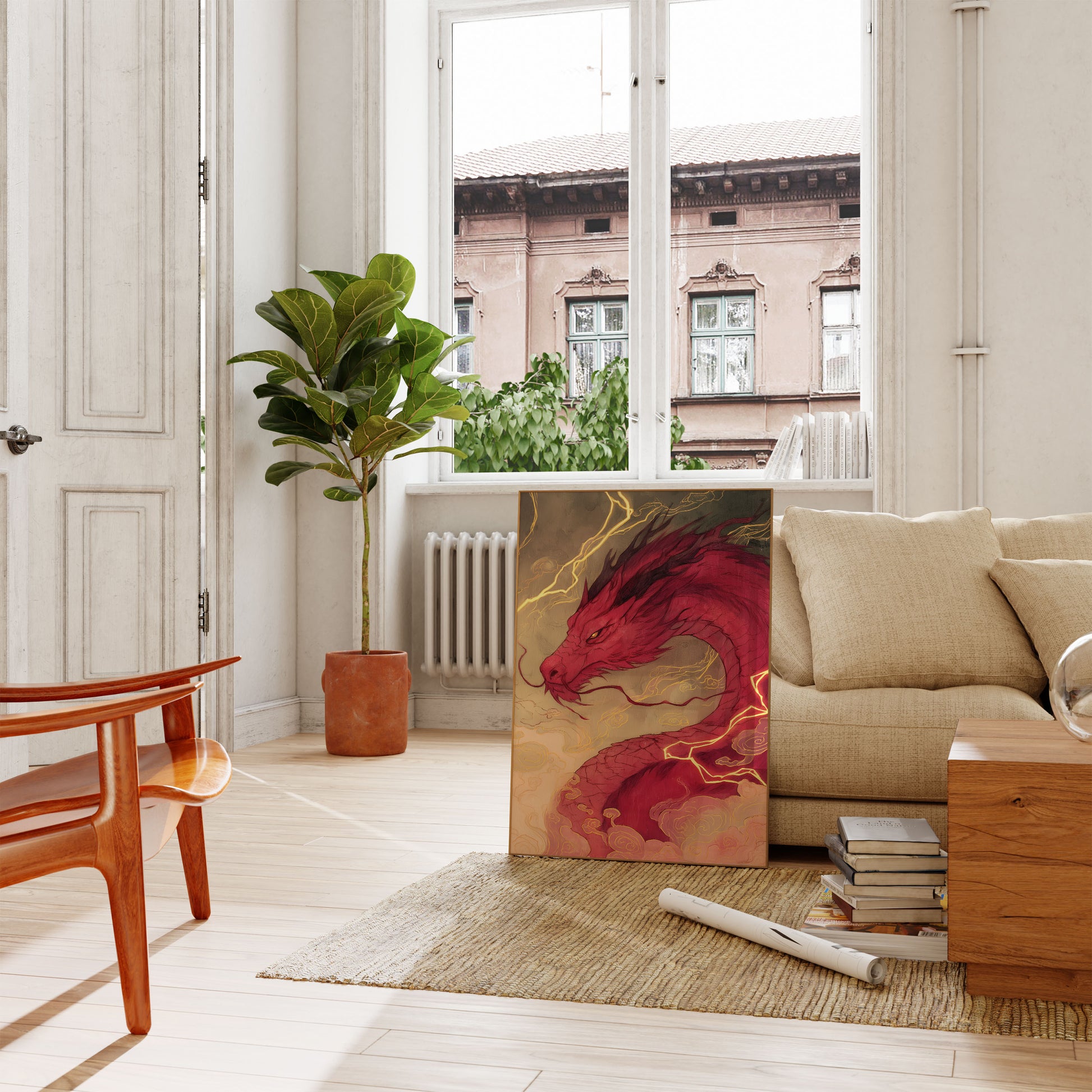 Unleash the power of mythical beauty with this stunning Chinese dragon artwork. A fierce, vermilion dragon swirls through electrifying golden lightning and delicate cloud formations, creating an intense and mesmerizing visual experience. The deep red scales and piercing yellow eyes capture the raw, elemental energy of this legendary creature against a dramatic, atmospheric background.