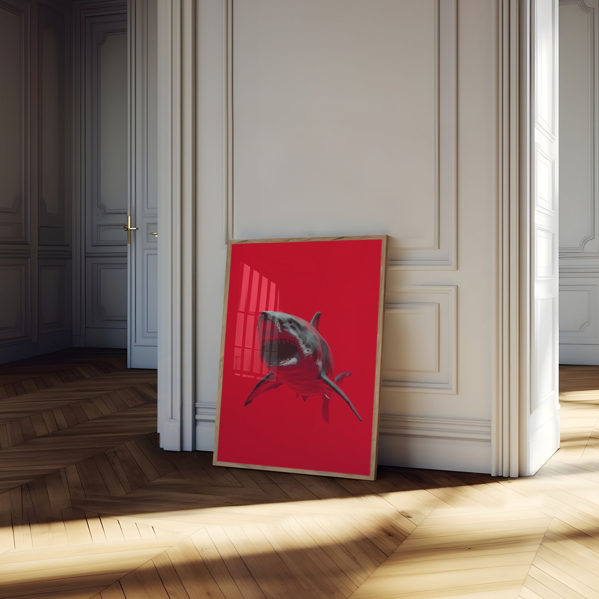Dive into the intense world of marine predation with this striking white shark artwork. Set against a bold crimson background, the shark emerges with jaw-dropping realism, its razor-sharp teeth and powerful form capturing the raw, primal essence of one of nature's most feared hunters. The dramatic red backdrop amplifies the shark's menacing presence, creating a visually arresting piece that commands attention and sends shivers down the spine.