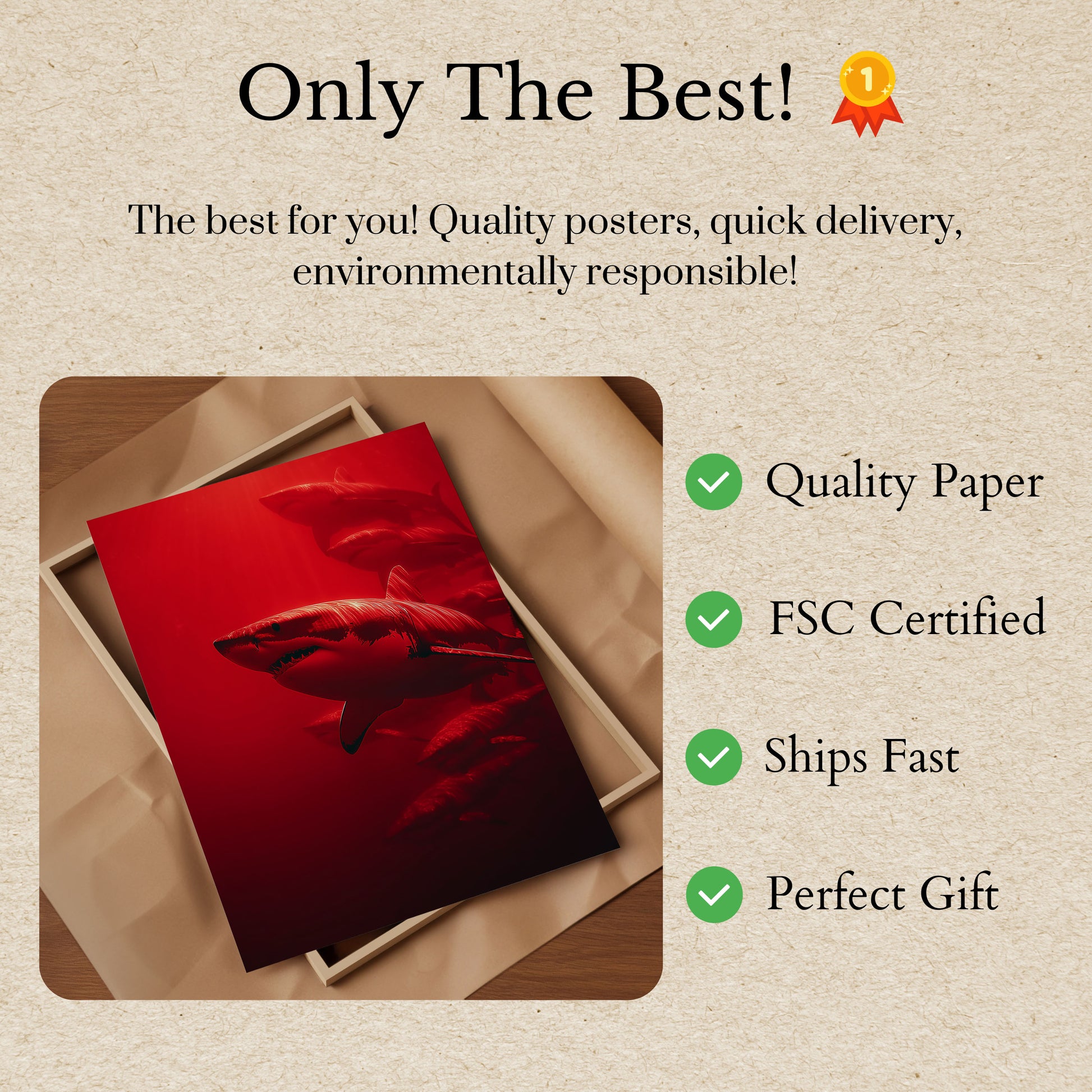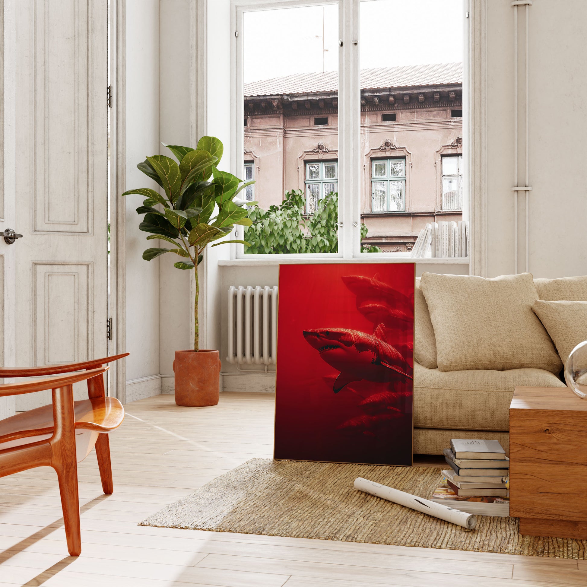 Dive into the intense world of marine predators with this striking red-hued shark artwork. The image captures the raw power and menacing presence of sharks, bathed in a deep crimson backdrop that amplifies their primal energy and fierce nature. Every detail of the shark's muscular form is meticulously rendered, creating a visually stunning and emotionally provocative piece that commands attention and evokes the mysterious depths of the ocean.