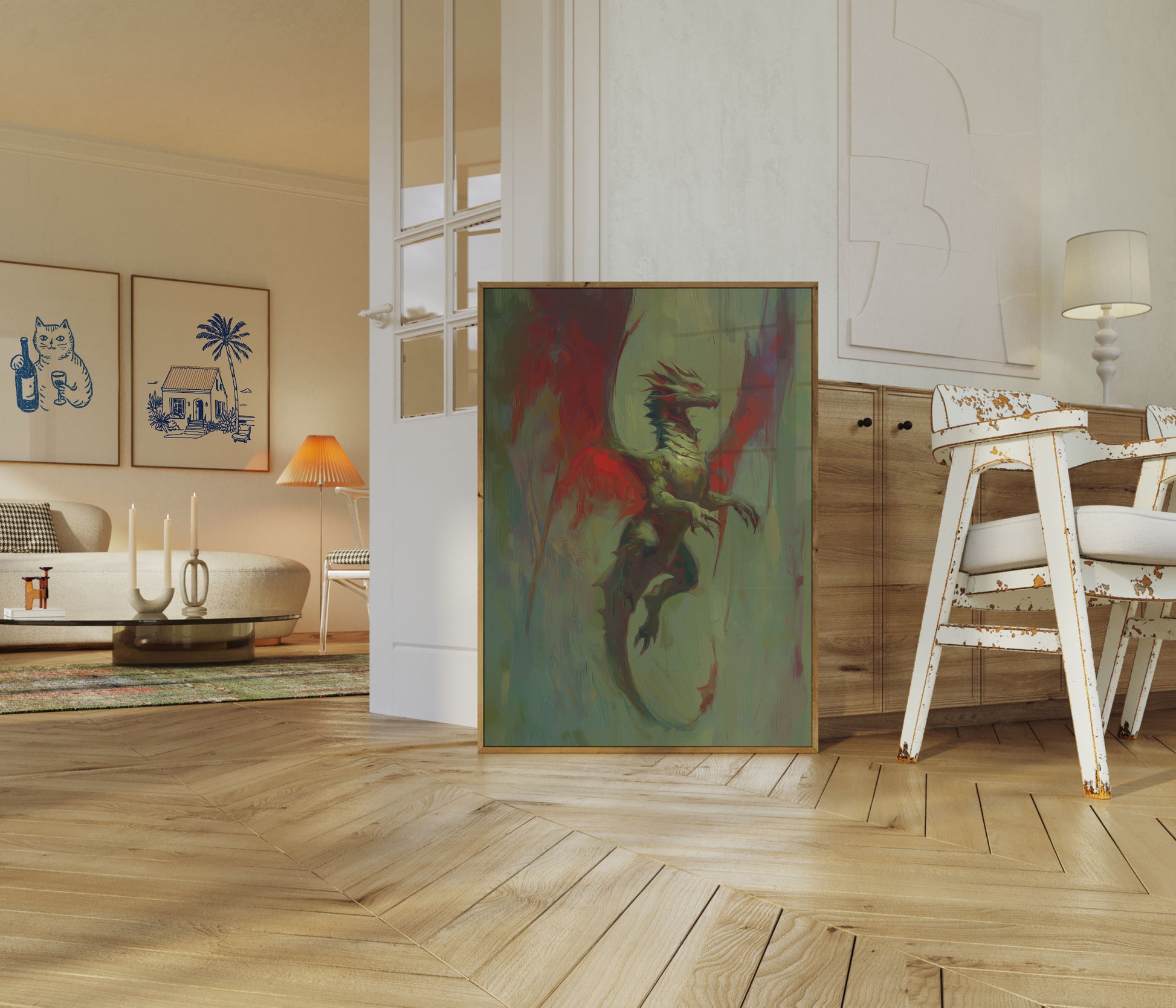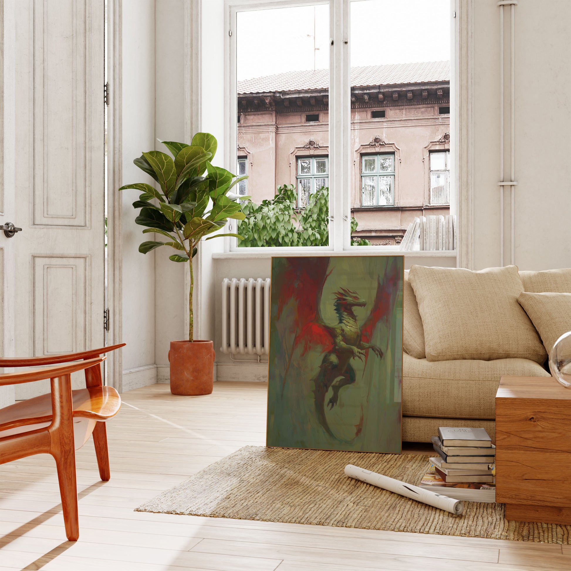 Emerge into a world of fierce fantasy with this stunning dragon art print, where vibrant red and muted green blend to create a mesmerizing atmospheric scene. The dragon appears mid-flight, its razor-sharp scales and dramatic pose capturing a moment of powerful, primal energy against a swirling, painterly background. Each brushstroke seems to pulse with the creature's intense, mythical spirit, making this poster a captivating statement piece for any fantasy art lover.