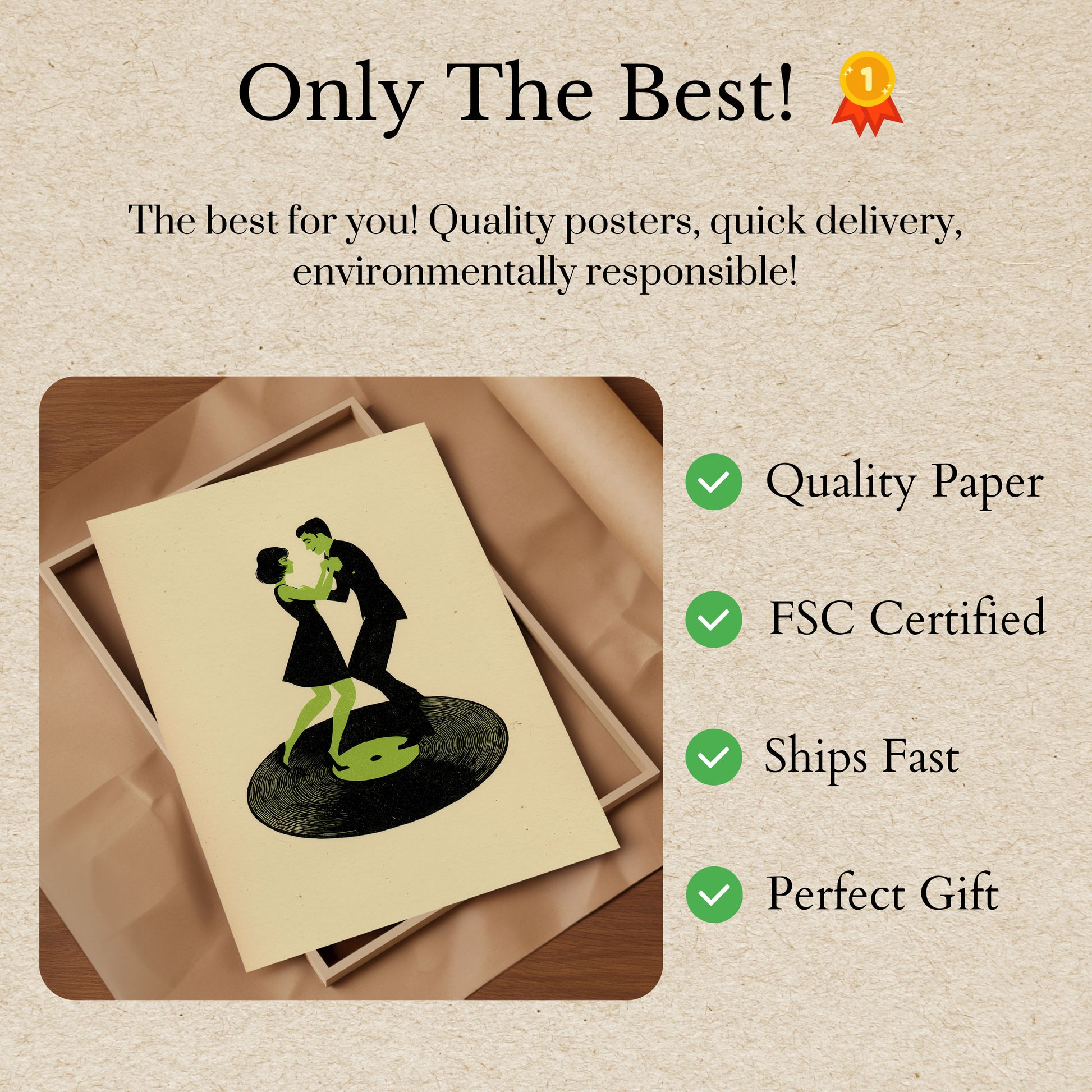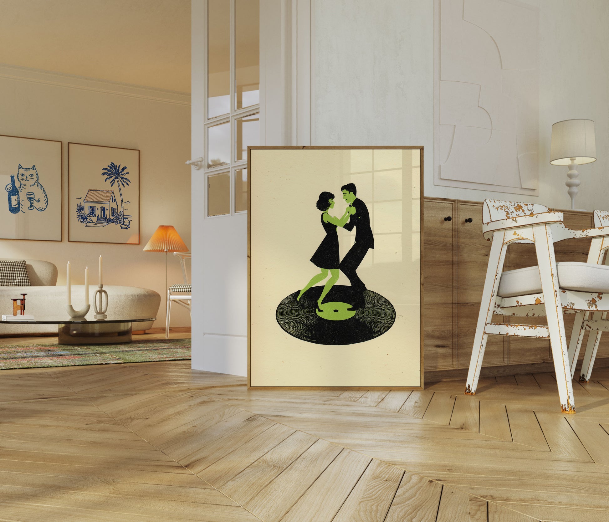 Step into the vibrant world of mid-century dance and music with this stylish green and black illustration. Two figures move gracefully atop a vinyl record, capturing the fluid motion and energy of a classic dance moment. The minimalist design and limited color palette create a striking visual that celebrates the timeless connection between music and movement.