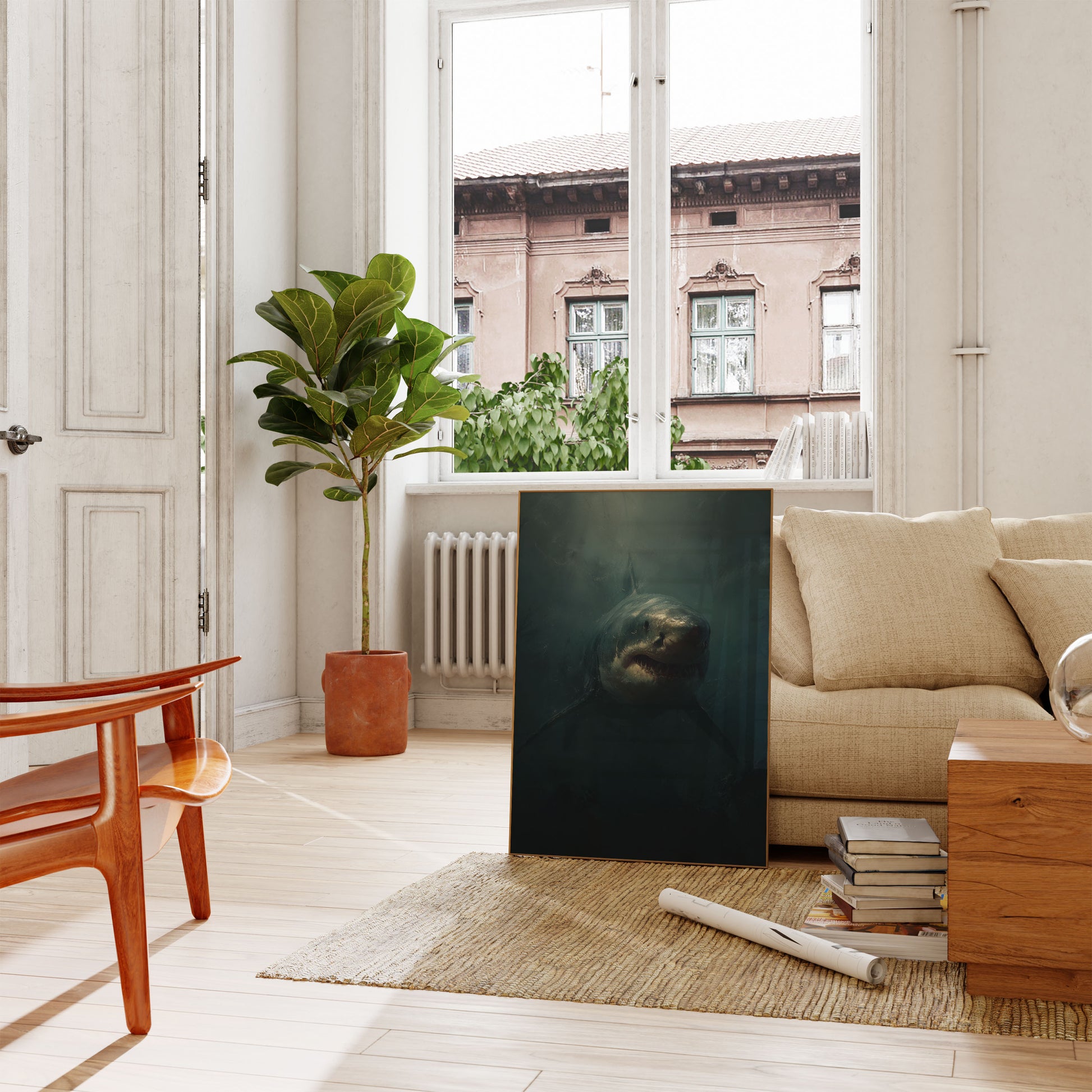 Emerge into the haunting depths of this mesmerizing great white shark poster, where mysterious marine shadows and ethereal green-blue tones create an intensely atmospheric underwater scene. The shark's powerful silhouette emerges from the murky darkness, revealing razor-sharp teeth and an almost primordial presence that commands both fear and respect. This striking artwork captures the raw, elemental power of one of nature's most magnificent predators.
