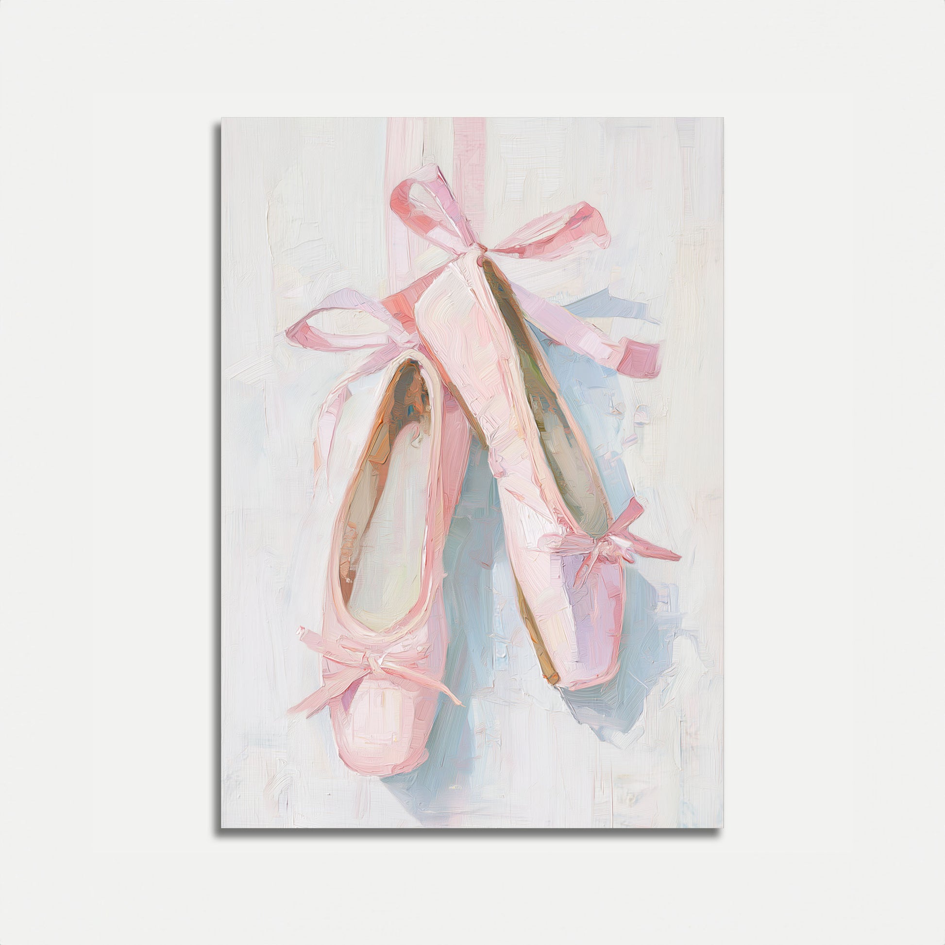 Immerse yourself in the soft, dreamy world of dance with these elegantly painted pink ballet pointe shoes. The artwork captures the graceful essence of ballet through delicate brushstrokes, featuring blush-toned shoes adorned with tender ribbons against a gentle blue-white background. Each stroke seems to whisper the poetry of movement and artistic expression.