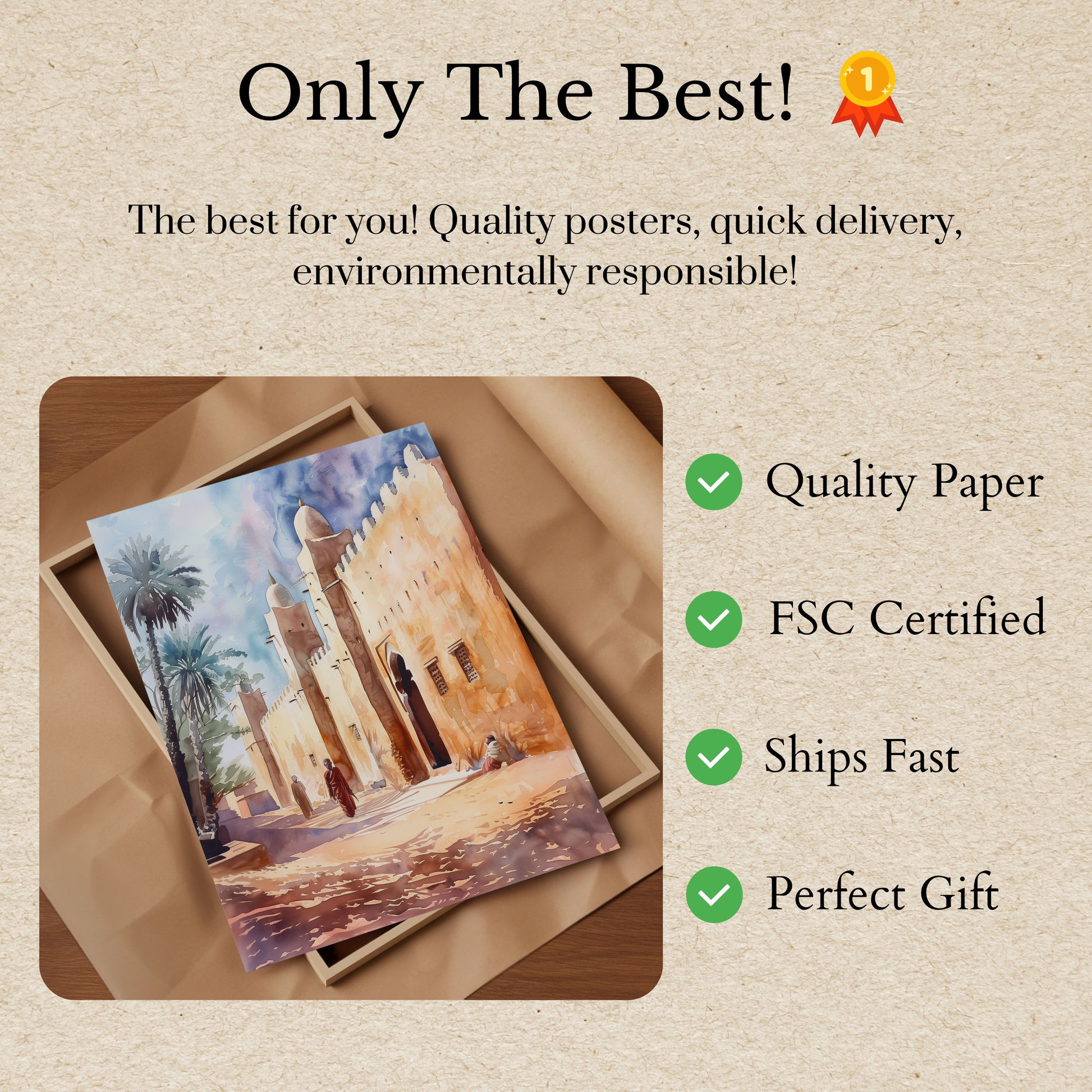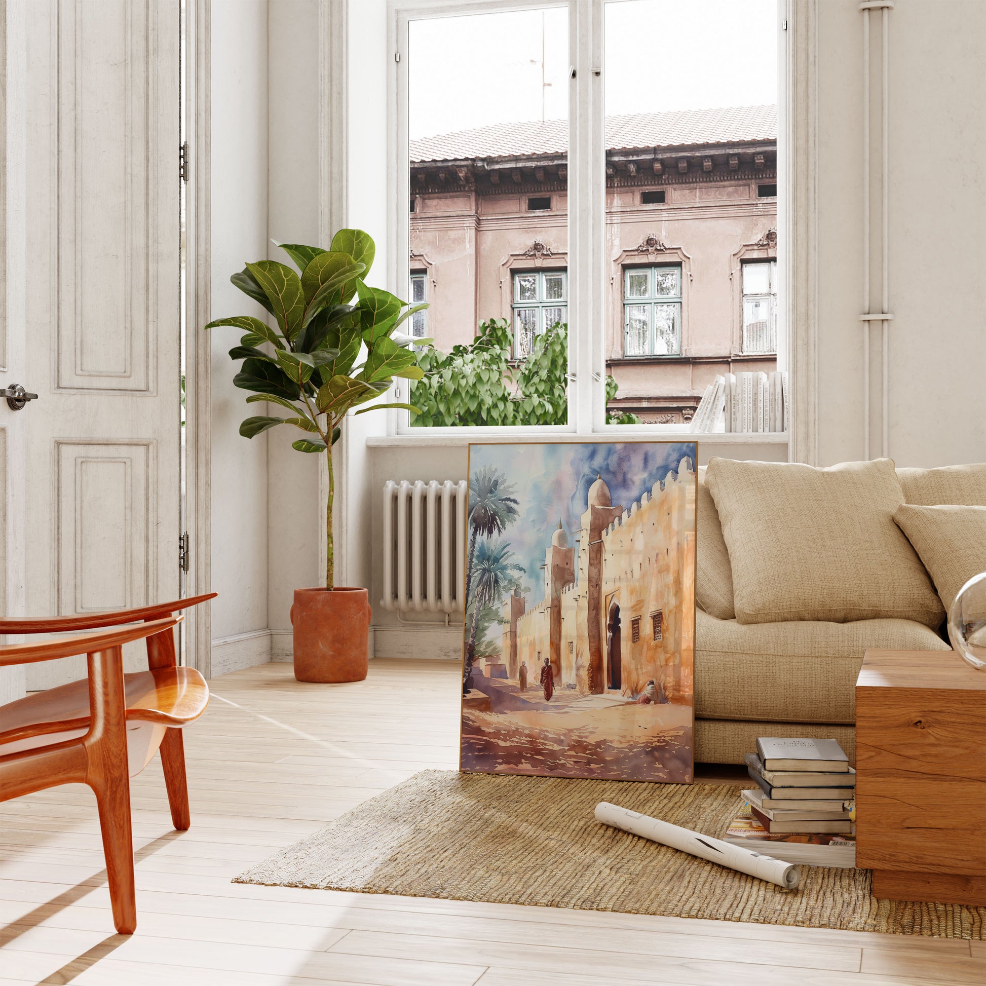 Transport yourself to a mesmerizing North African landscape with this stunning watercolor portrayal of an ancient walled city. Soft golden ochre walls rise against a dreamy blue sky, while palm trees cast gentle shadows and figures in traditional robes walk along the sunbaked street. The delicate watercolor technique captures the ethereal light and tranquil atmosphere of a timeless desert settlement, inviting viewers to lose themselves in this serene architectural scene.