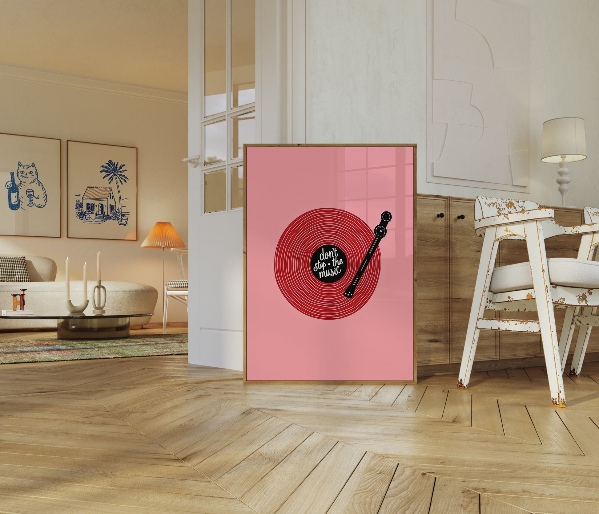 Immerse yourself in the vibrant world of music with this stunning minimalist design featuring a bold red vinyl record against a soft pink background. The iconic turntable and playful 'don't stop the music' text capture the essence of musical passion and rhythm, creating a must-have piece for music lovers and design enthusiasts alike. This poster celebrates the timeless beauty of analog sound with its clean, graphic approach and eye-catching color palette.