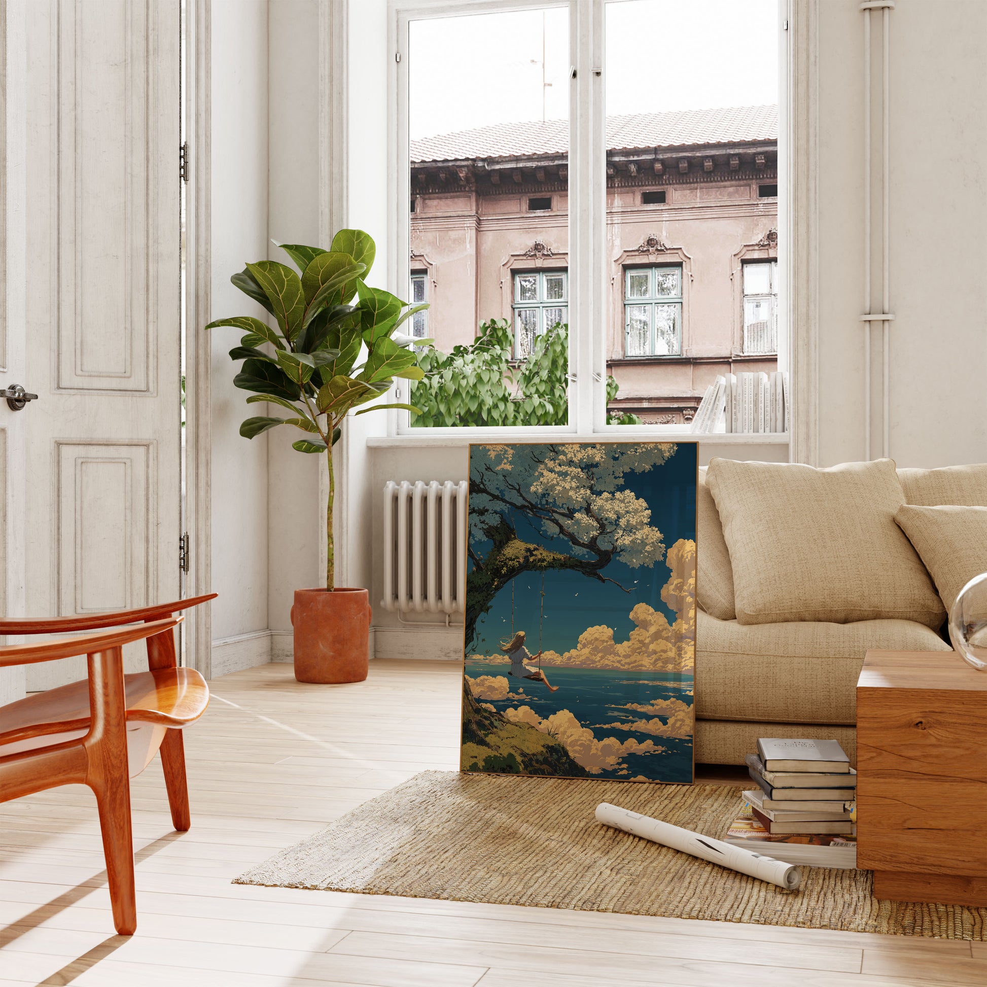 Float away into a mesmerizing landscape where imagination meets tranquility. A delicate figure swings gently from an ancient tree, suspended between earth and sky, surrounded by a sea of golden clouds and a deep azure backdrop. The intricate details of the tree's blossoming branches and the soft movement of the swing create a dreamlike scene that invites viewers to escape into a world of serene contemplation.