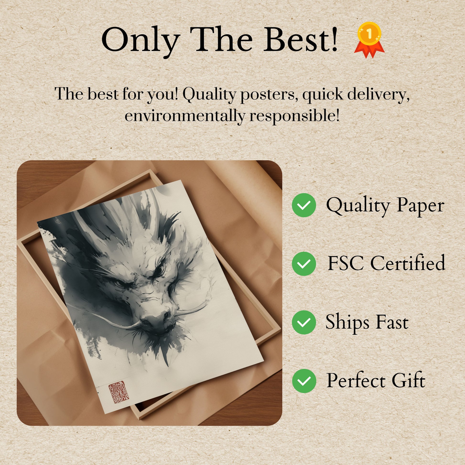 Immerse yourself in the raw power and mystical energy of this stunning Chinese dragon artwork. Rendered in dramatic black and white, the ink wash technique captures the dragon's intense gaze and dynamic, fluid form, creating a mesmerizing visual experience that seems to pulse with ancient spiritual energy. The expressive brushstrokes bring the mythical creature to life, transforming the poster into a portal of mythological wonder.