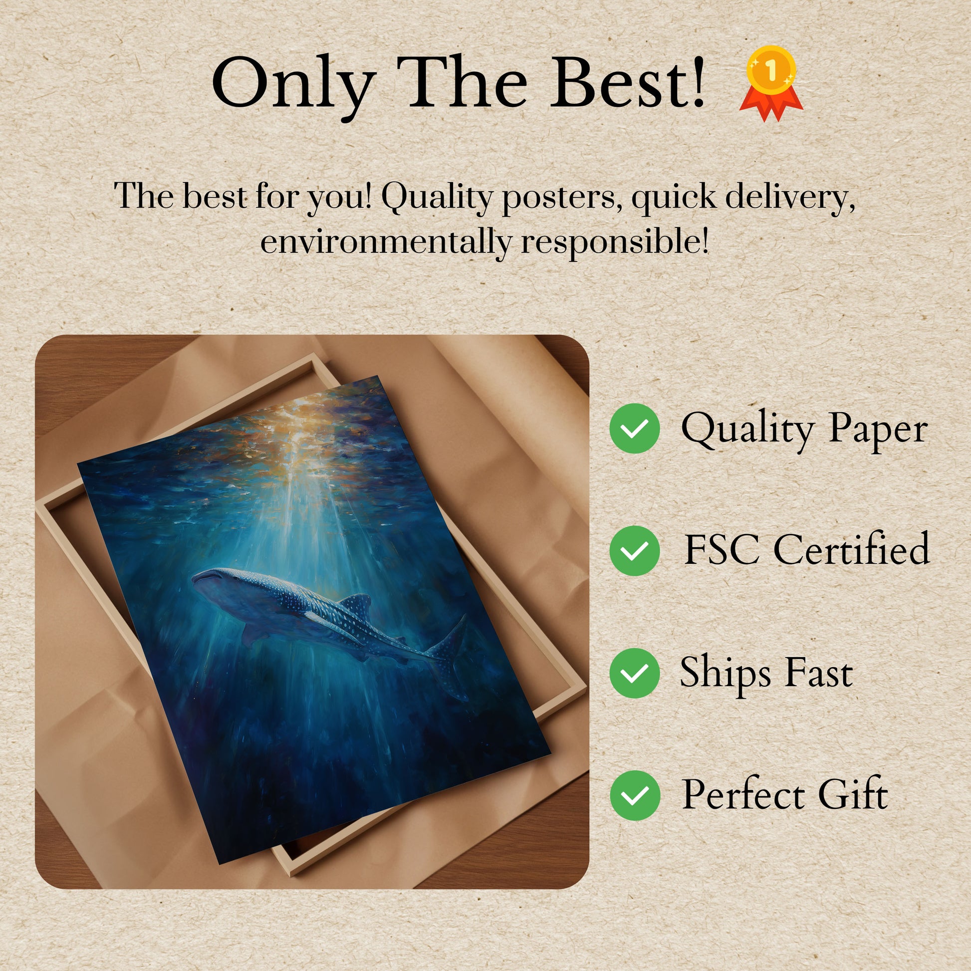 Dive into the mesmerizing depths of the ocean with this breathtaking whale shark artwork. Luminous sunlight streams through azure waters, casting an ethereal glow on the majestic spotted whale shark gliding gracefully through the deep blue. The painting captures a moment of serene underwater magic, with vibrant blue and golden tones creating a sense of wonder and tranquility that will transform any room.
