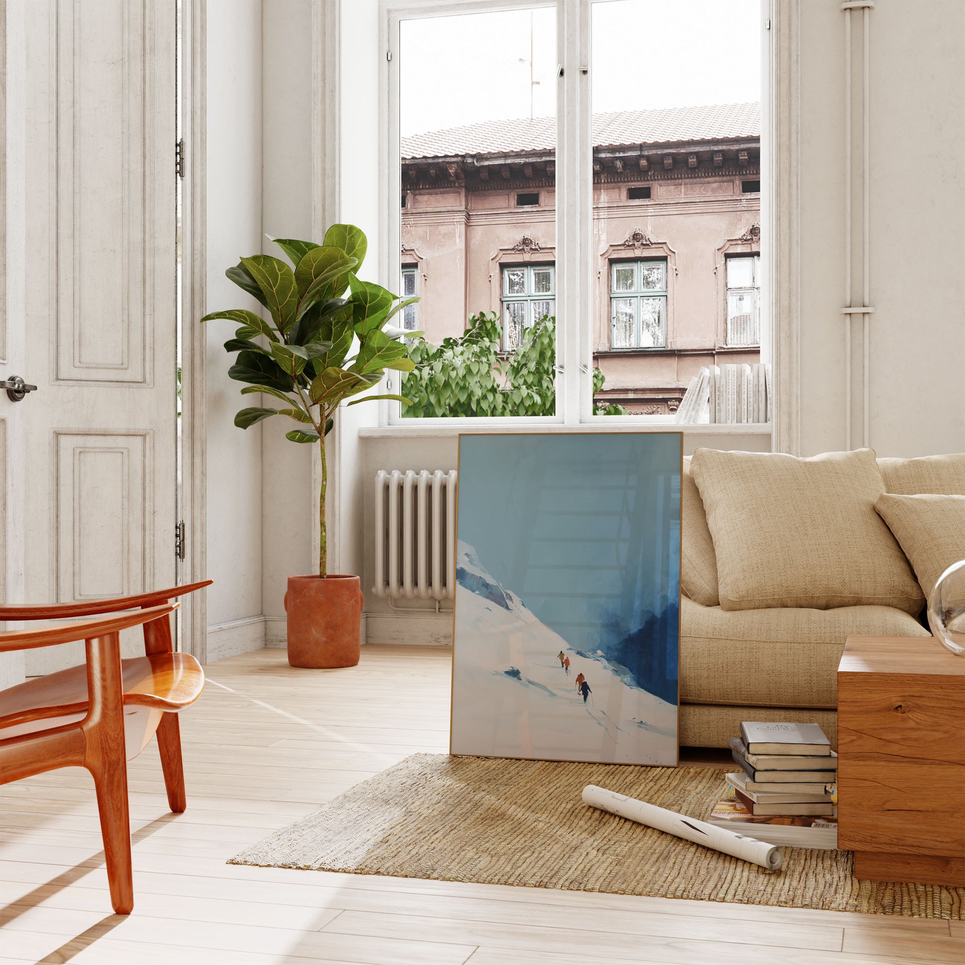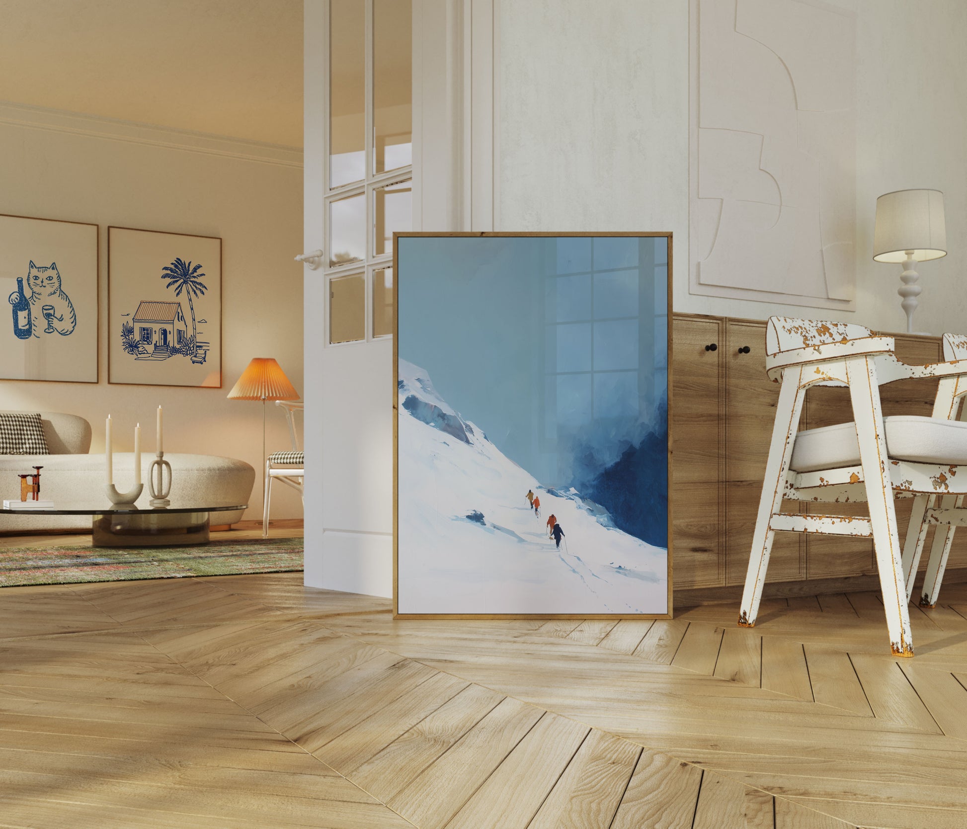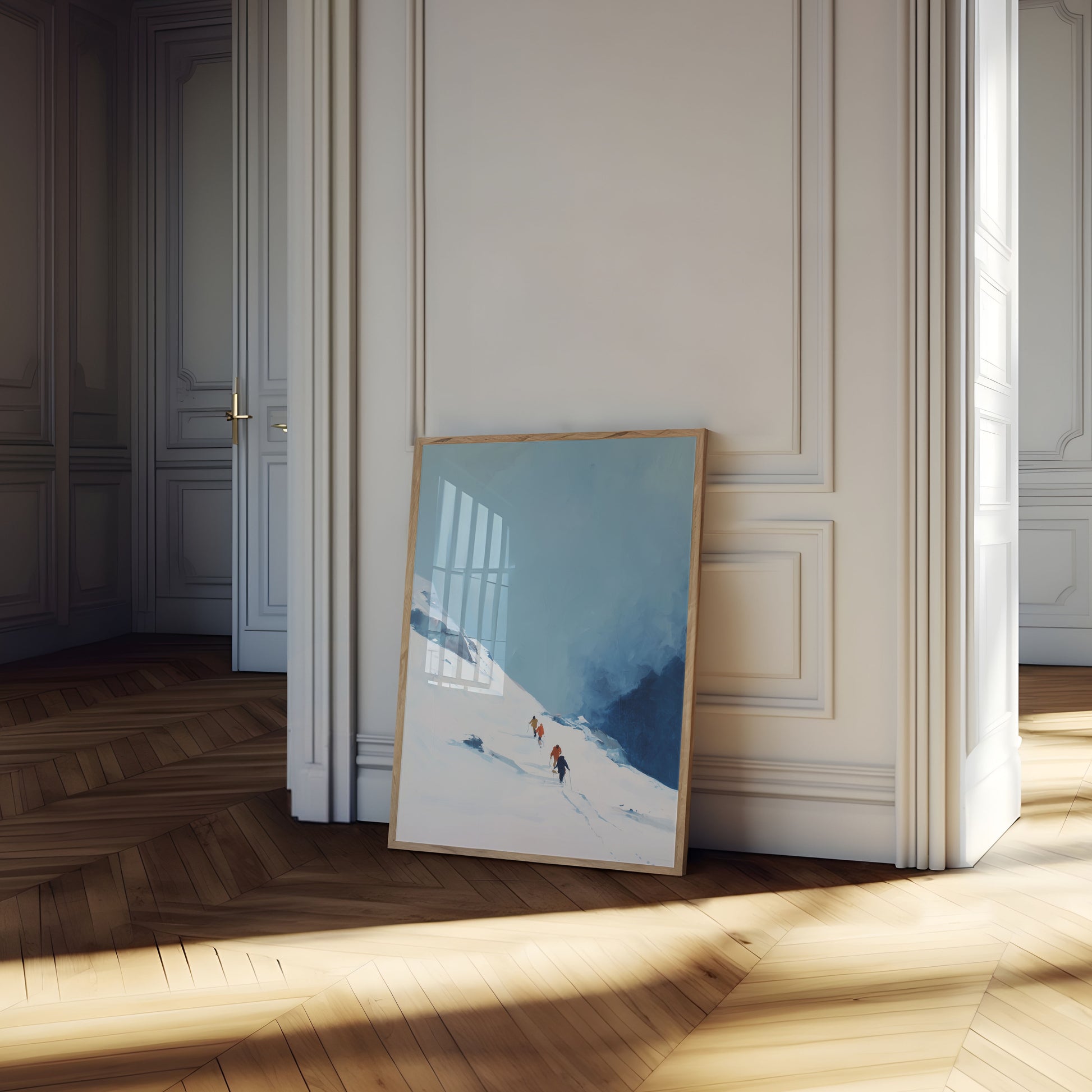 Experience the breathtaking solitude of alpine mountaineering with this stunning winter landscape capturing a group of climbers ascending a snow-covered slope against a dramatic blue backdrop. The soft color palette and minimalist composition evoke the serene yet challenging nature of high-altitude expedition, inviting viewers into a world of pristine wilderness and human endurance.