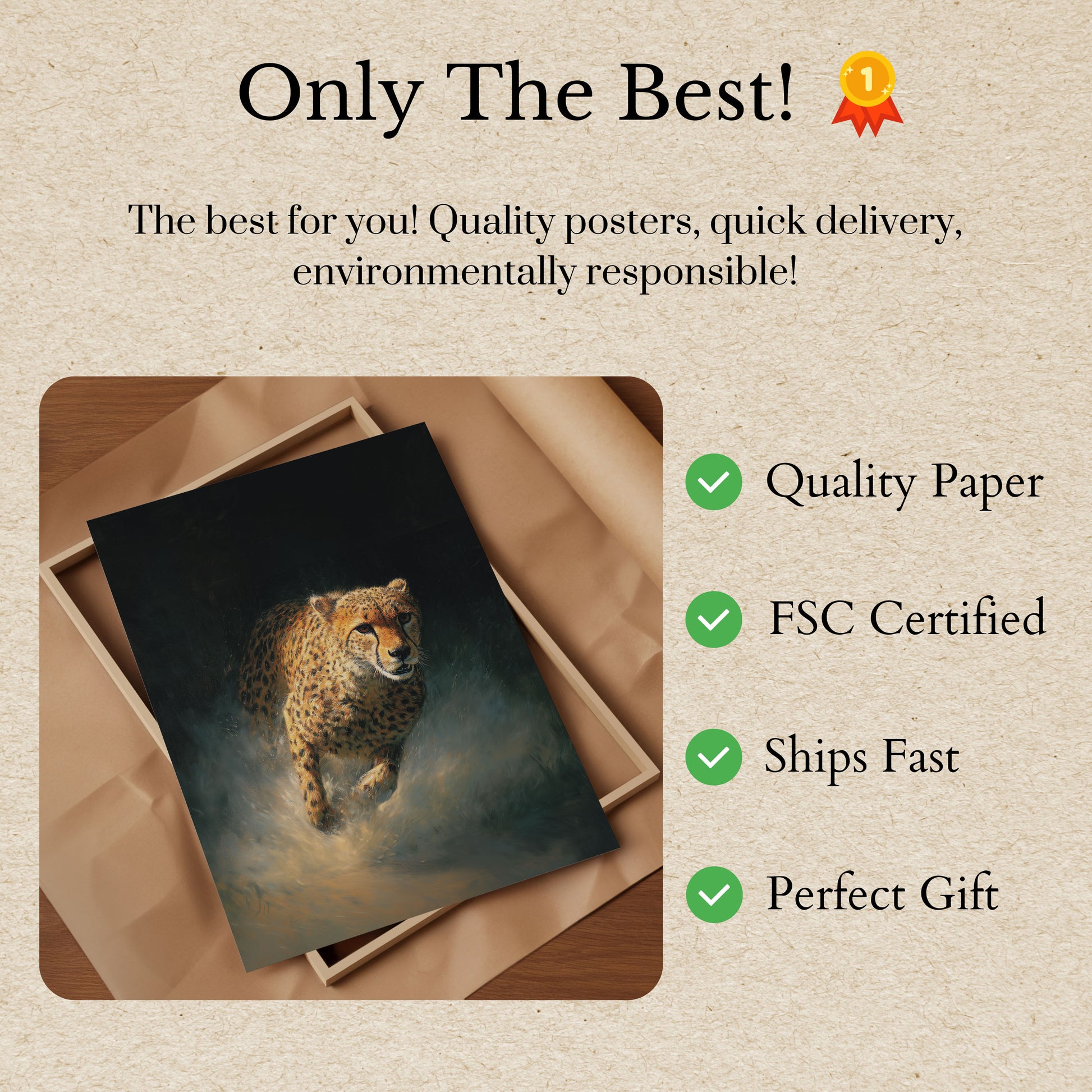 Capture the raw power and intensity of a cheetah in motion with this stunning wildlife art piece. The painting depicts a majestic cheetah mid-sprint, its spotted coat illuminated against a dark, atmospheric background. Dramatic lighting and swirling dust create a sense of explosive movement, showcasing the incredible speed and grace of this magnificent predator.