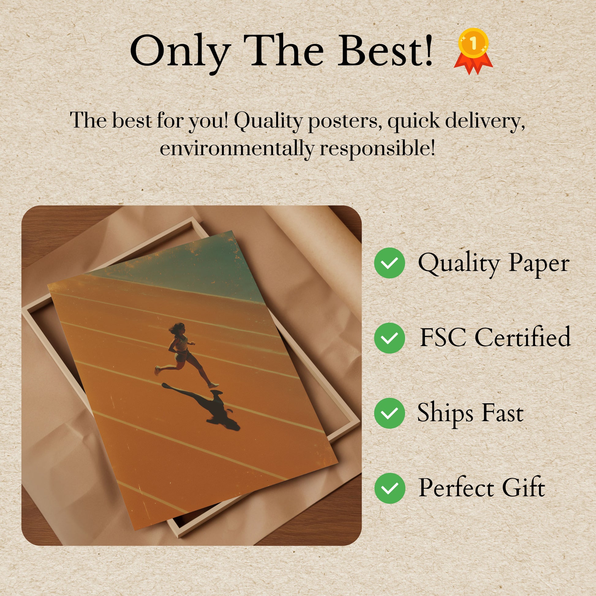 Capture the essence of athletic determination with this stunning running poster that showcases a solo athlete mid-stride on a sun-drenched track. The warm orange hues and dramatic shadow create a powerful visual narrative of motion, discipline, and personal triumph. Every element of this image breathes inspiration, from the intense color palette to the dynamic pose that represents the raw energy of athletic performance.
