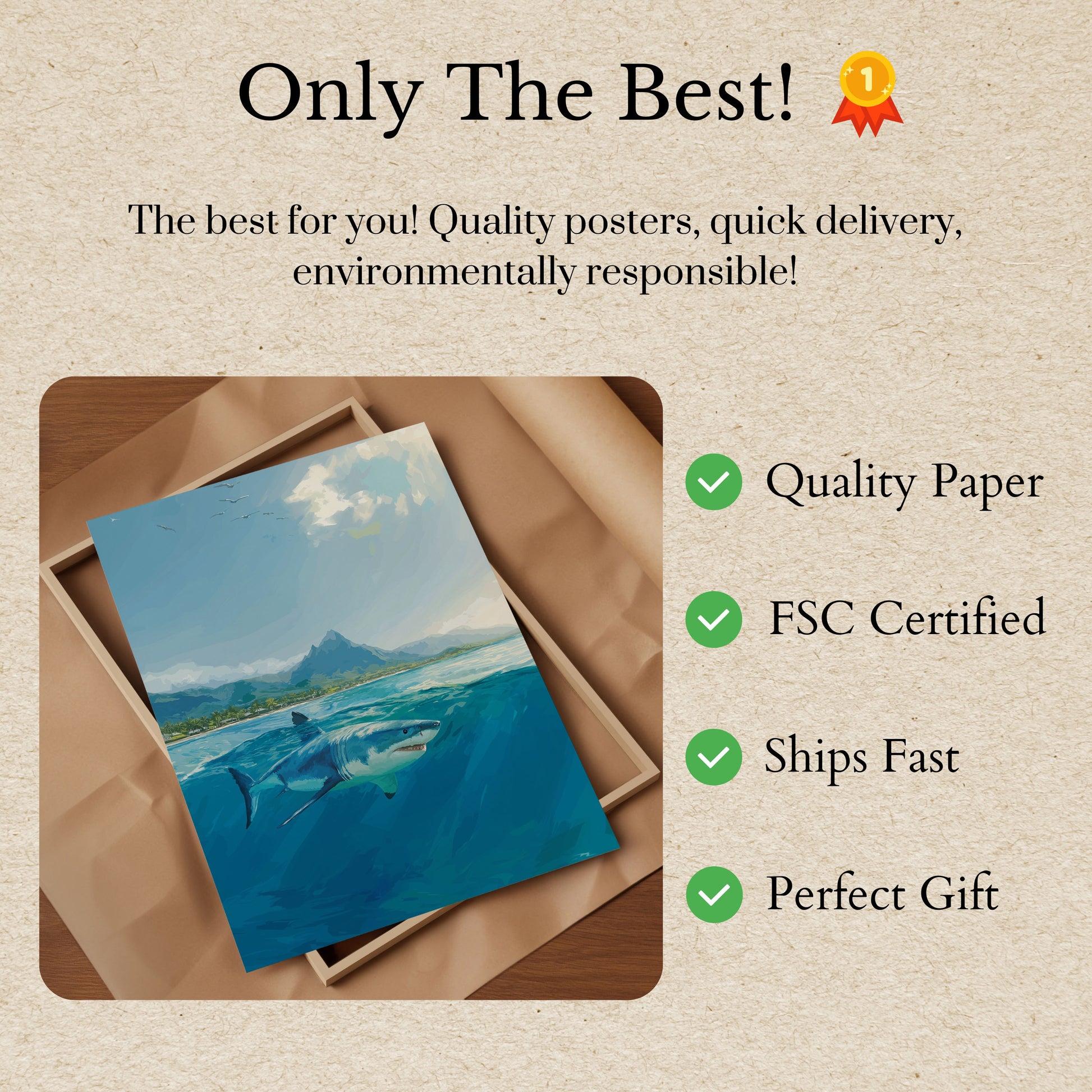 Dive into the mesmerizing world of marine majesty with this stunning coastal scene featuring a powerful great white shark gliding through crystalline turquoise waters. The artwork captures the shark's sleek silhouette against a breathtaking backdrop of lush tropical mountains and a serene sky, creating a profound sense of oceanic wonder and raw natural beauty. Every brushstroke brings the marine predator to life with incredible detail and dynamic energy.