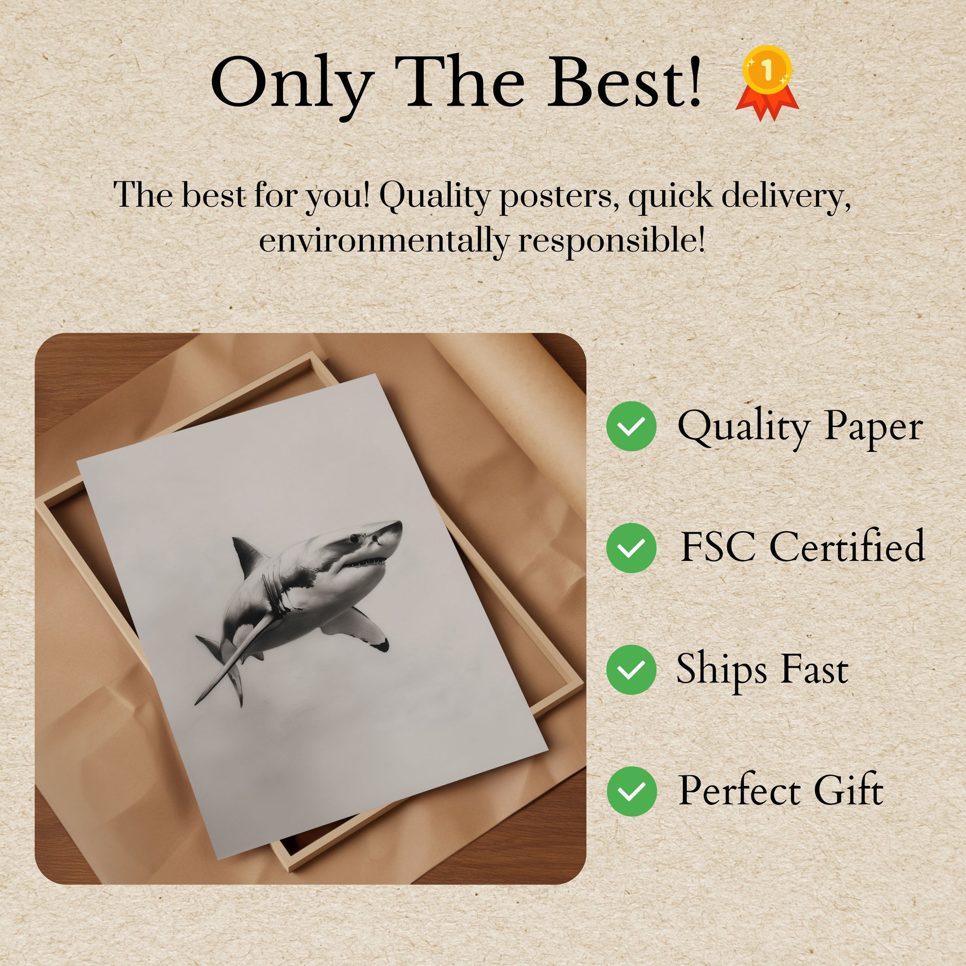 Dive into the mesmerizing world of marine predators with this stunning black and white shark illustration. Captured in exquisite detail, this artwork showcases the powerful, sleek silhouette of a great white shark, rendered with incredible depth and realism against a soft, ethereal background. The monochromatic palette emphasizes the shark's muscular form and distinctive features, creating a captivating visual experience that speaks to the raw beauty of ocean wildlife.