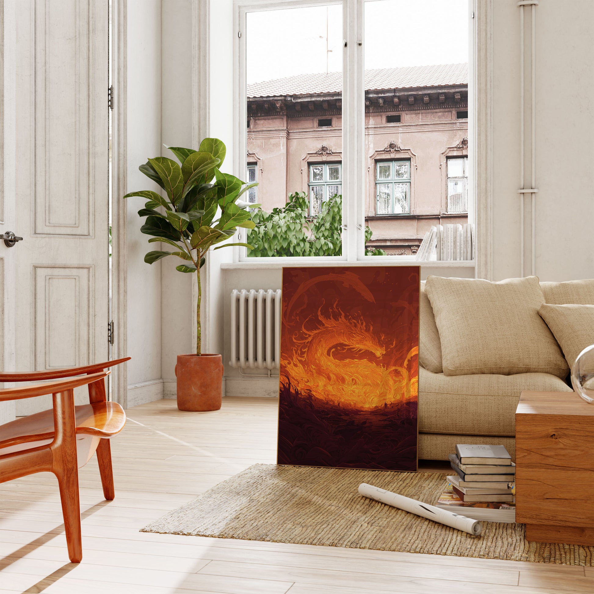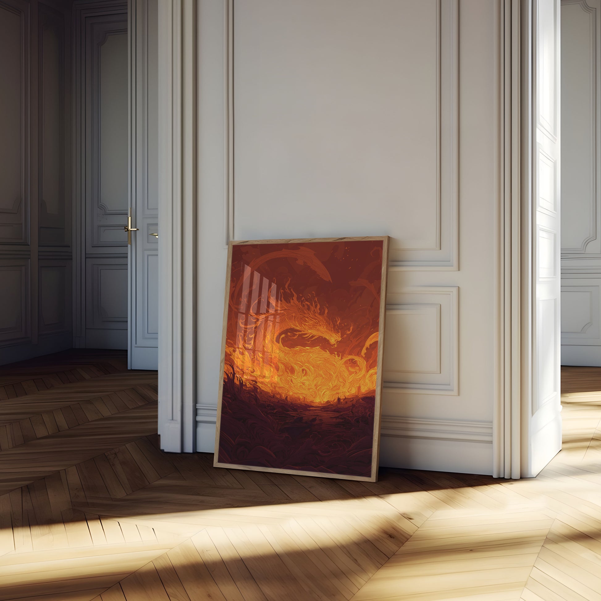 Witness the raw, elemental power of a magnificent fire dragon erupting from a scorched landscape in this breathtaking illustration. Swirling in intense shades of orange, yellow, and deep crimson, the dragon appears to be both creator and destroyer, its body seamlessly blending with the raging flames that consume everything in its path. The artwork captures a moment of pure, primal energy - a stunning visual representation of destruction and rebirth.