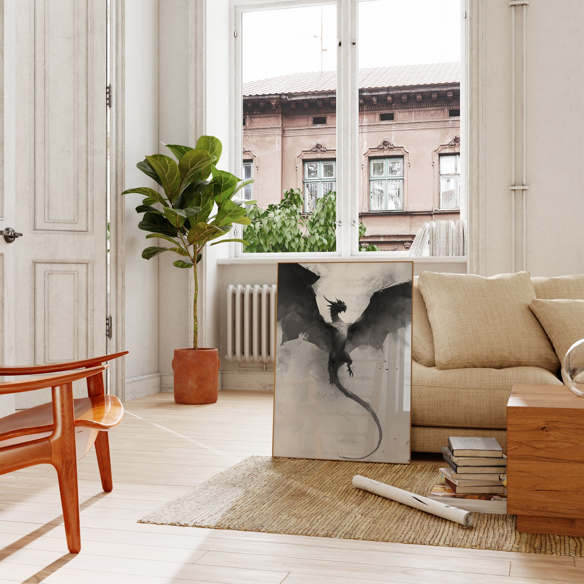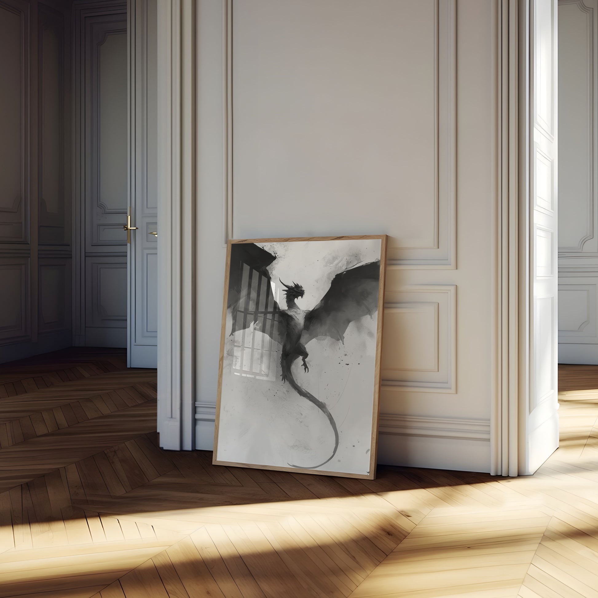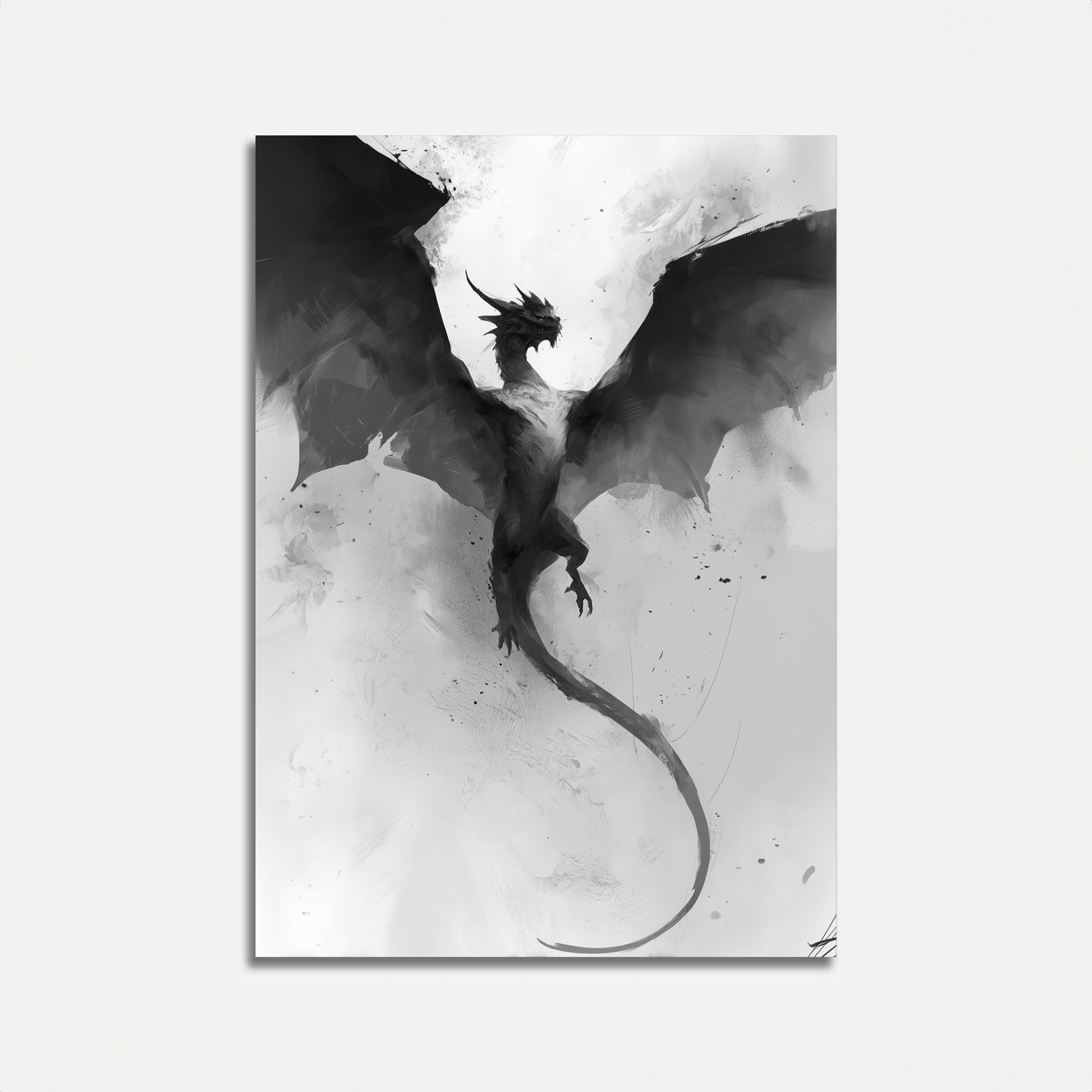 Immerse yourself in the dramatic world of this monochromatic dragon artwork, where a powerful winged creature soars through misty, ethereal space. The black and white illustration captures the raw intensity and mystical essence of a dragon in mid-flight, its sharp edges and dynamic pose creating a sense of untamed power and ancient mystery. Every brushstroke and ink splatter adds depth and movement to this captivating fantasy design.