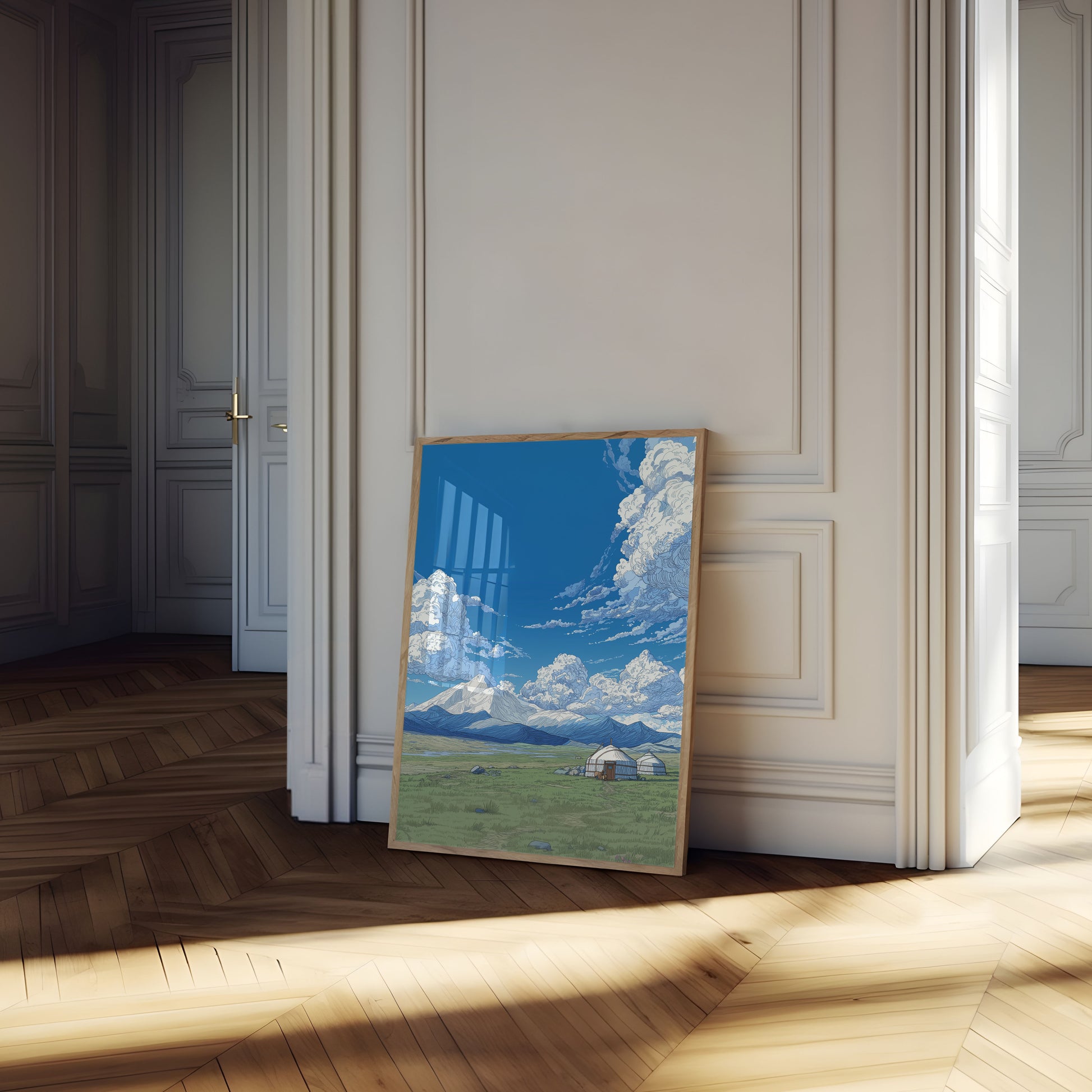 Immerse yourself in the breathtaking beauty of the Mongolian wilderness with this stunning landscape illustration. Majestic snow-capped mountains rise against a vibrant blue sky filled with billowing clouds, while traditional yurts rest peacefully in the foreground of a lush green grassland. The intricate line work and rich color palette capture the serene and expansive nature of the Mongolian steppe, inviting viewers to lose themselves in this tranquil scene of natural wonder and nomadic life.