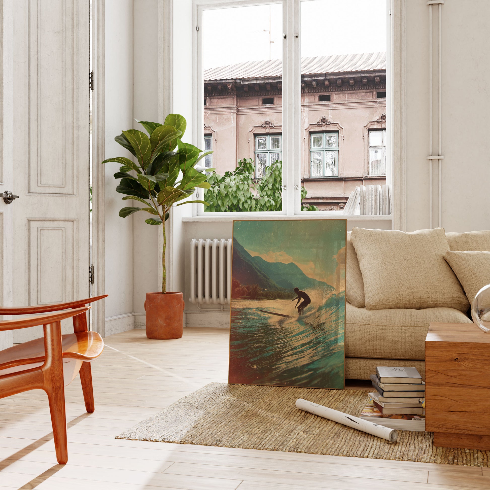 Dive into the breathtaking world of coastal surfing with this mesmerizing vintage-style poster capturing a lone surfer riding a spectacular turquoise wave. Dramatic mountain peaks rise in the background, creating a stunning contrast of natural beauty and athletic motion. The image's warm, textured tones and dynamic wave spray evoke the raw energy and freedom of surfing against an epic landscape.