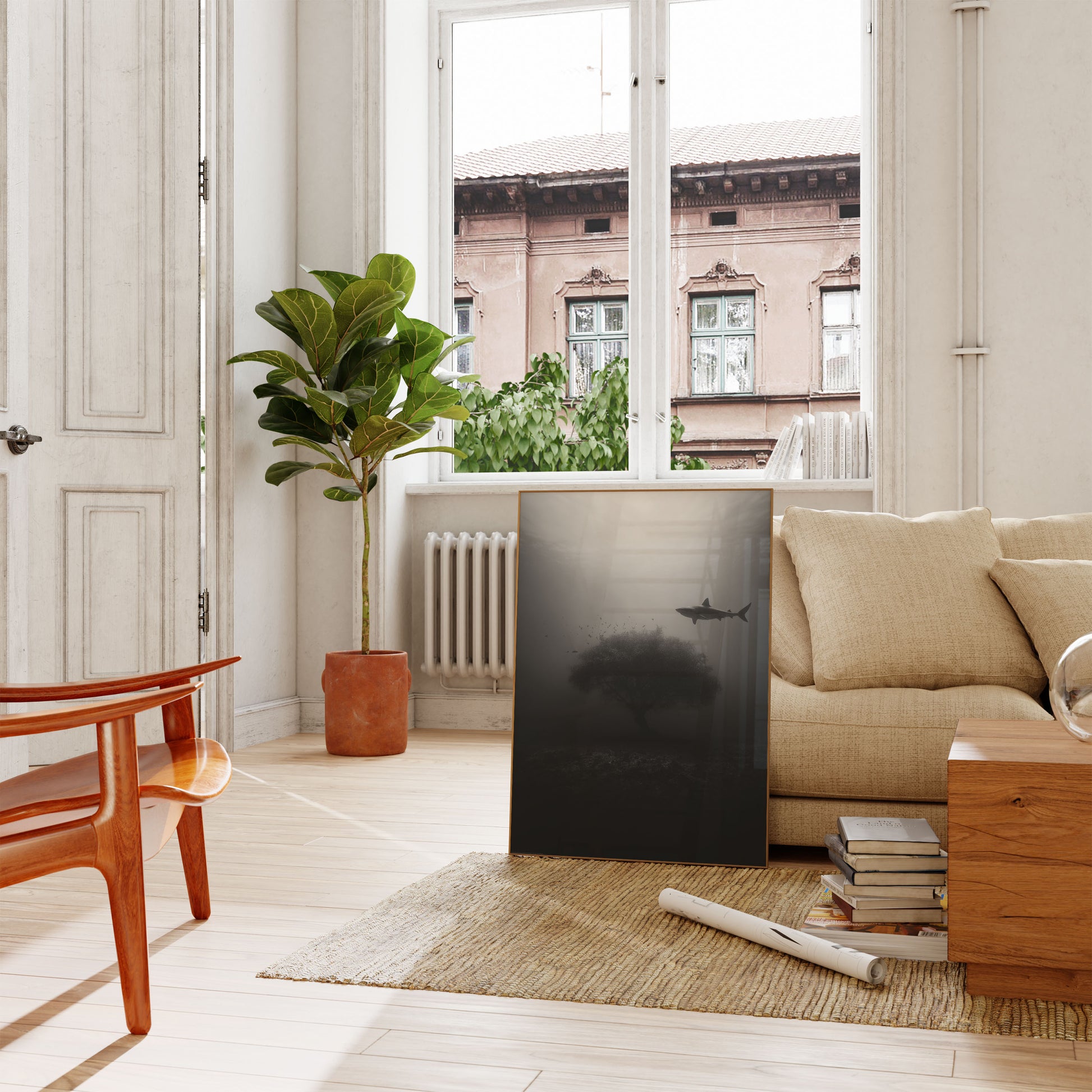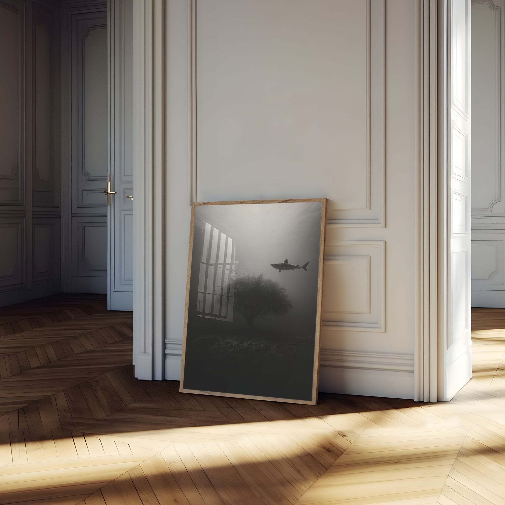 Dive into the haunting depths of the ocean with this mesmerizing black and white underwater scene. A solitary shark glides gracefully near a misty, ethereal tree-like formation, surrounded by a cloud of small fish. The image captures the mysterious and enigmatic world beneath the waves, with dramatic light filtering through the murky water and creating an atmospheric, almost dreamlike composition.