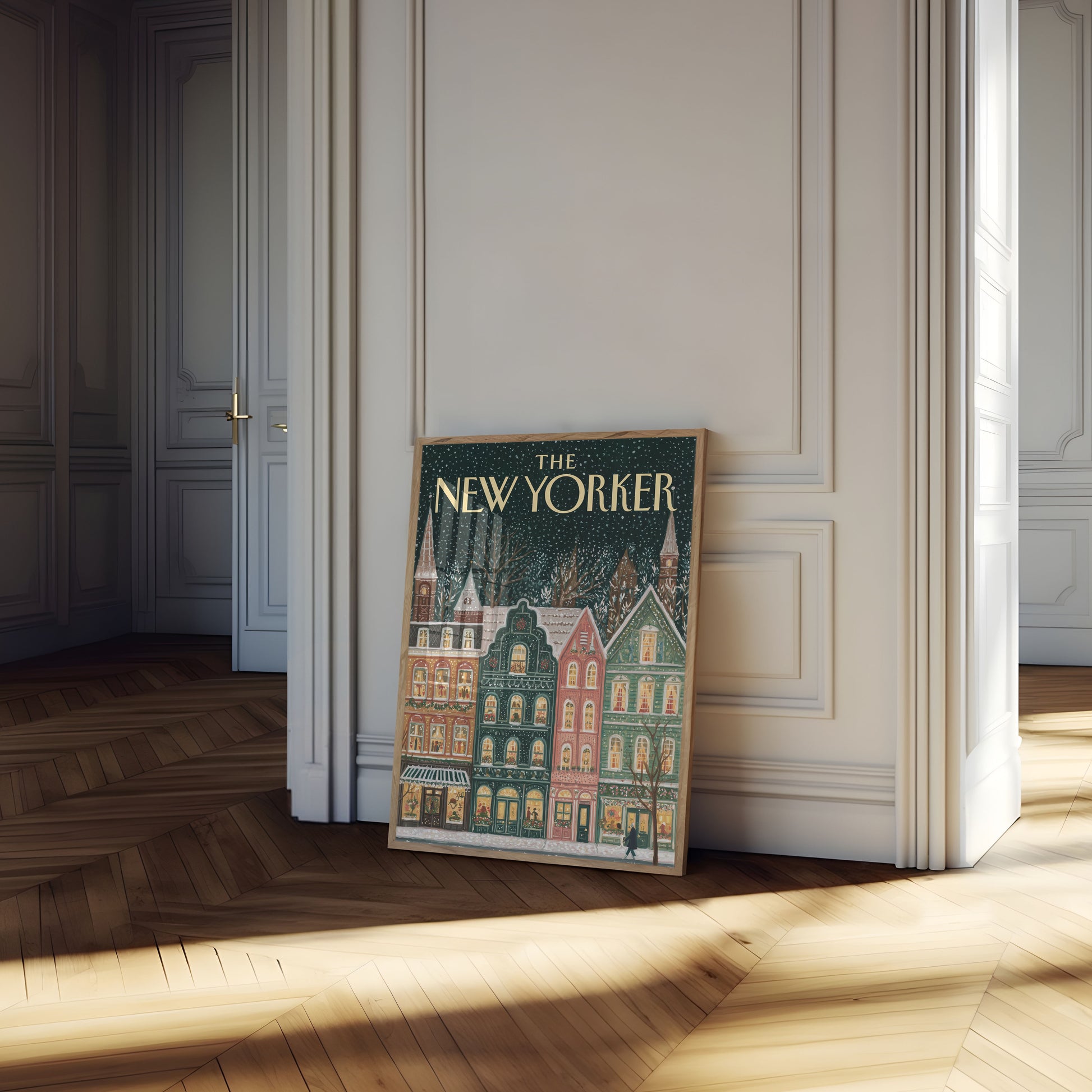 Step into a magical winter scene straight from The New Yorker's enchanting cover art, featuring a charming streetscape of decorated townhouses glowing warmly against a snowy night. Delicate snowflakes drift across a deep emerald sky, illuminating intricate architectural details of brownstones and shops with golden-lit windows revealing festive glimpses of life inside. Each building tells a story, from the ornate green townhouse to the cozy pink row house, creating a nostalgic tableau of urban winter charm.