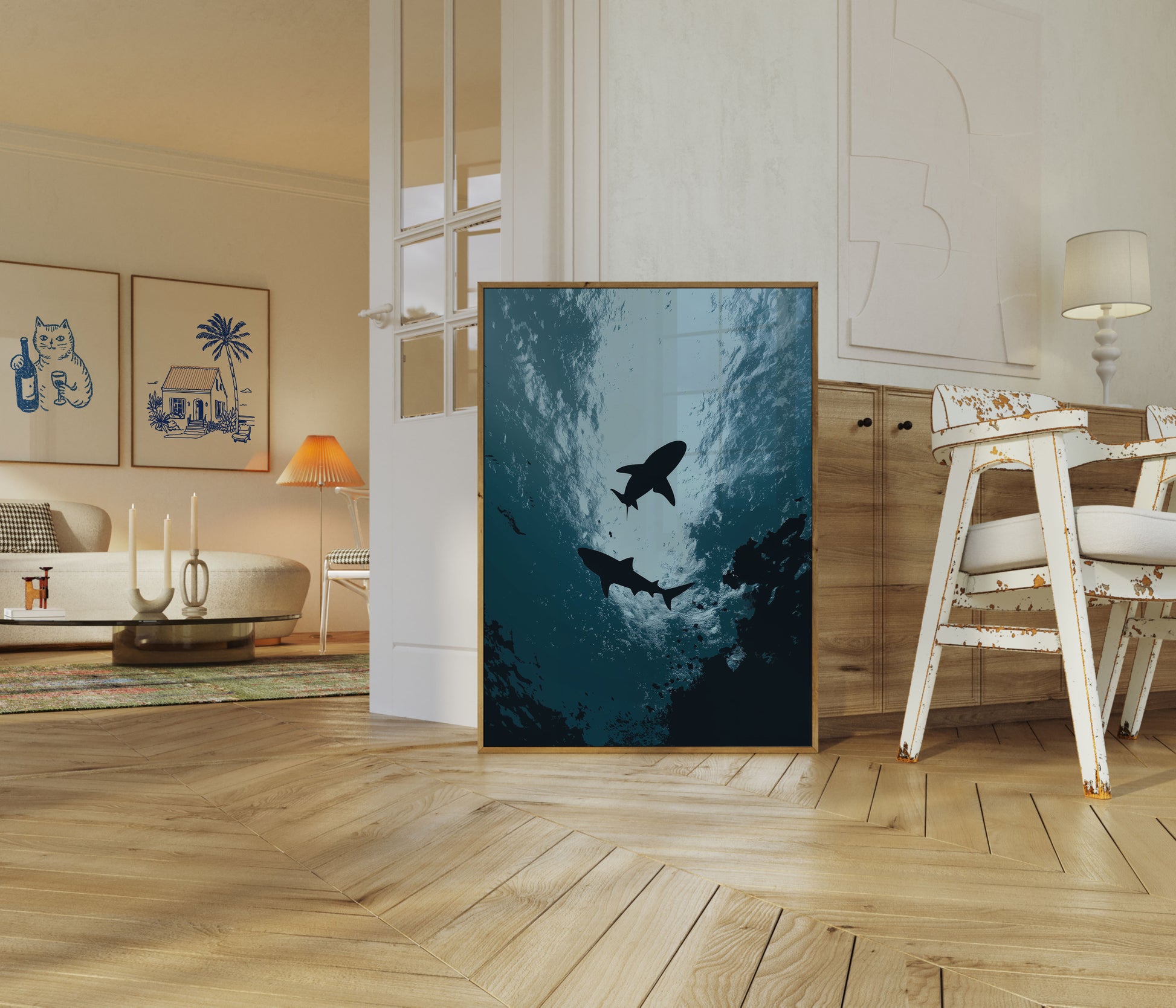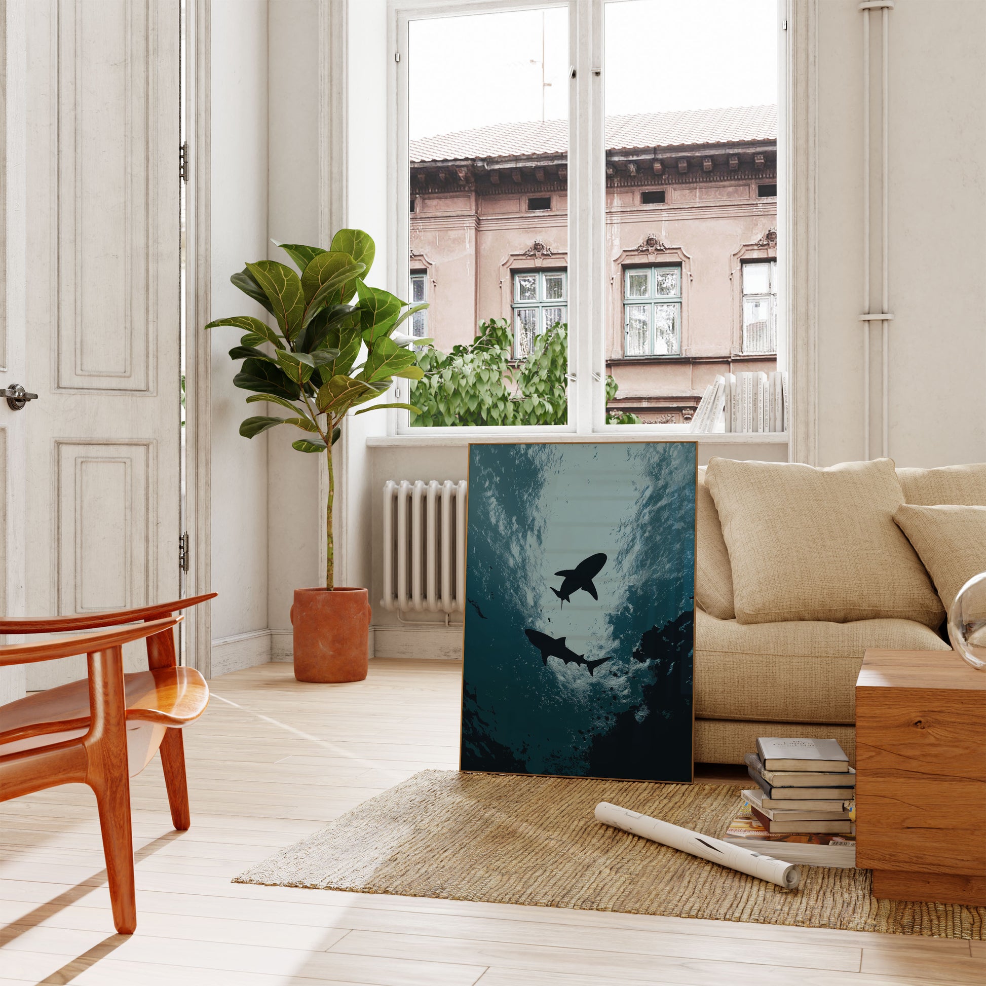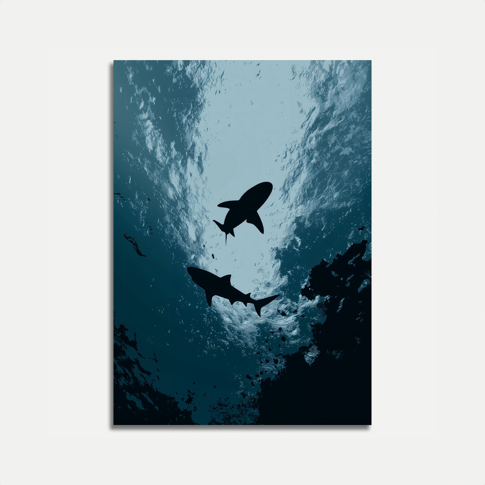 Dive into the mysterious depths of the ocean with this haunting underwater scene featuring two sharks gliding through a moody, blue-green seascape. The silhouetted marine creatures create a powerful visual narrative of marine wilderness, capturing the raw elegance and primal beauty of these apex predators against a textured, turbulent underwater backdrop. Every glance reveals new details in this mesmerizing underwater exploration.