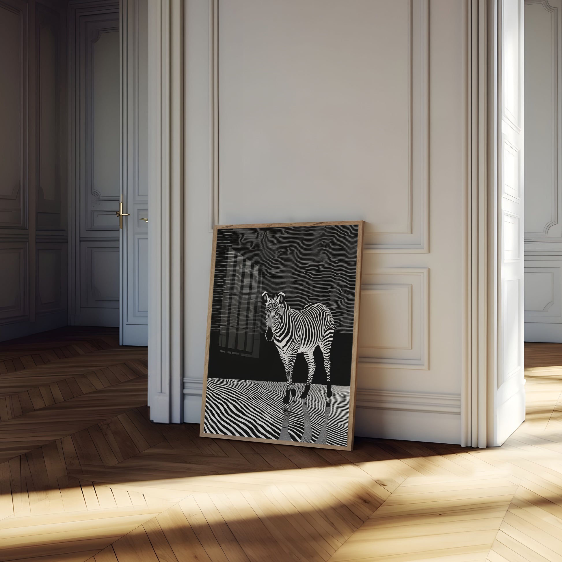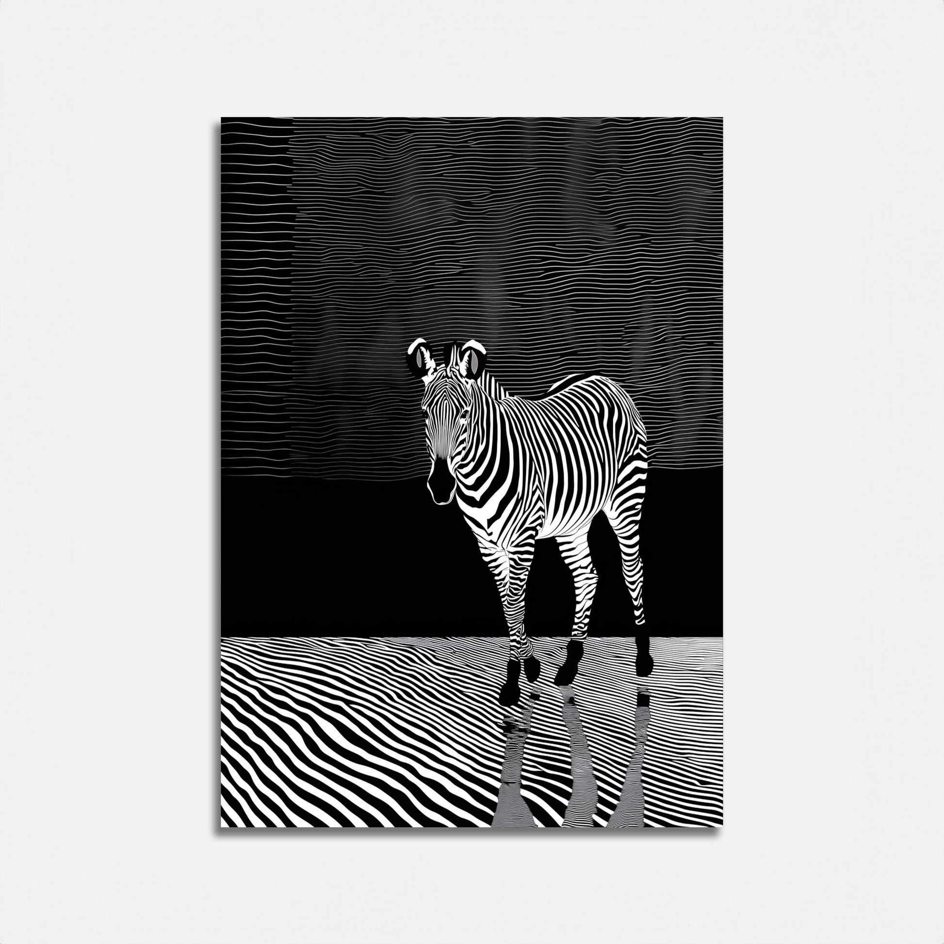 Step into a mesmerizing world of black and white with this stunning zebra poster that blends optical illusion and wildlife art. The striking zebra emerges from a rippling, wave-like background, creating a hypnotic visual experience that challenges perception and celebrates the animal's iconic striped pattern. Each line and contour seems to pulse and flow, transforming the traditional wildlife portrait into a dynamic, modern art piece.