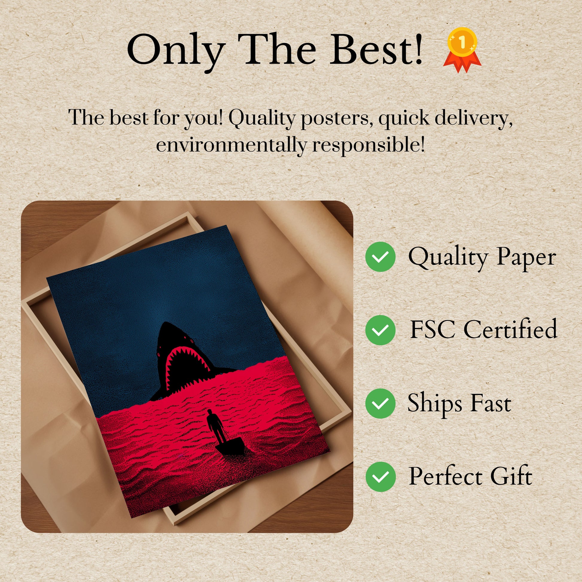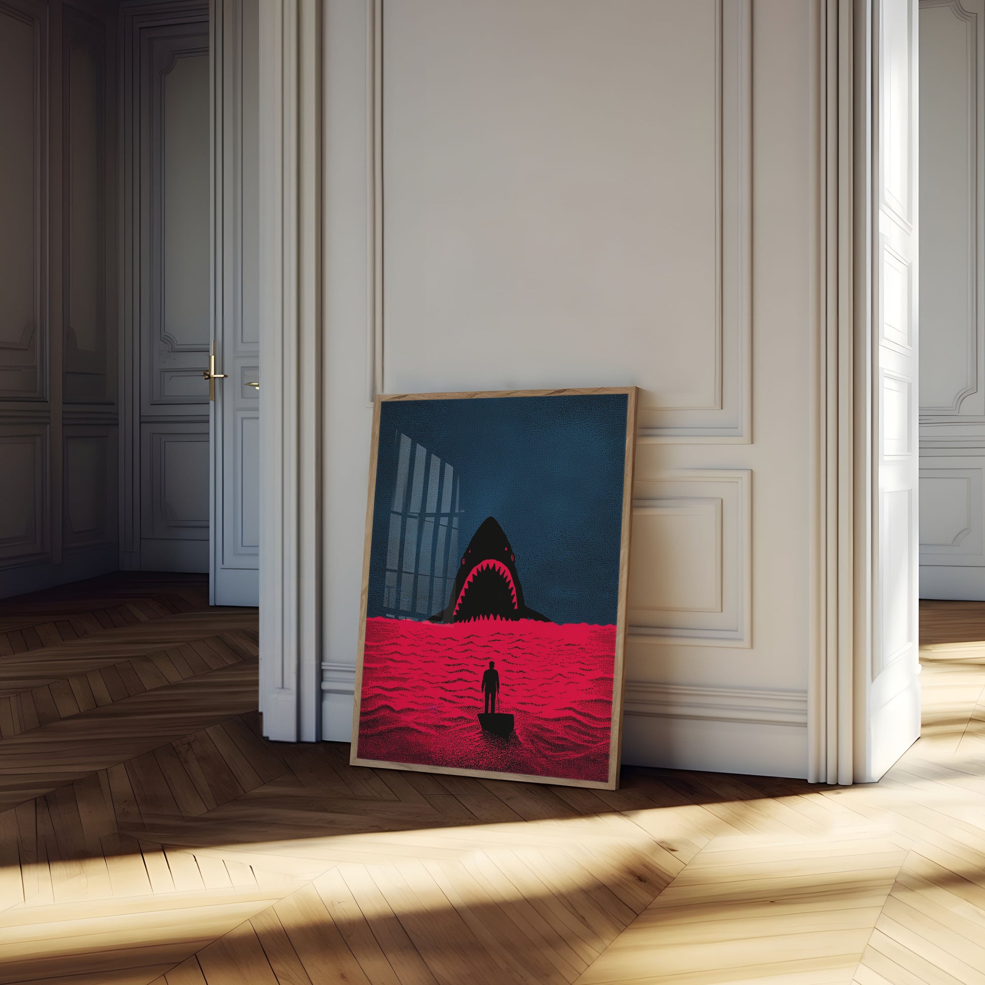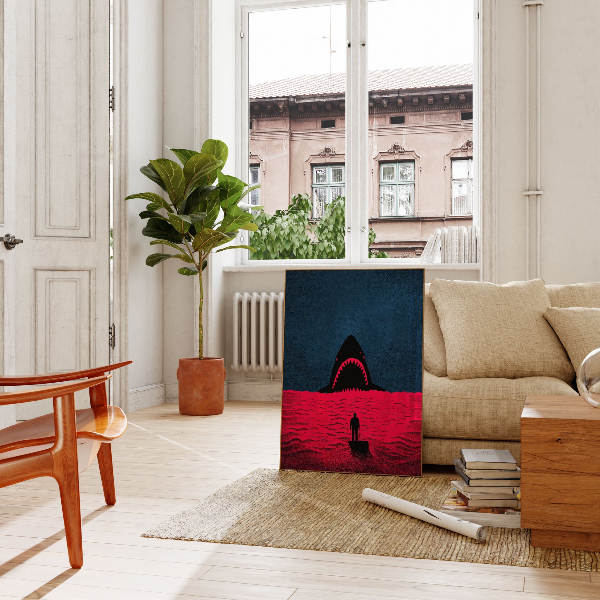 A haunting graphic art print that captures the primal terror of the ocean's most feared predator. Set against a stark red and blue background, a massive shark emerges with menacing jaws, while a lone silhouetted figure stands vulnerable in a small boat, creating a visceral sense of impending danger. The minimalist design and high-contrast color palette amplify the raw, elemental drama of this marine encounter.