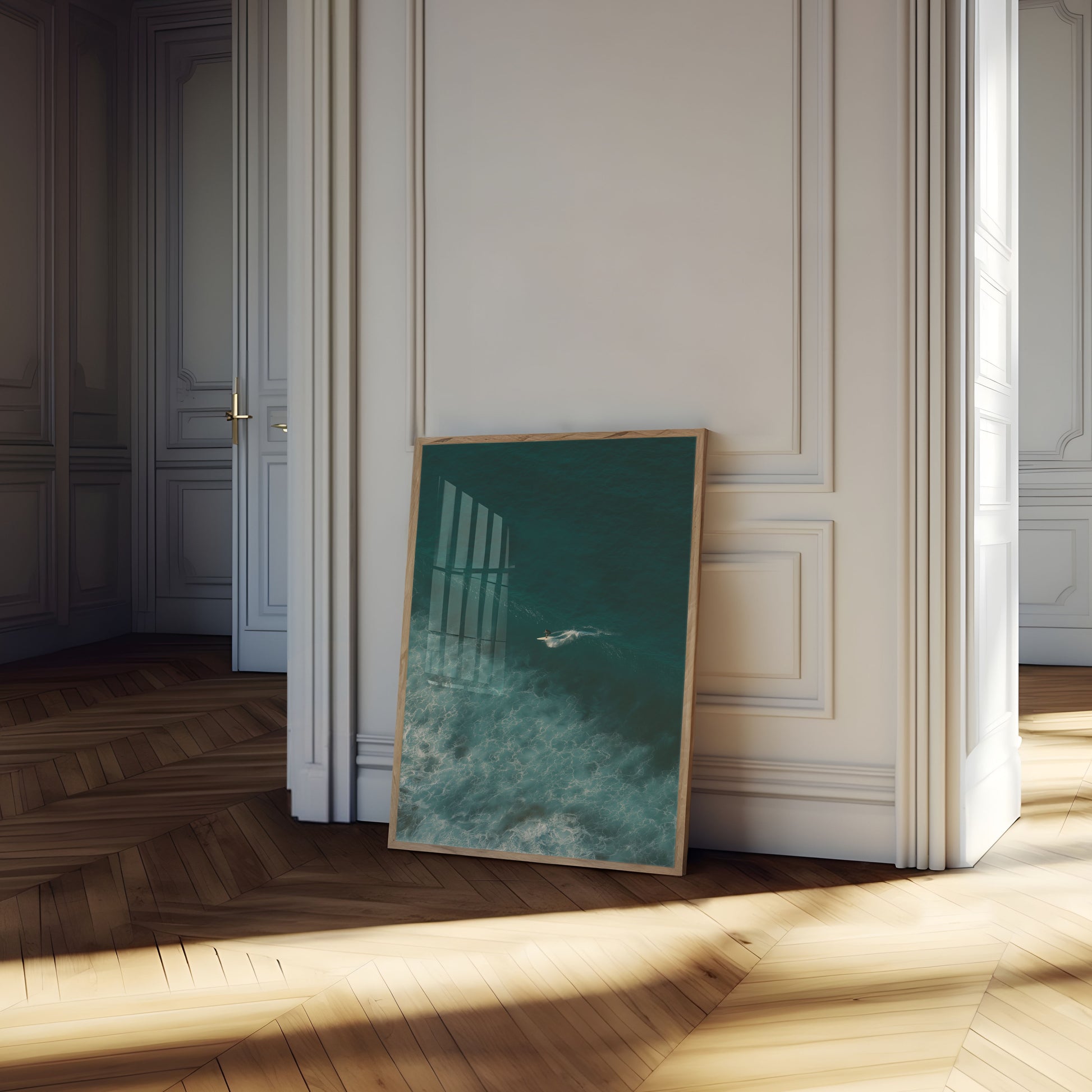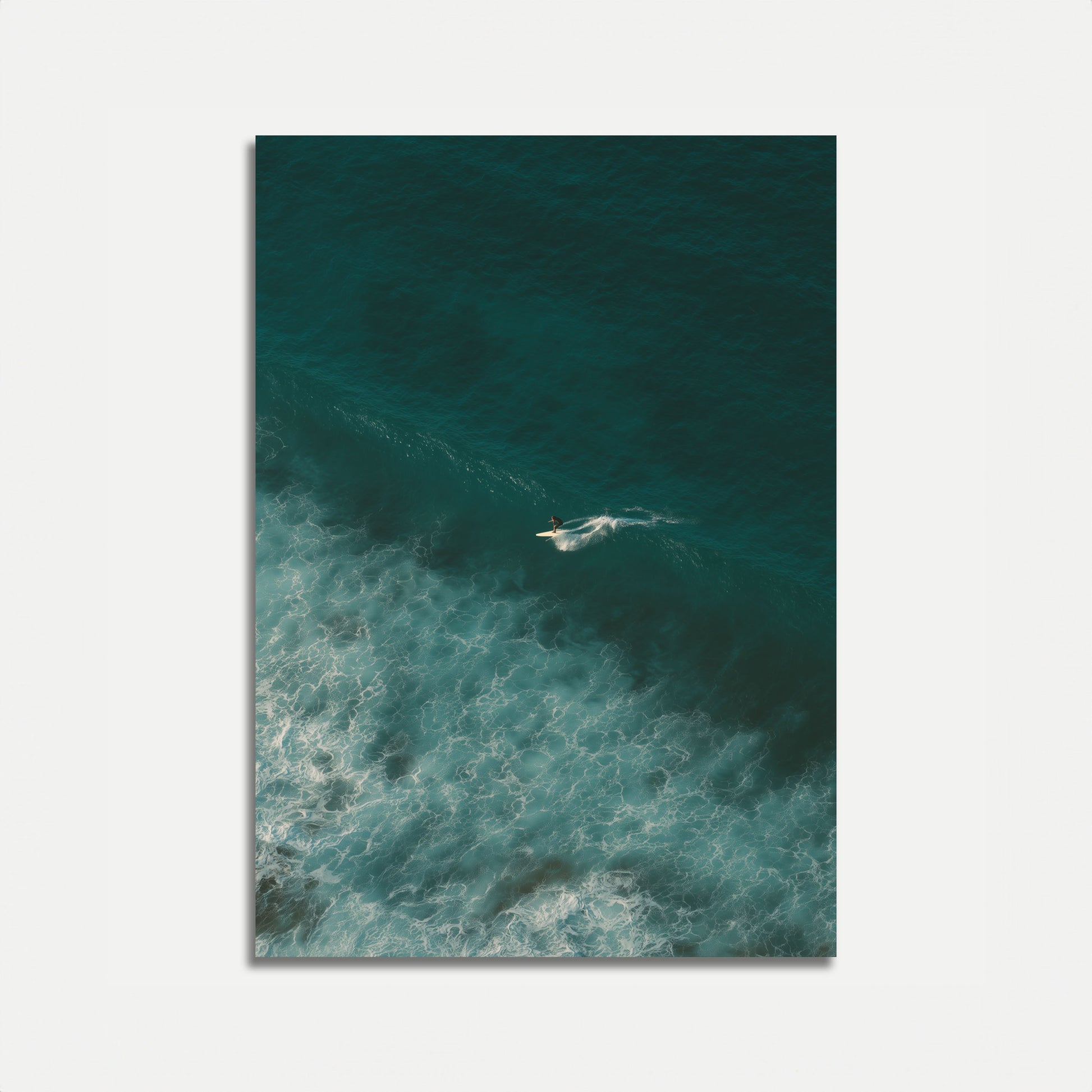 A mesmerizing aerial view captures a lone surfer gliding gracefully across a vast, deep teal ocean. The image reveals the raw power and stunning texture of the sea, with intricate white foam patterns contrasting against rich turquoise waters. This stunning surf photography transforms the ocean into an abstract canvas of motion and tranquility.