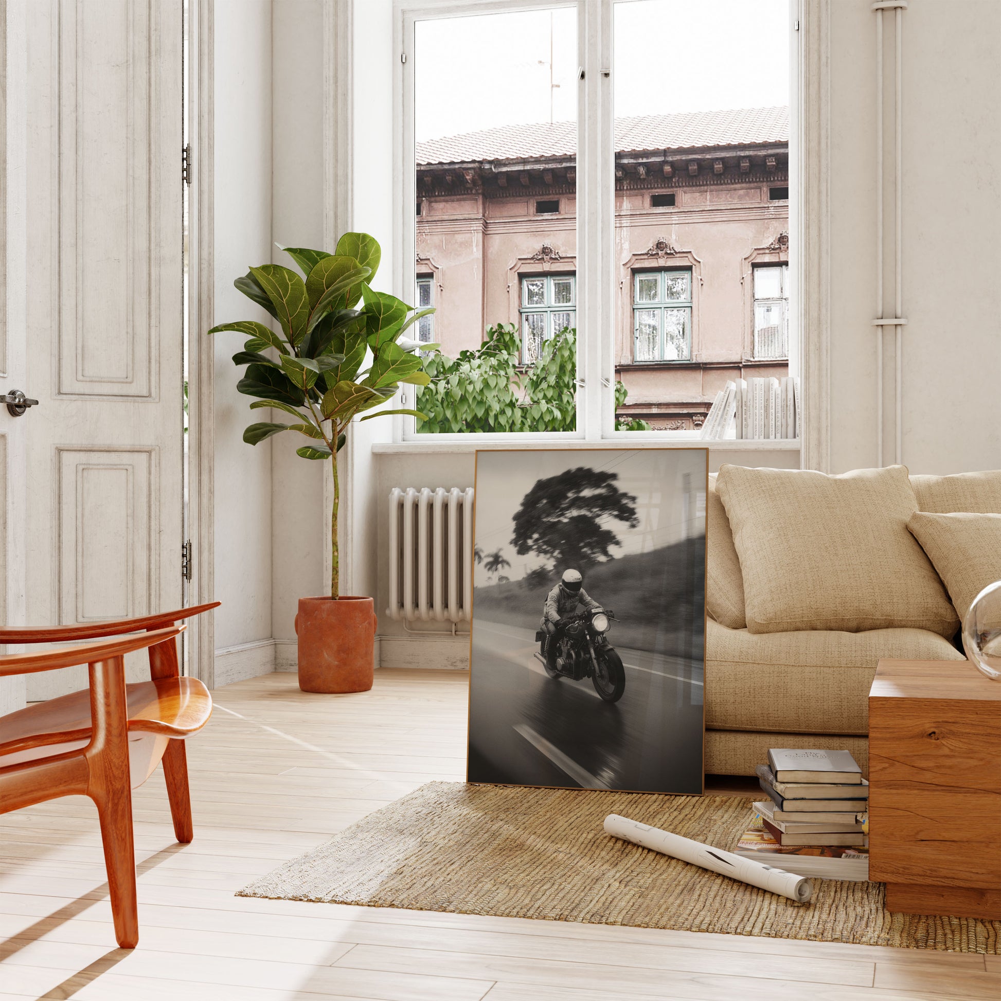 Capturez l'énergie brute de la culture moto avec ce cliché d'action saisissant en noir et blanc. Le mouvement flou et le paysage dramatique créent un sentiment de liberté et d'aventure, mettant en scène une moto classique filant à grande vitesse sur une route ouverte avec intensité et style.