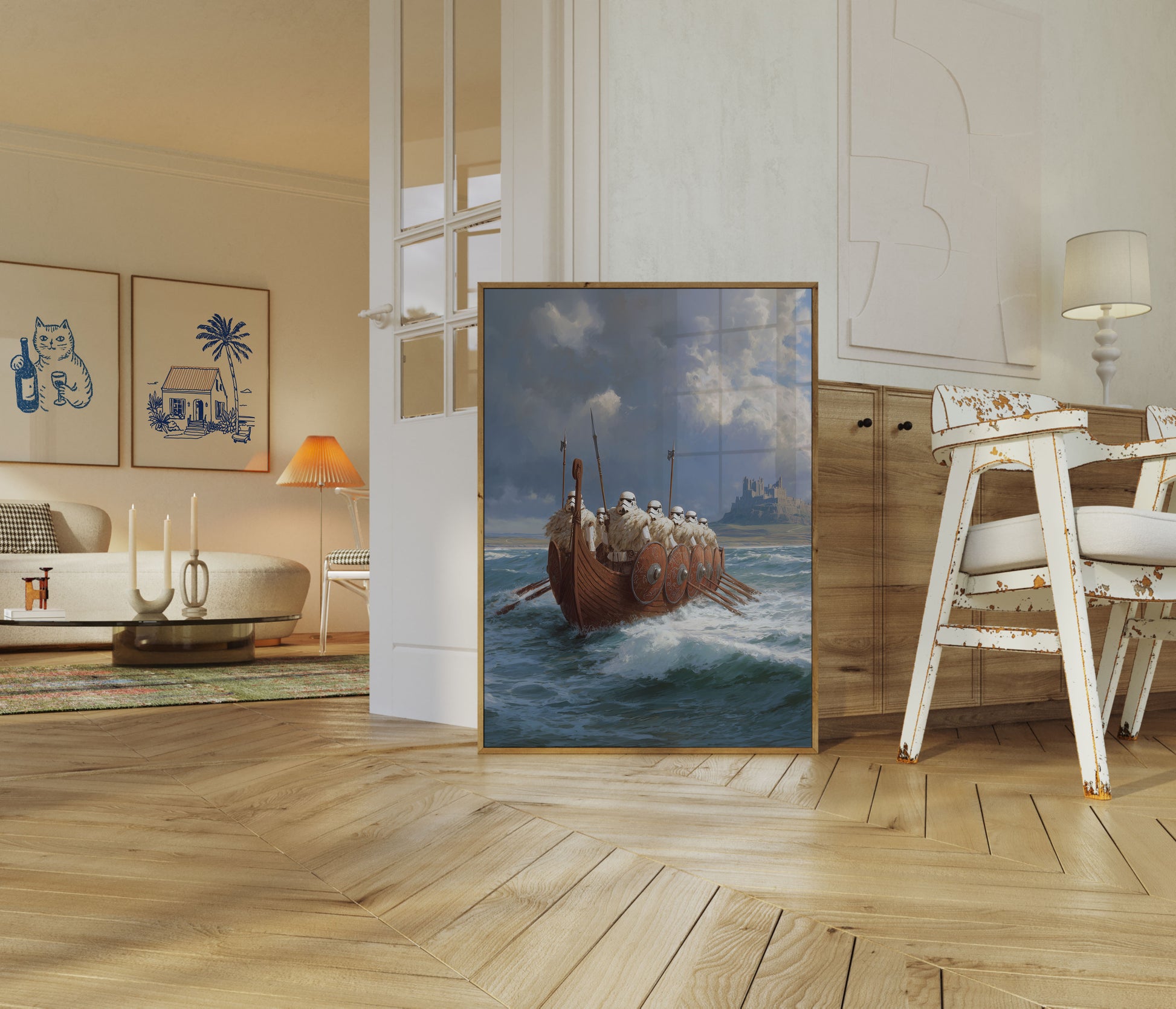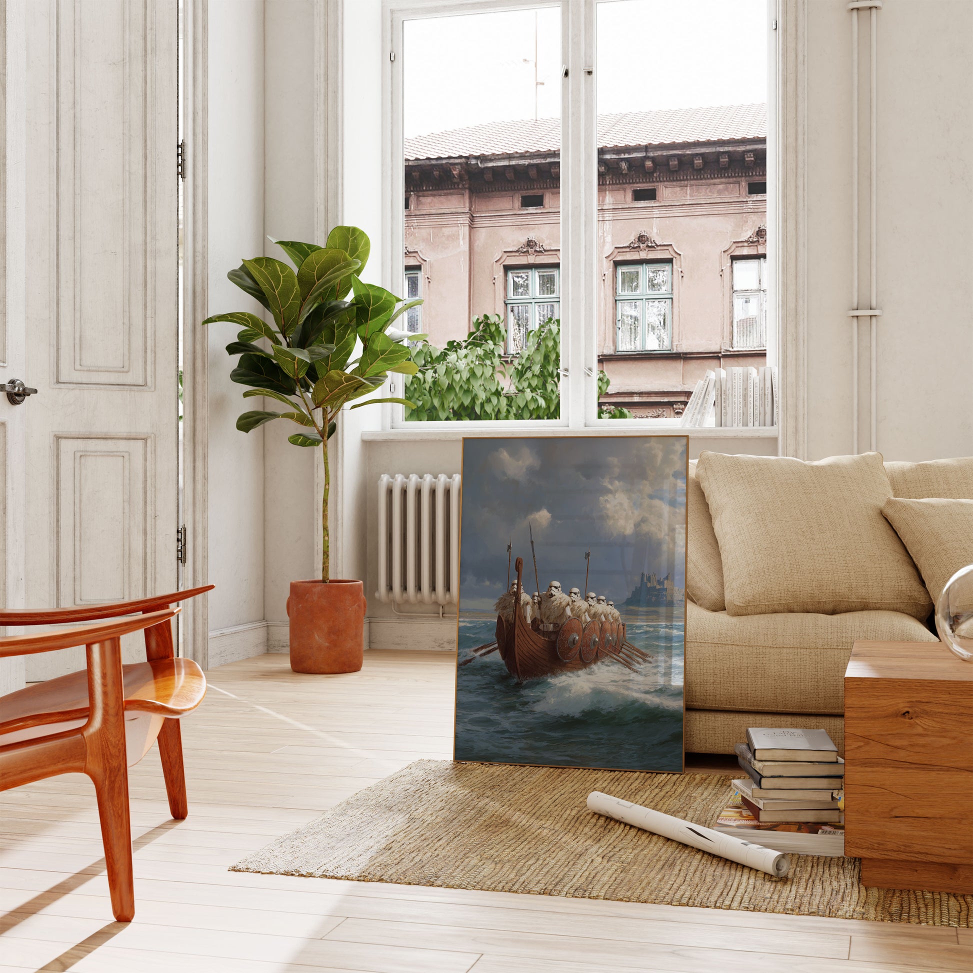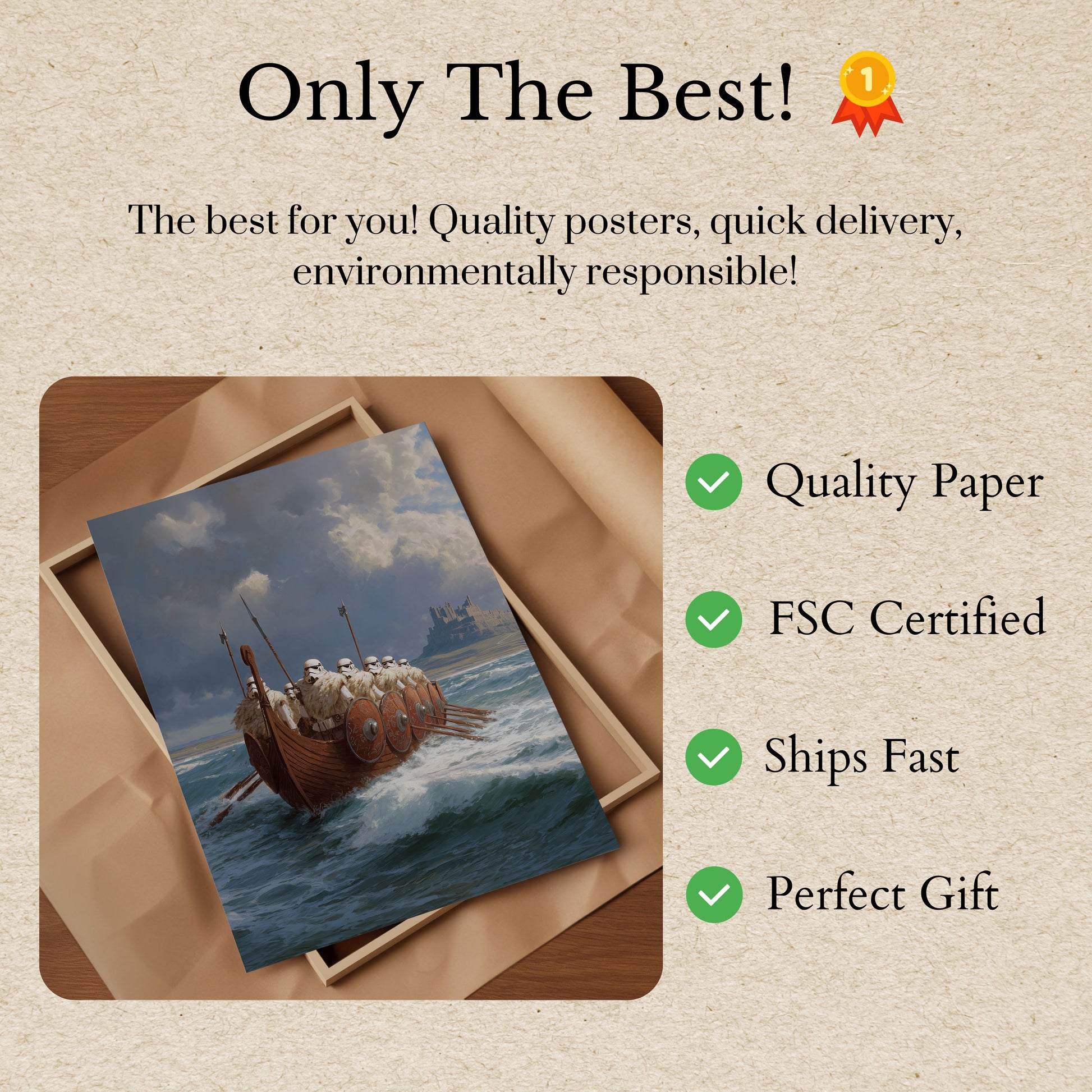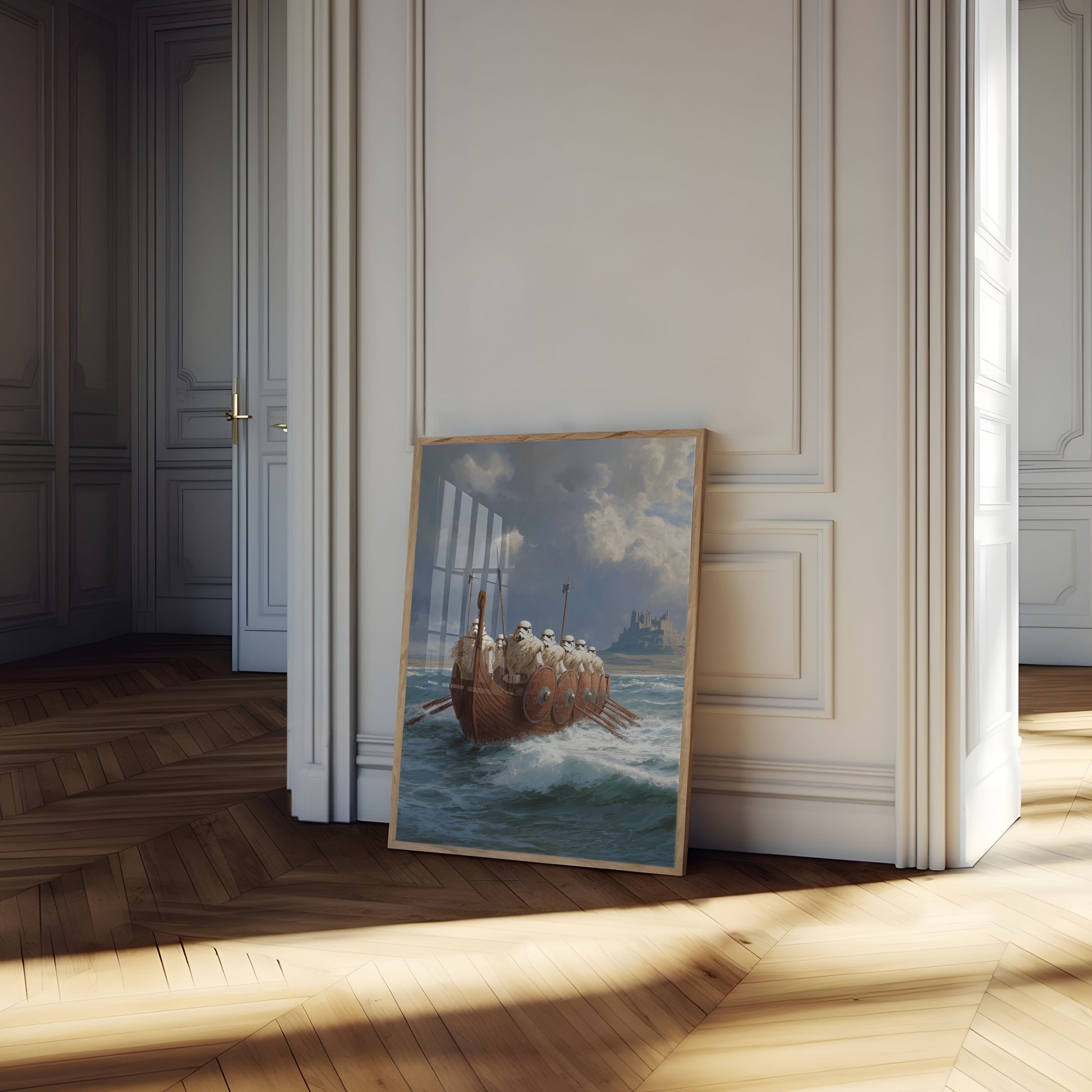 Embark on an epic maritime adventure where the Star Wars universe collides with Viking tradition! This stunning artwork captures a group of Stormtroopers sailing a classic wooden longship, adorned with fur and shields, cutting through turbulent waters toward a distant castle. The dramatic cloudy sky and churning sea create a powerful, cinematic atmosphere that blends sci-fi and historical fantasy in a single breathtaking scene.