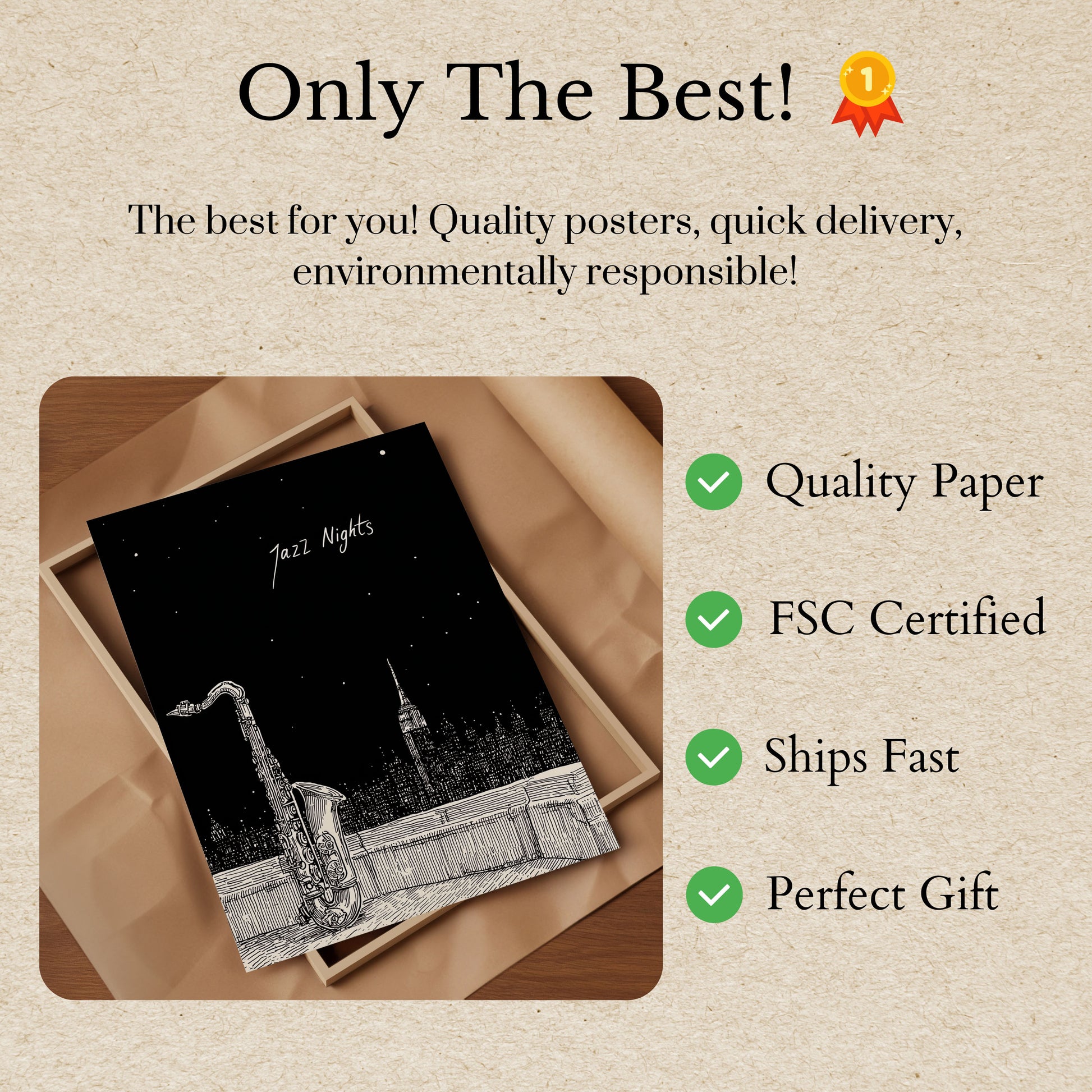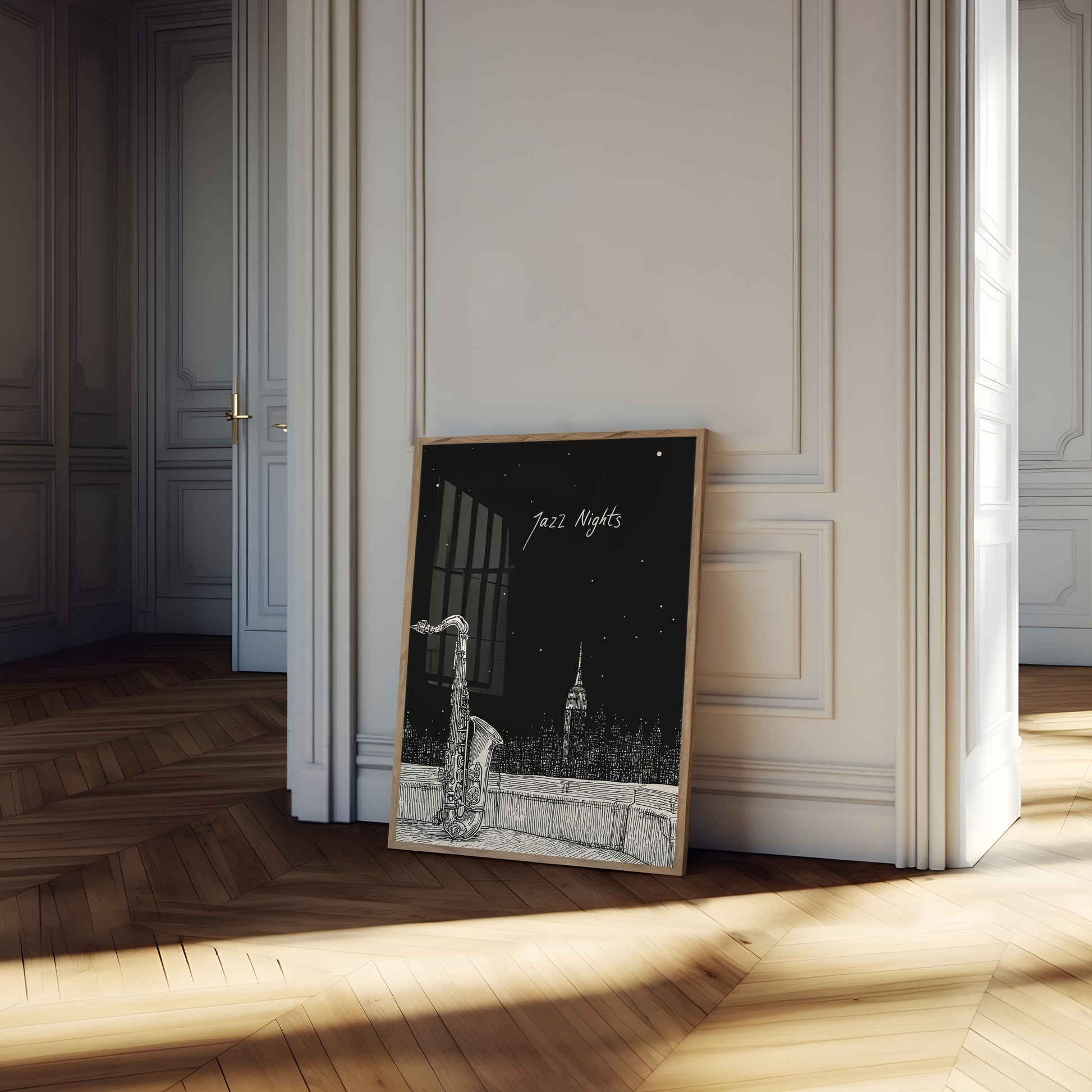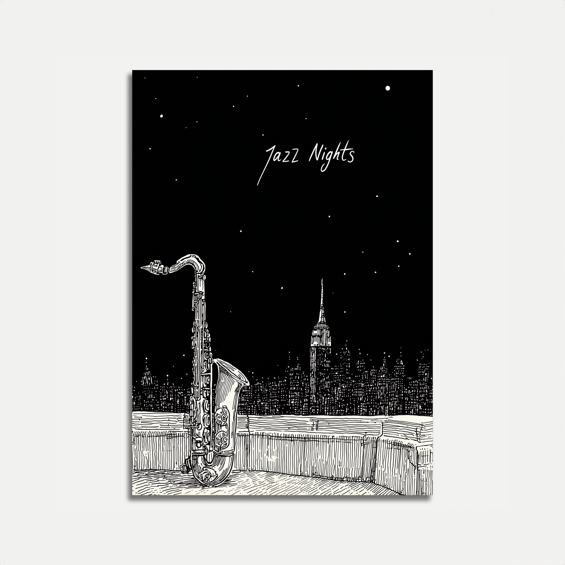 Immerse yourself in the cool, nocturnal vibes of this stunning Jazz Nights poster featuring a vintage saxophone against the iconic New York City skyline. The intricate black and white illustration captures the magical essence of late-night jazz, with twinkling stars and the Empire State Building creating a mesmerizing urban landscape that speaks to music lovers and city dreamers alike. This artistic print transforms the soulful spirit of jazz into a visual symphony of urban poetry.