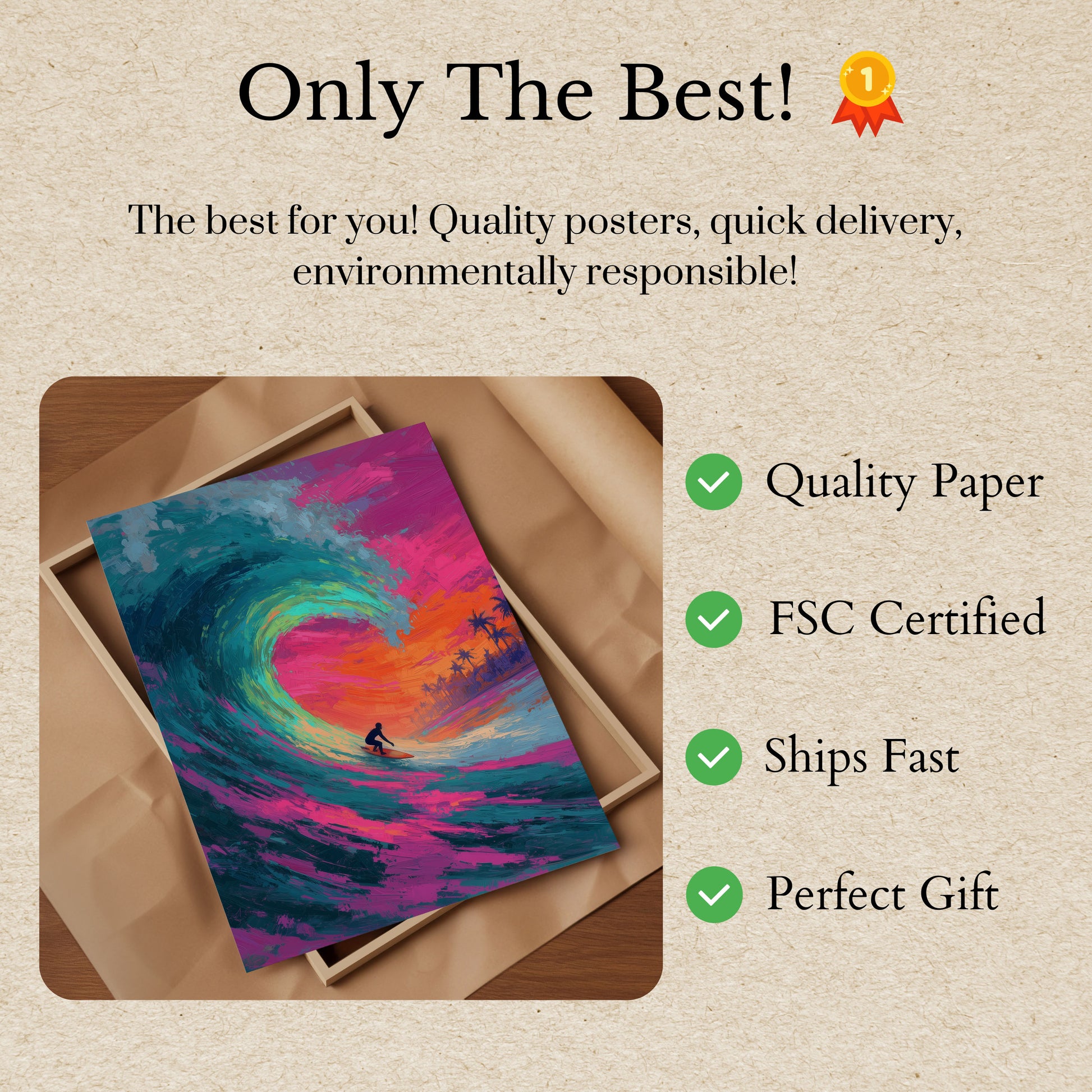Dive into an explosion of color with this mesmerizing surfing artwork that captures the raw energy of a massive ocean wave. The dynamic painting blends vibrant turquoise, hot pink, and brilliant orange hues, creating a stunning visual journey of a surfer riding a powerful wave against a tropical palm-lined sunset. This electrifying piece transforms the classic surf scene into a breathtaking explosion of artistic expression and maritime passion.