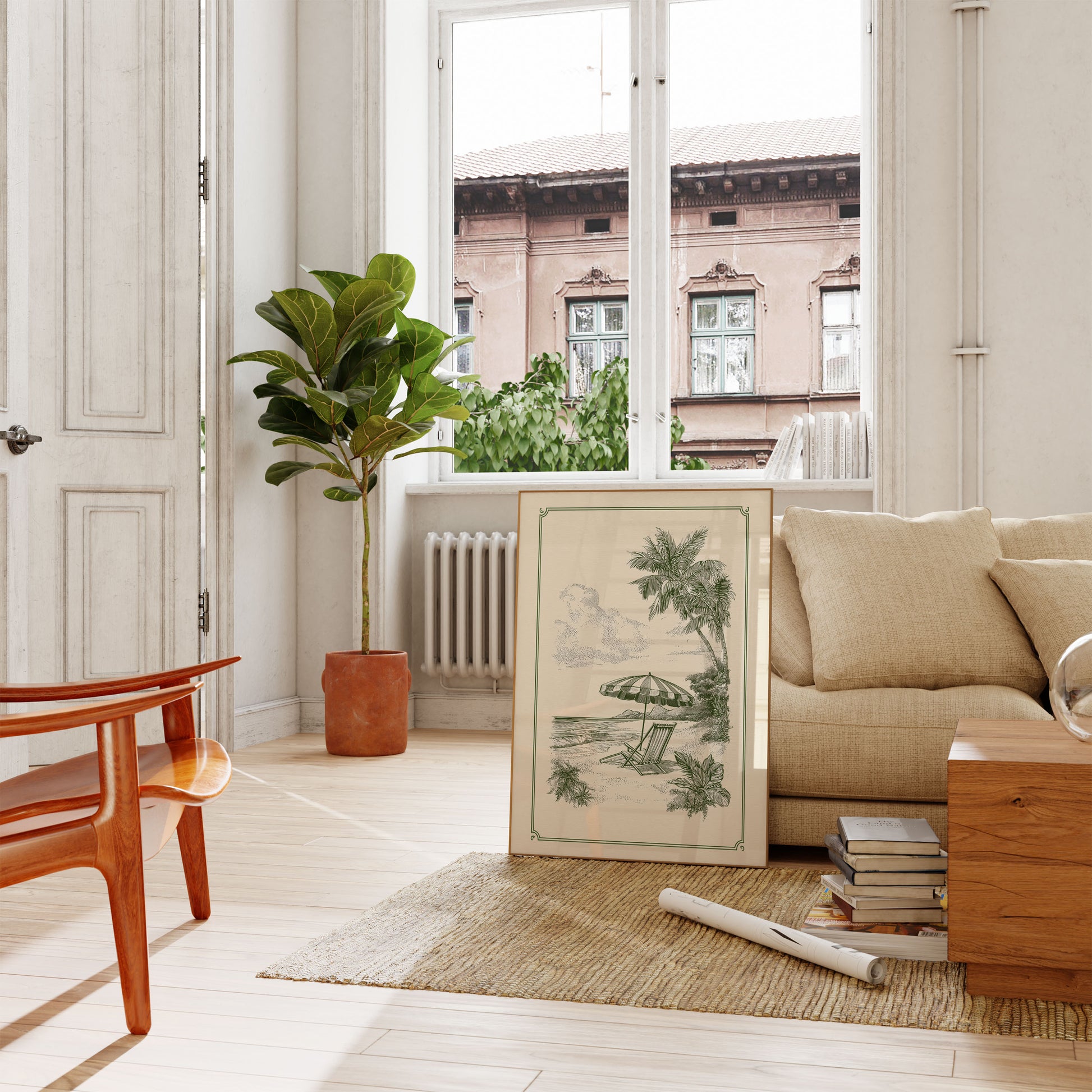 Immerse yourself in this serene vintage-style beach illustration that captures the essence of a perfect surfing getaway. Elegantly drawn in classic green tones, the poster features a tranquil coastal scene with palm trees, a relaxing beach chair, and an inviting parasol overlooking gentle ocean waves. The intricate line work and nostalgic design transport you to a peaceful tropical paradise that celebrates the laid-back surf lifestyle.