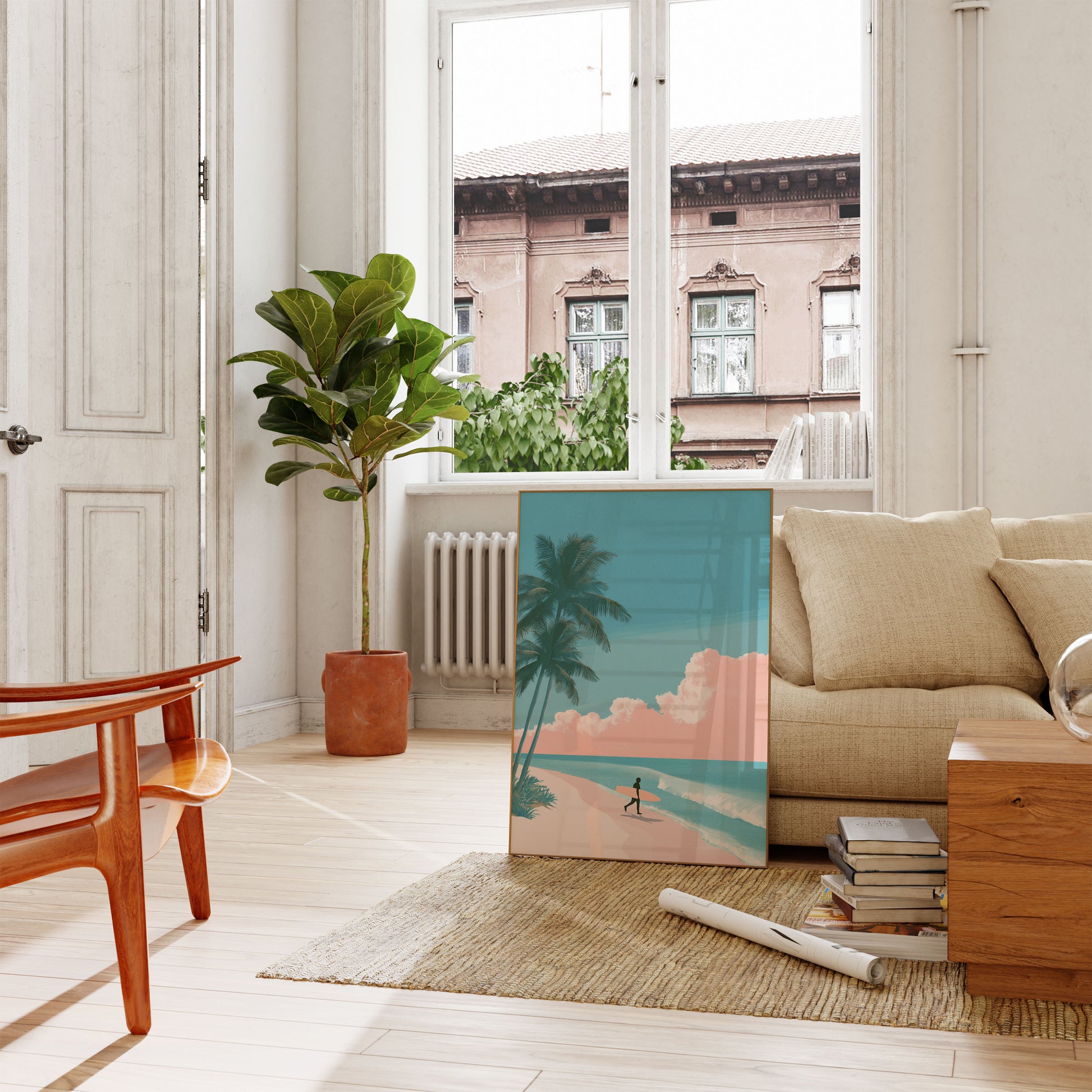 Escape into a dreamy coastal landscape where soft pink clouds dance above turquoise waves and elegant palm trees frame a solitary surfer's journey. This serene illustration captures the tranquil essence of a perfect beach day, blending minimalist design with soothing pastel colors that transport you to a peaceful seaside moment.