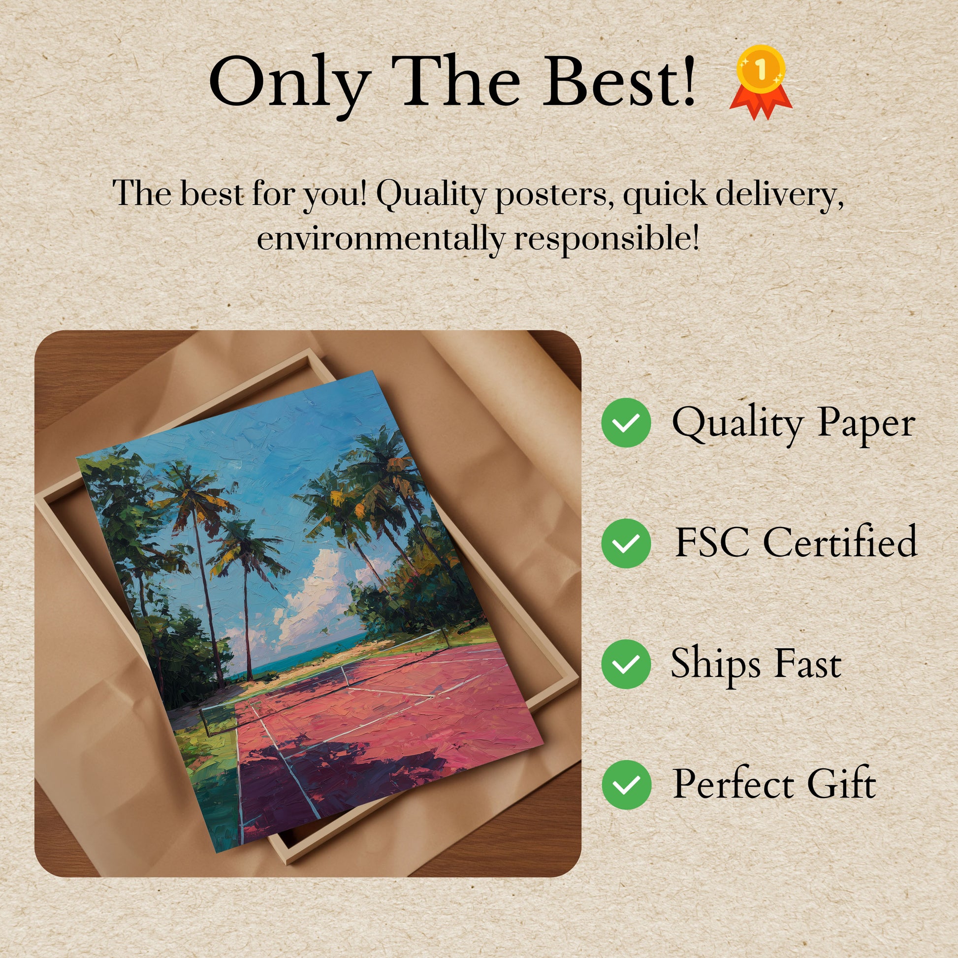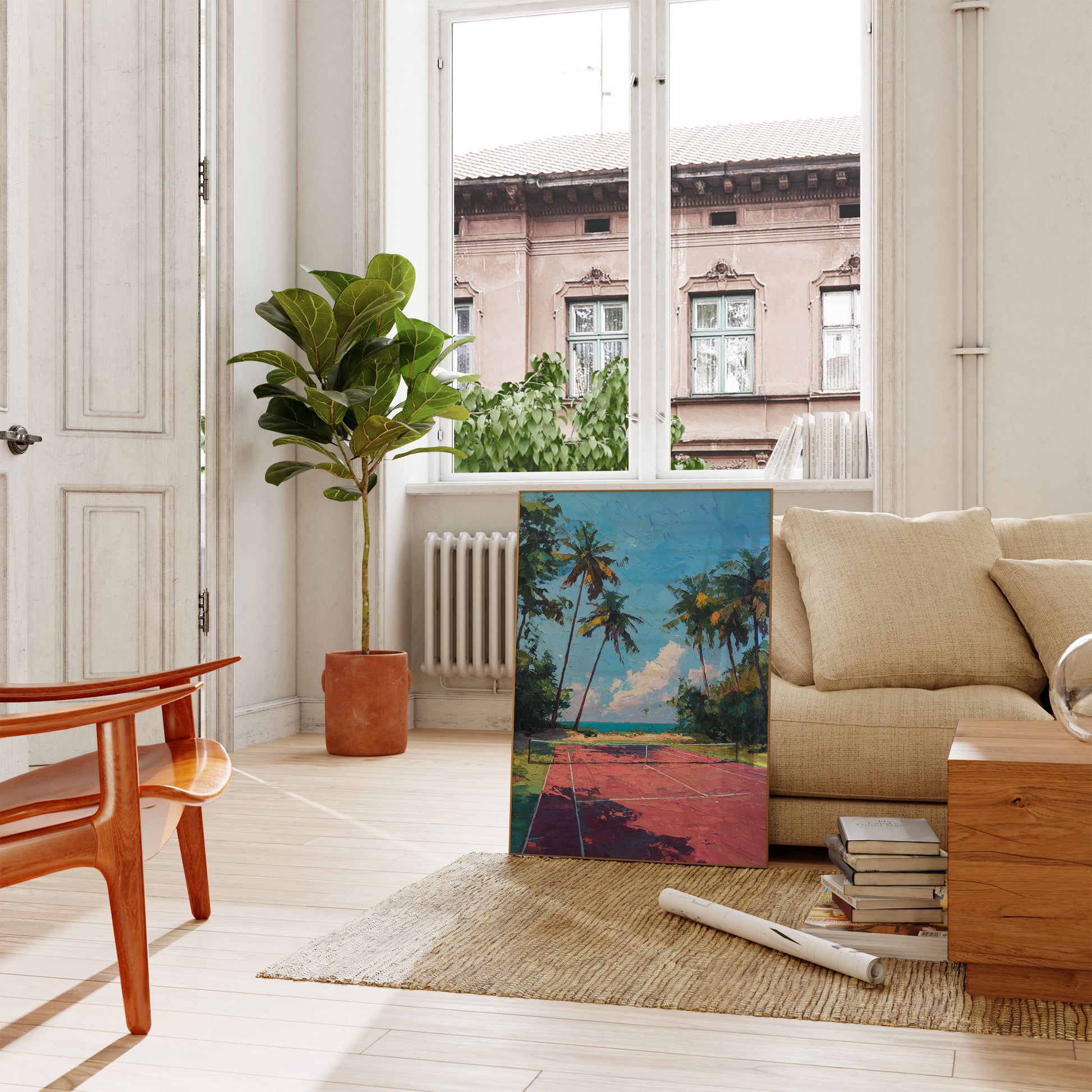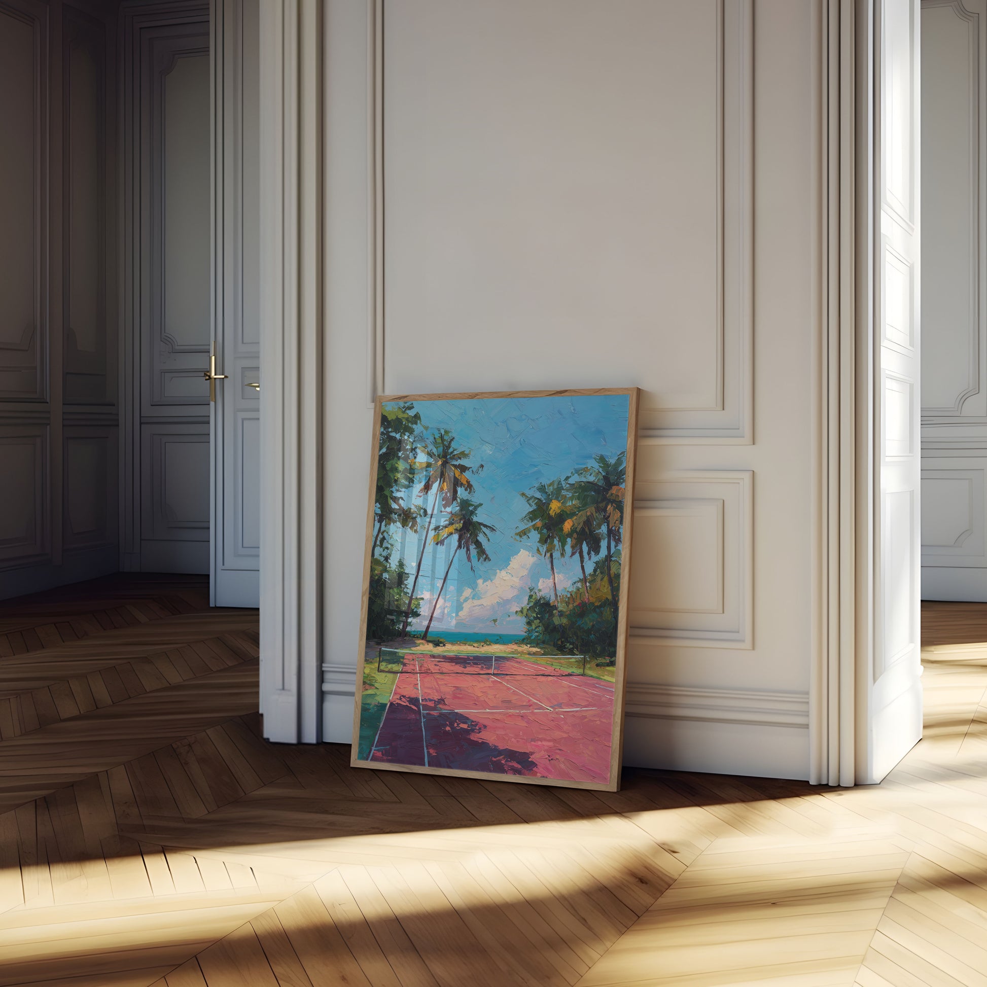 Escape to a sun-drenched tennis court nestled between swaying palm trees and turquoise waters with this vibrant tropical landscape painting. The bold red court contrasts beautifully against the lush green foliage and brilliant blue sky, creating a mesmerizing scene that captures the perfect blend of sport and paradise. Rendered in expressive brushstrokes, this artwork transports you to a dreamy coastal tennis haven where nature and recreation harmoniously meet.